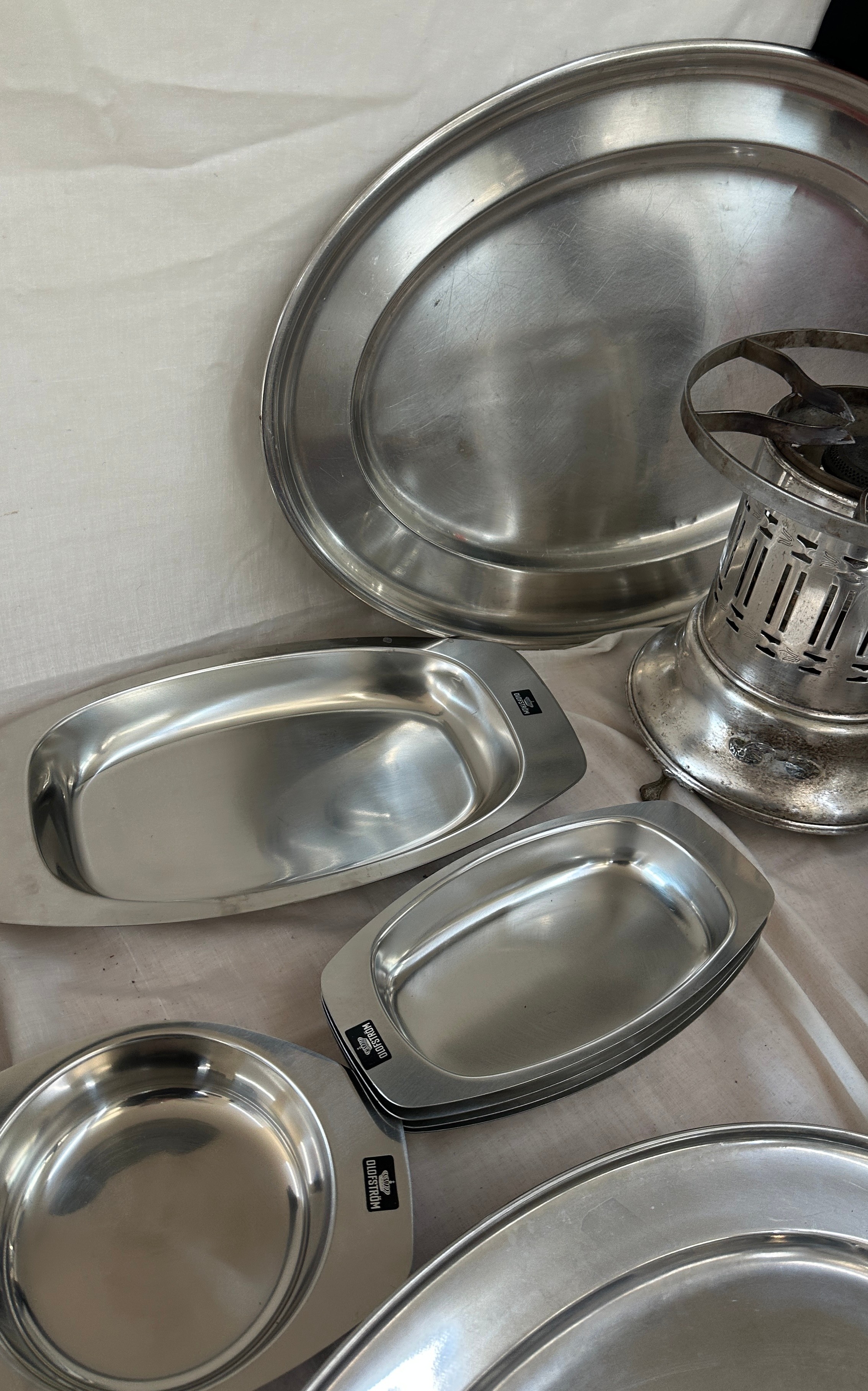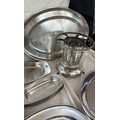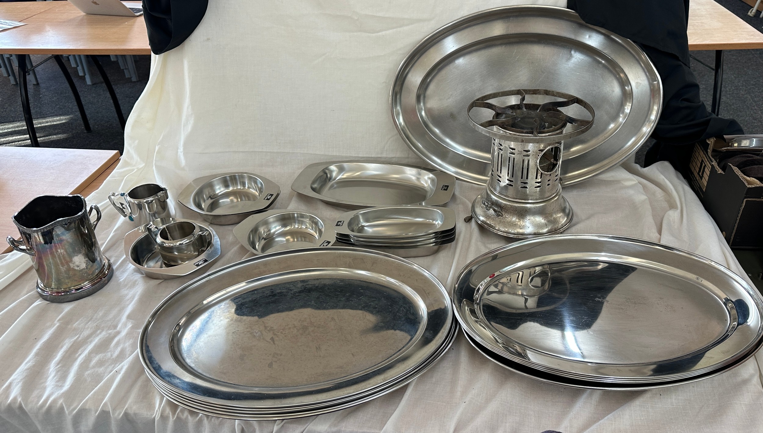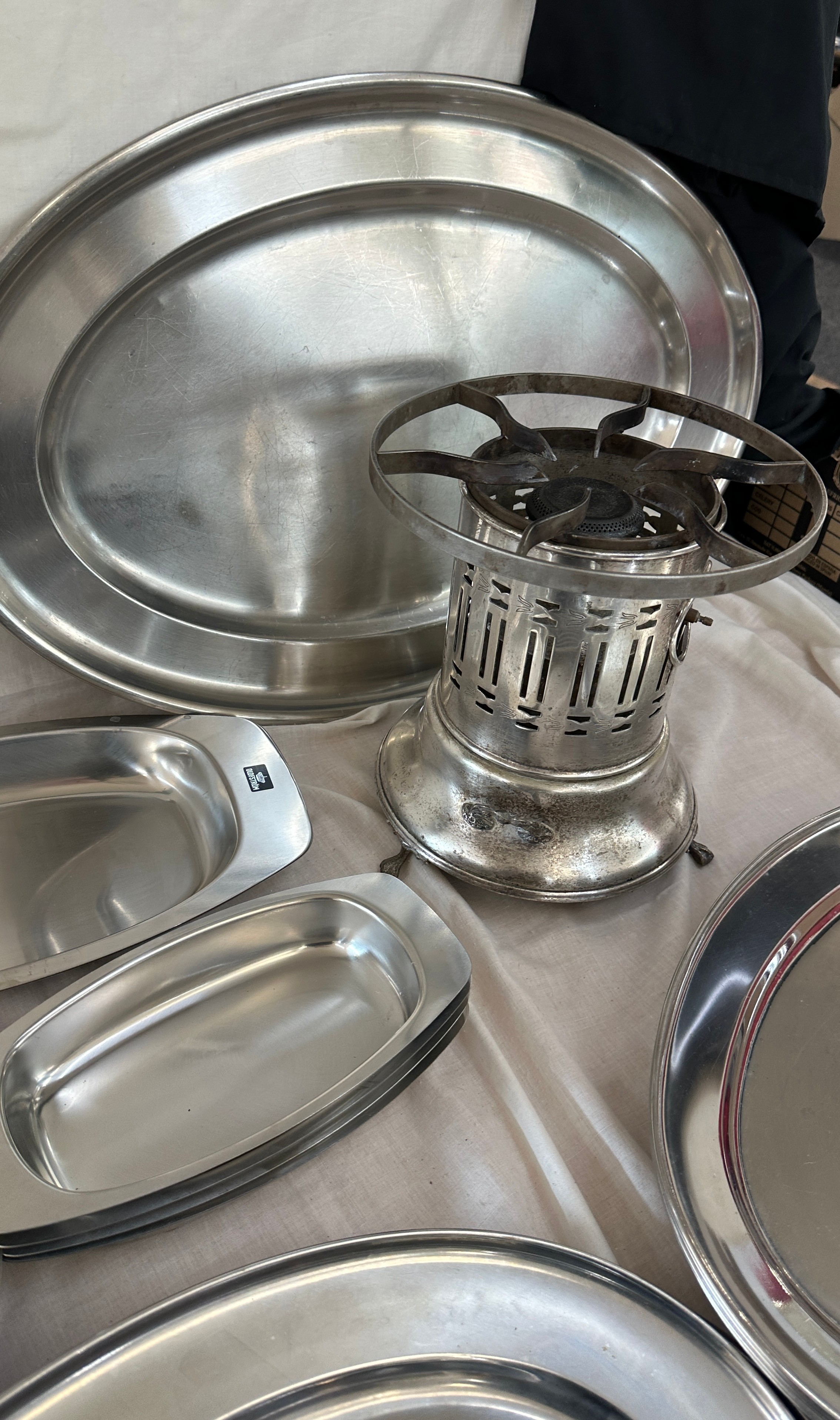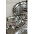 Selection of metalware items to include stainless steel meat trays, a metal fondue stove etc