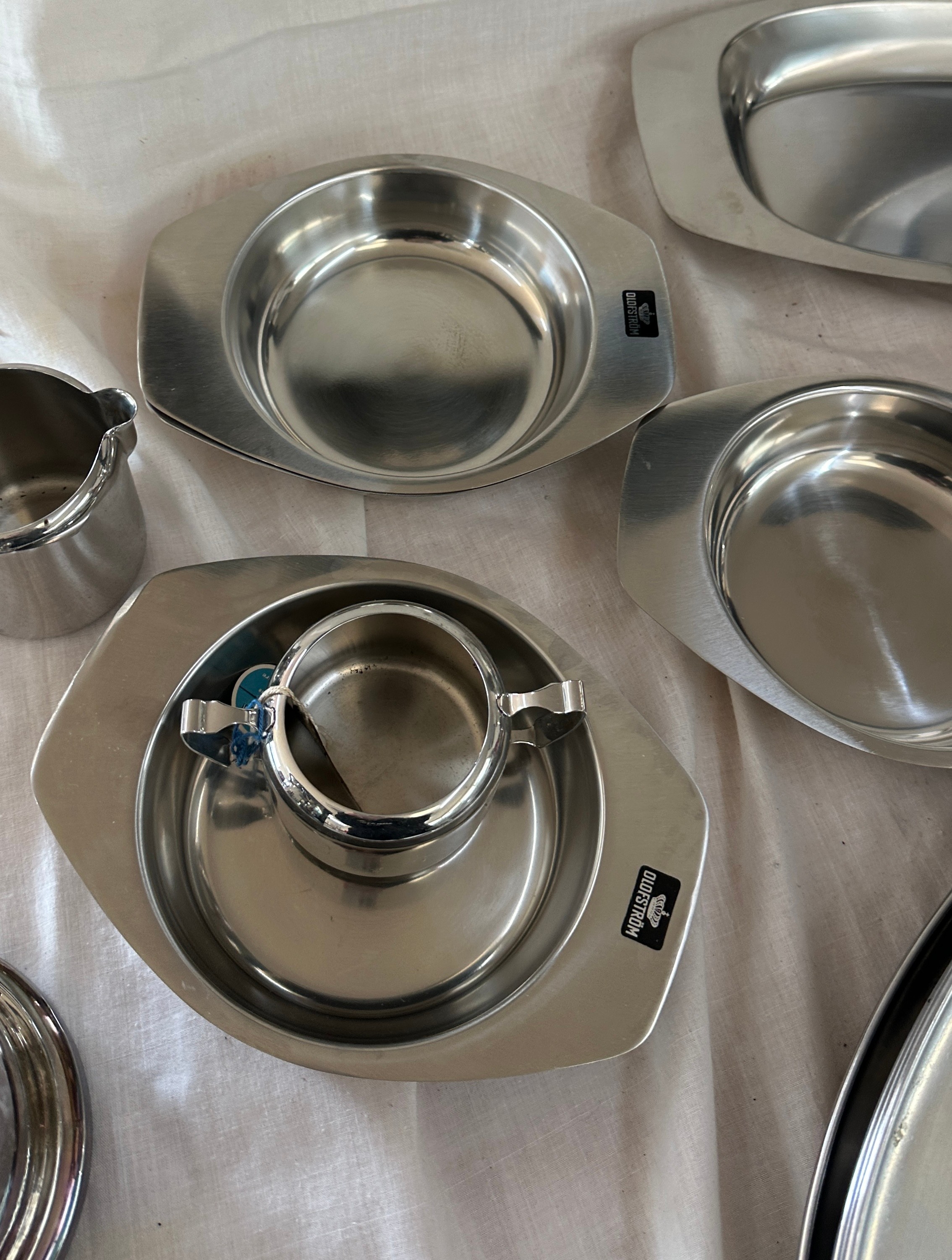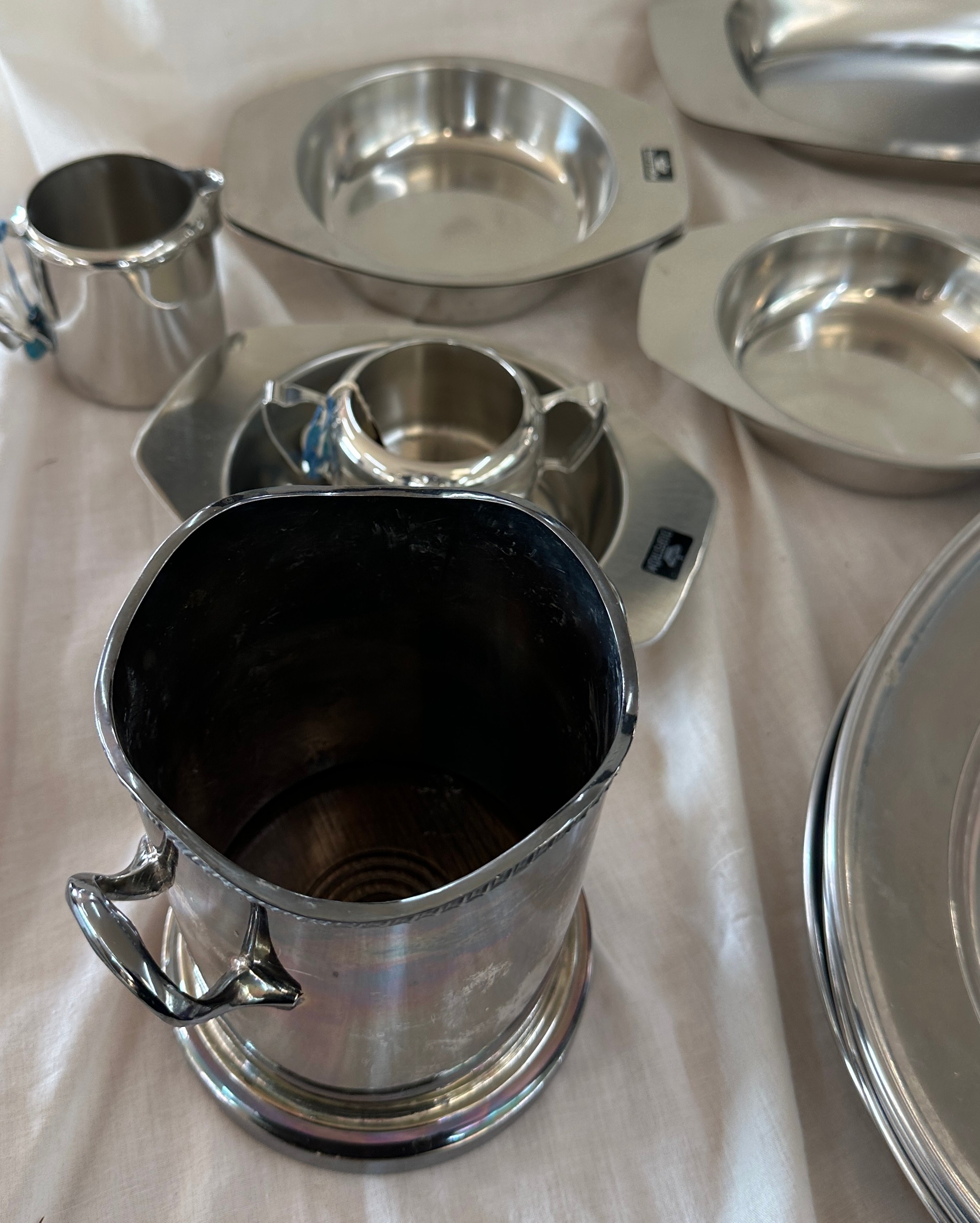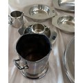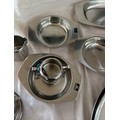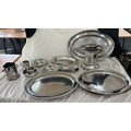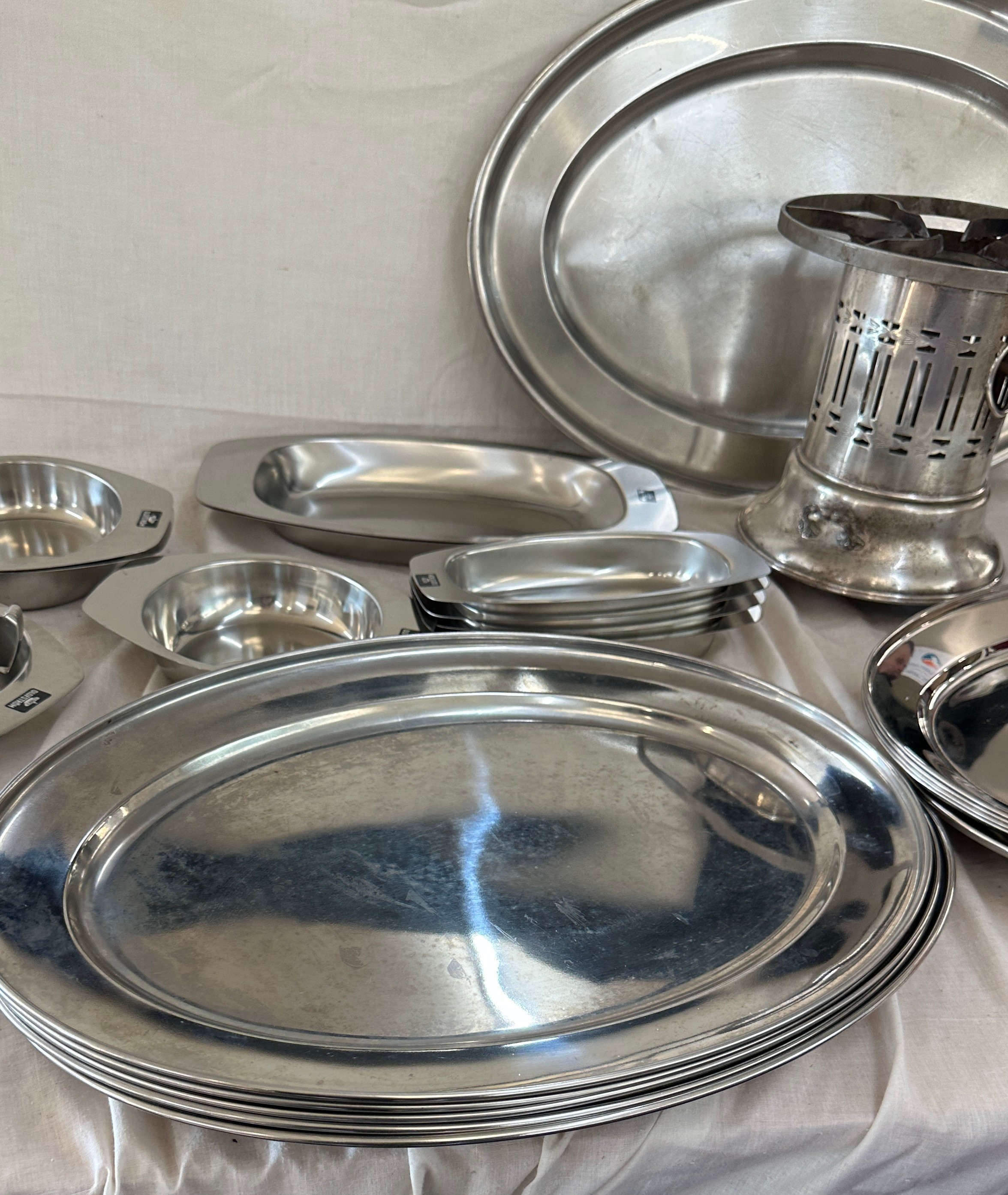Selection of metalware items to include stainless steel meat trays, a metal fondue stove etc