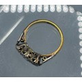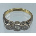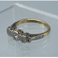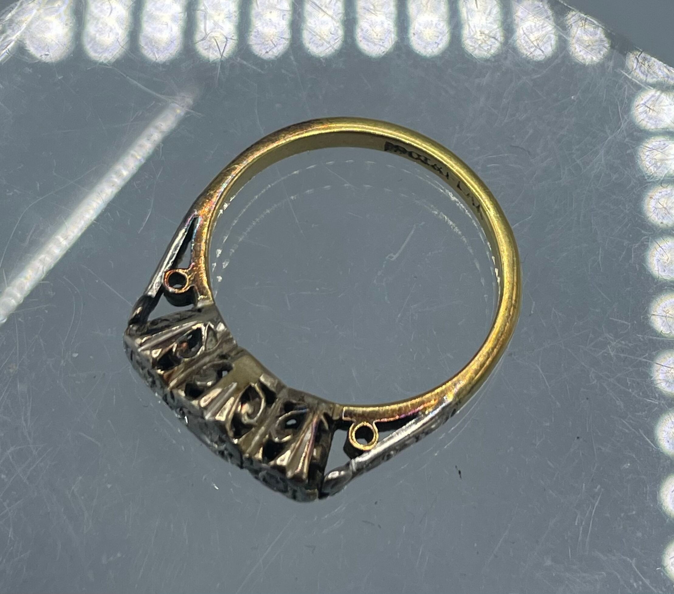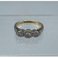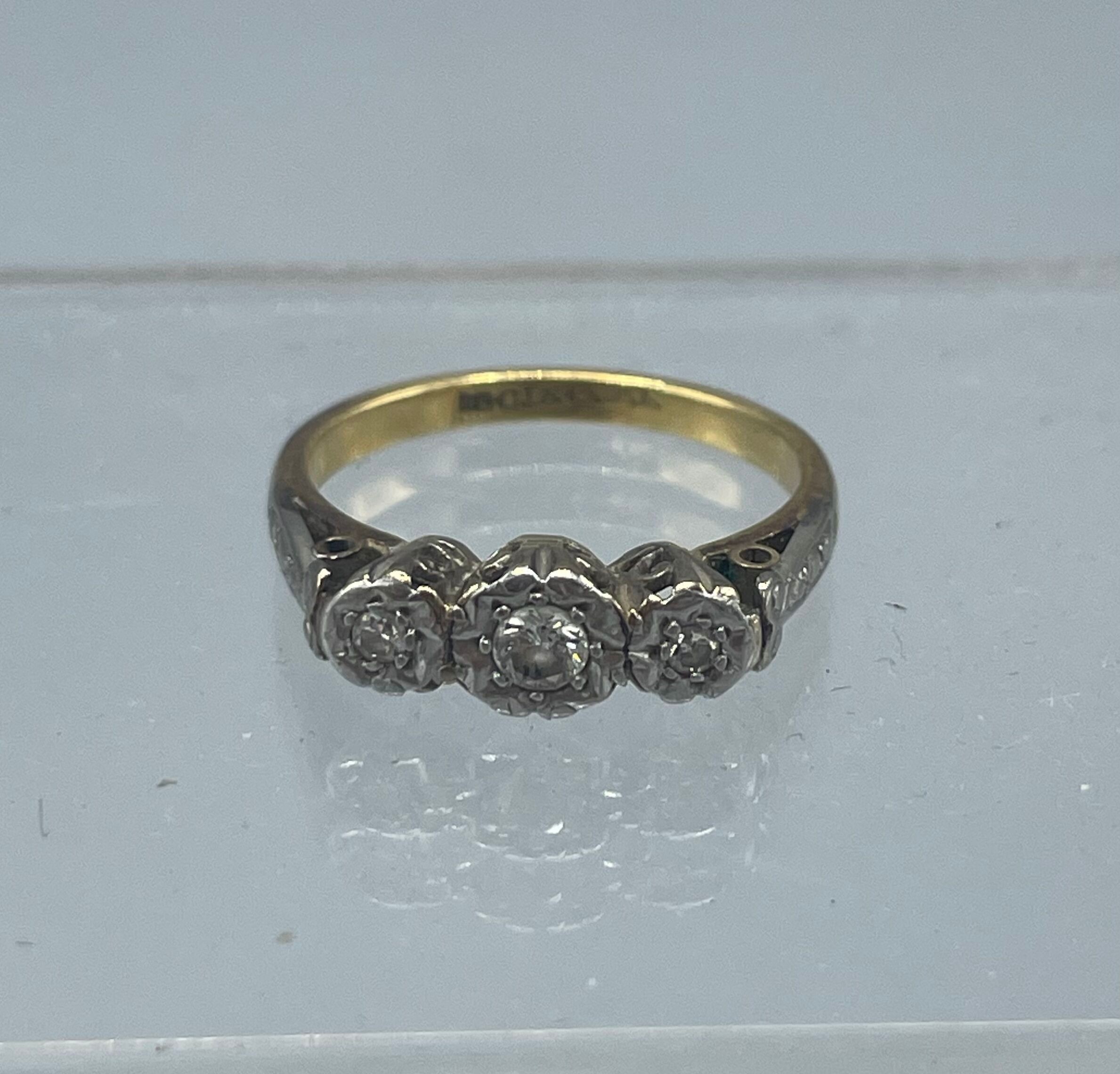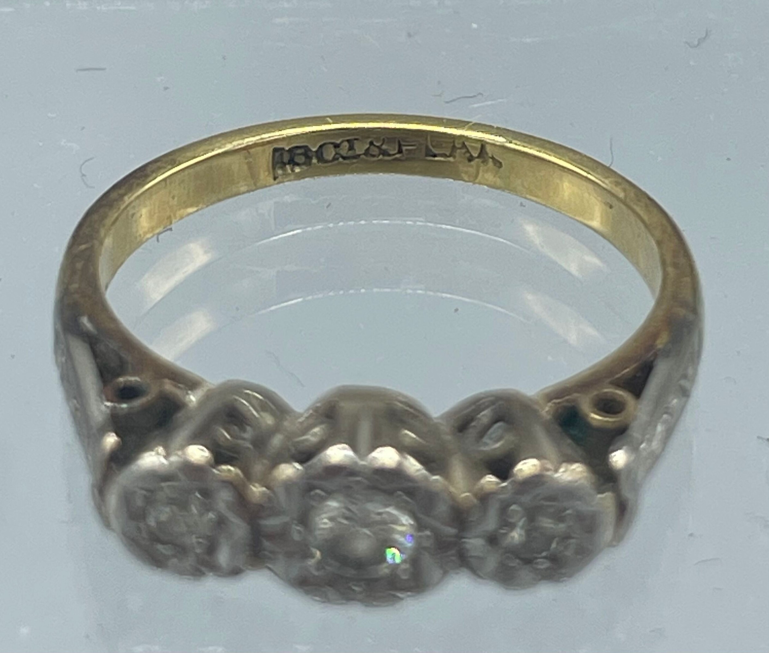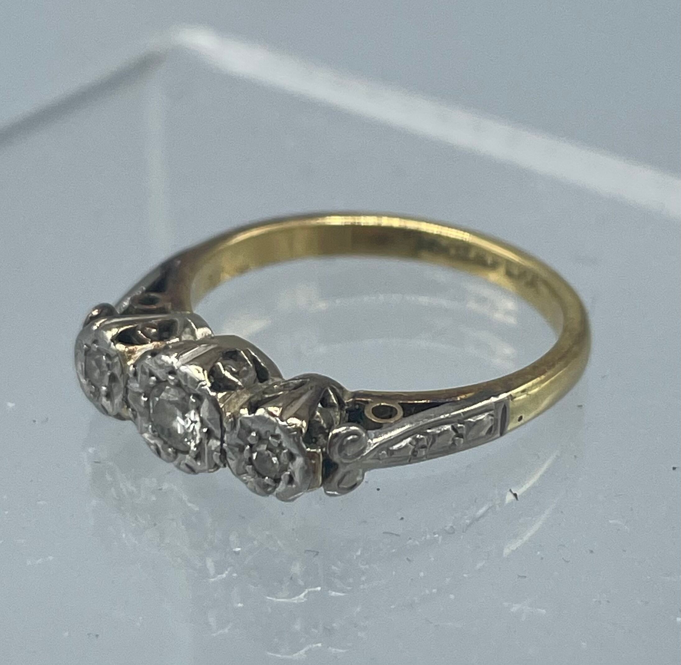 18ct yellow gold and platinum three stone old cut diamond ring in illusion setting, stamped 18ct & PLAT, size K, 3.4g