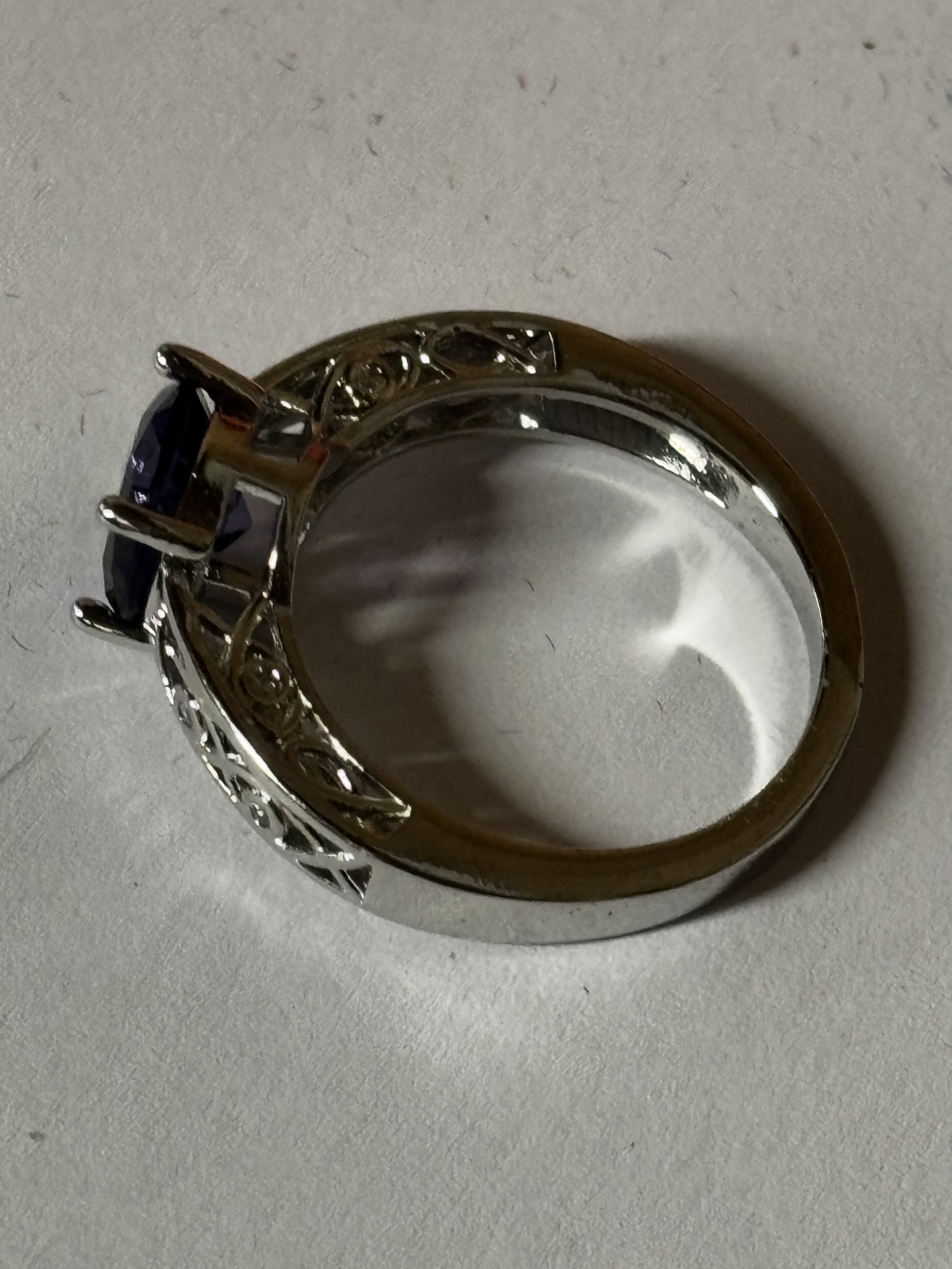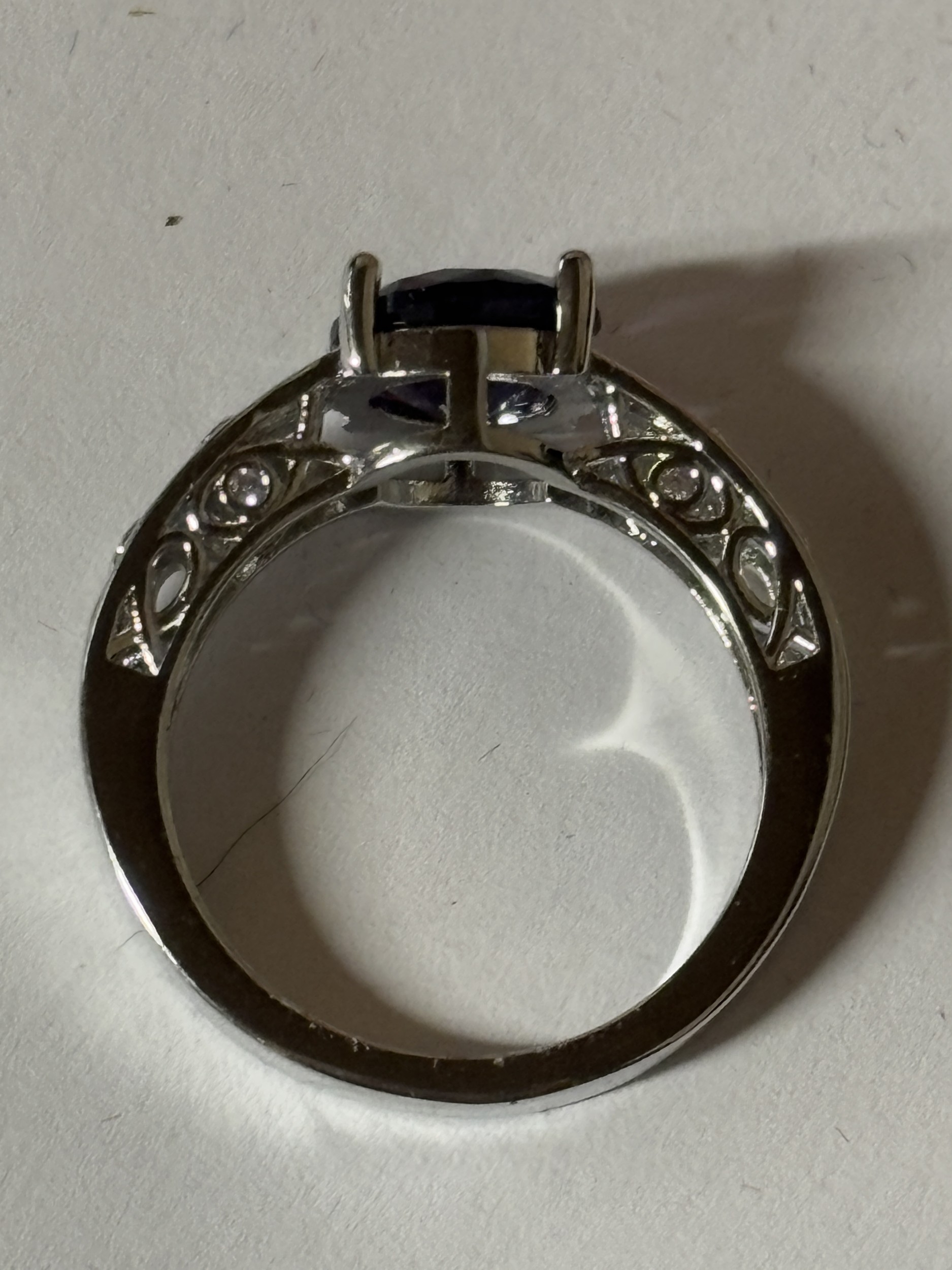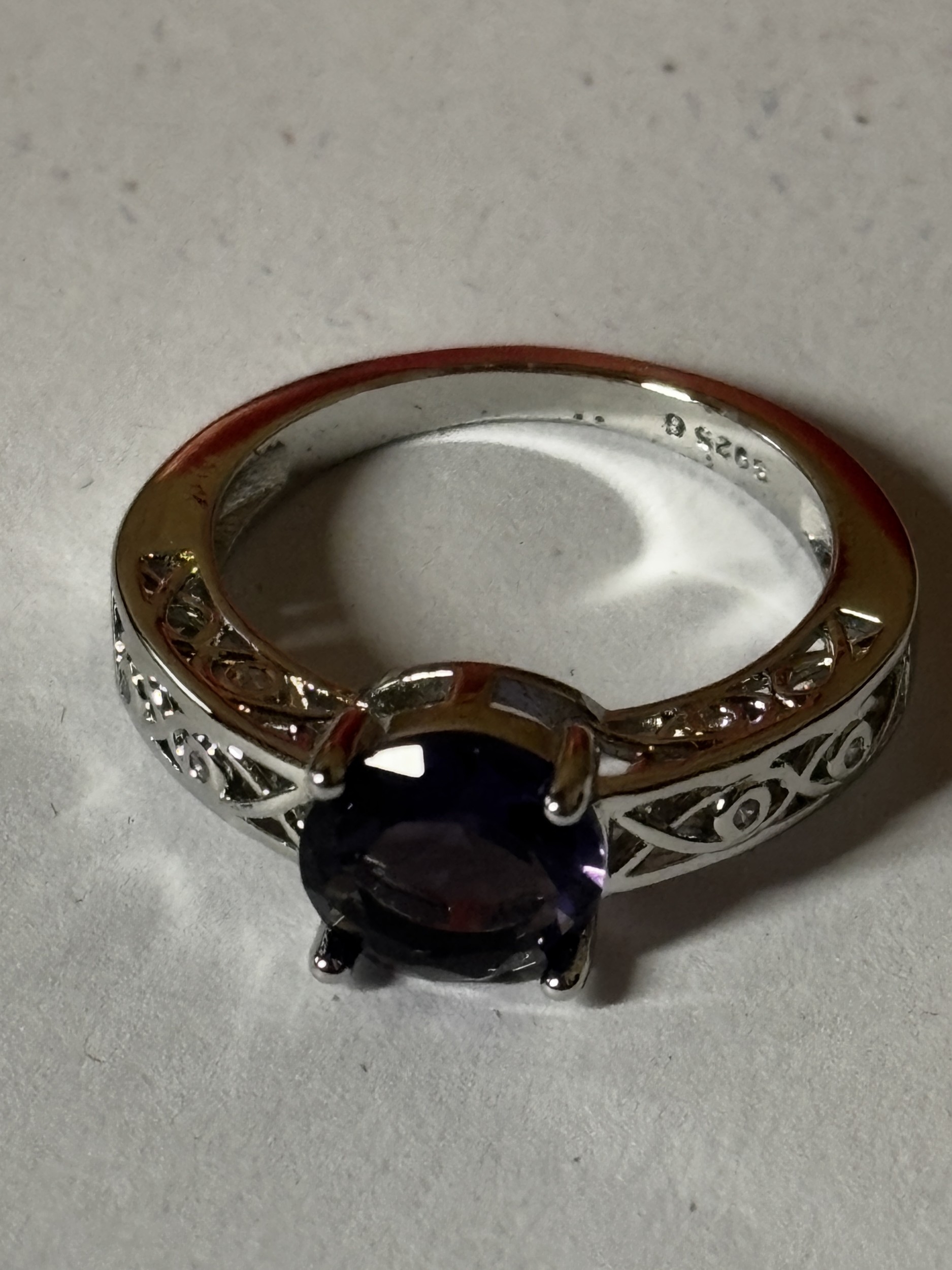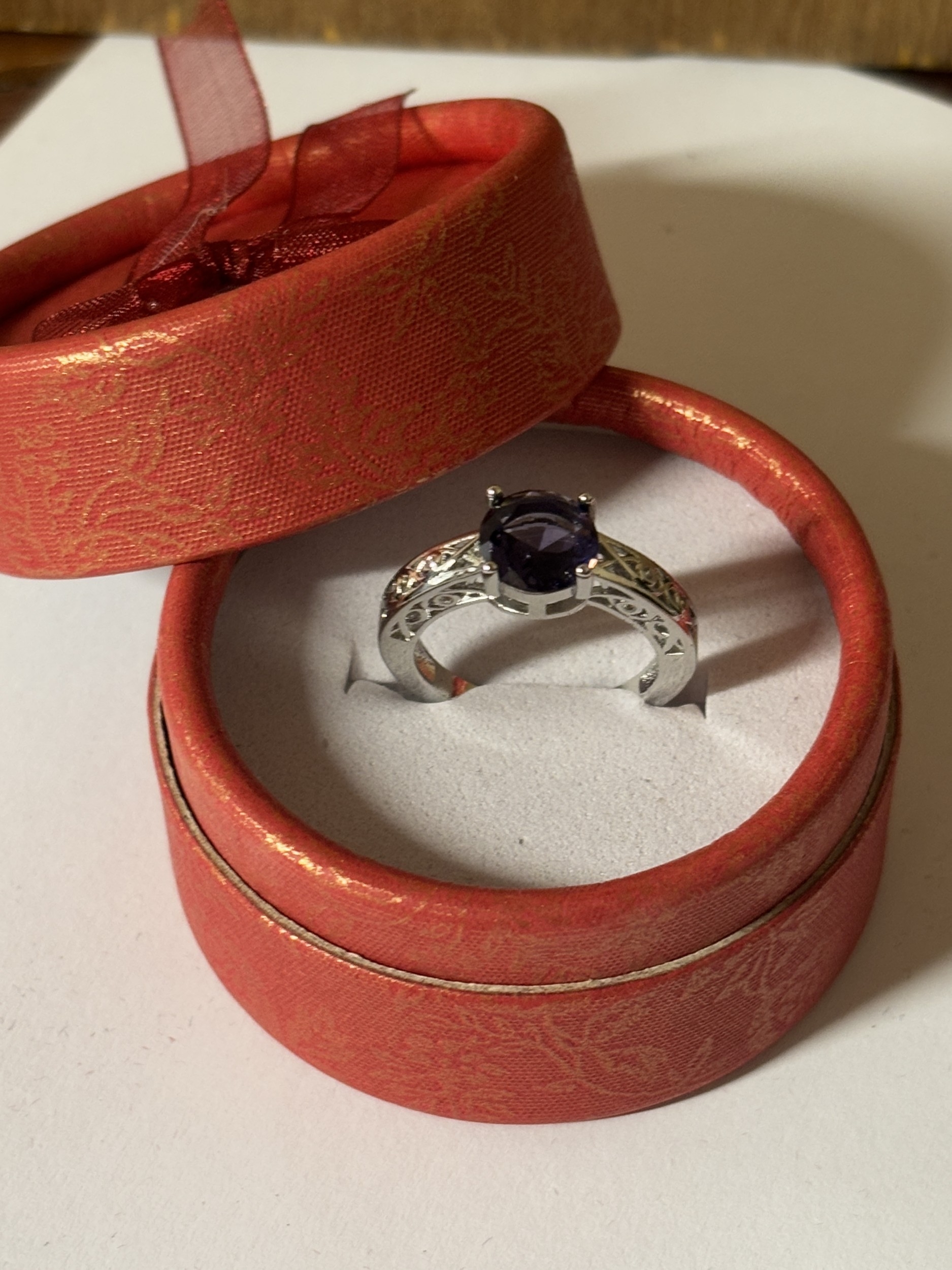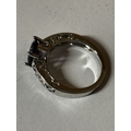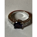 A MARKED 925 PURPLE STONE AND CUBIC ZIRCONIA RING SIZE N IN A PRESENTATION BOX