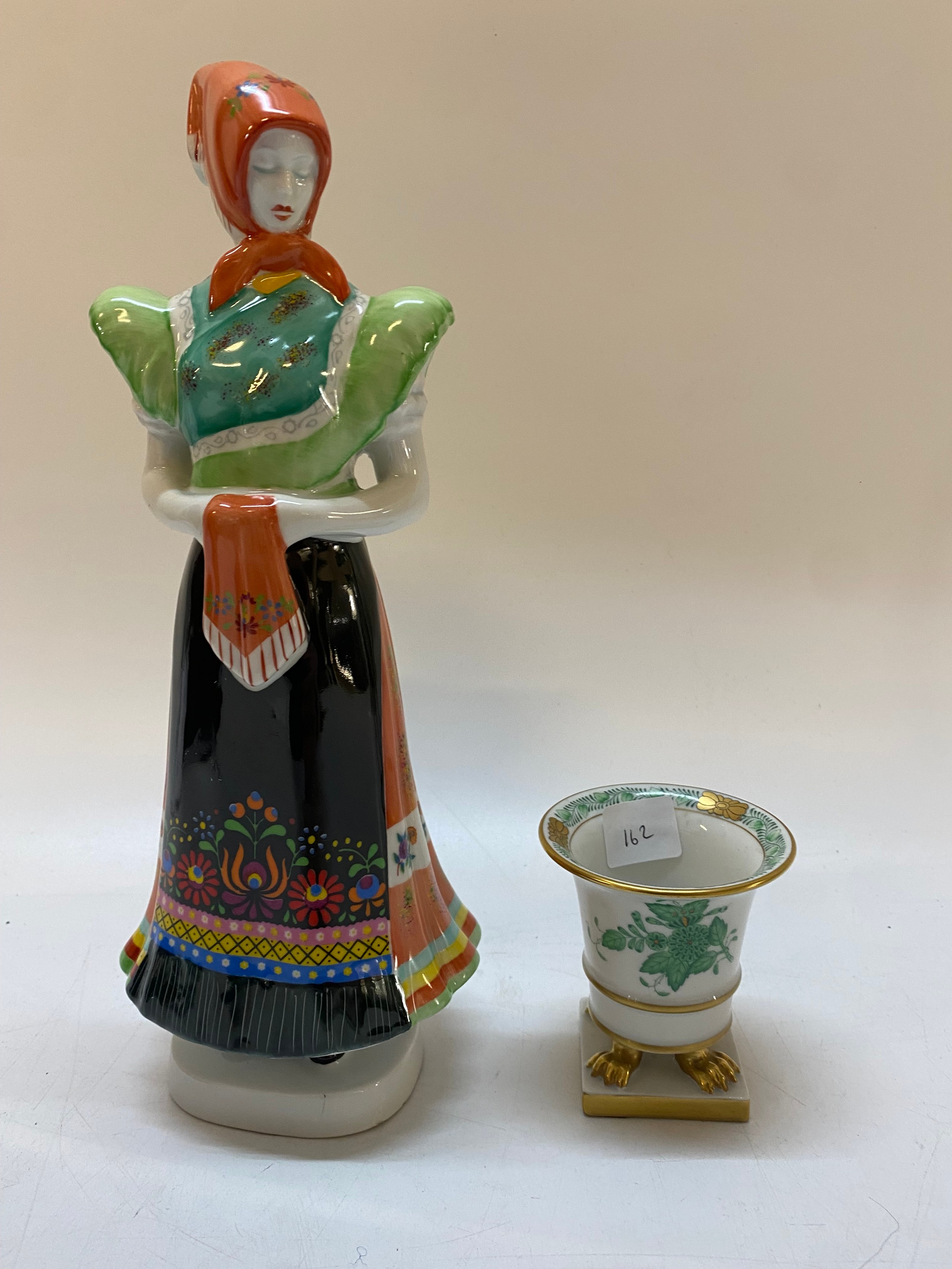 A Hungarian figure of a lady in traditional dress - 11 1/2in. high and a Herend small urn painted flowers and leaves in green, on gilt paw feet and square base - 3in. high