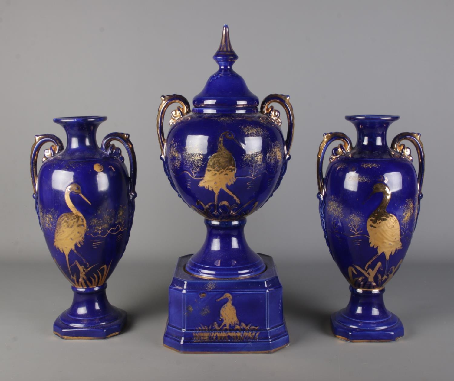A three-piece pottery garniture set by A.G. Harley Jones of Royal Vienna. Hx50cm
