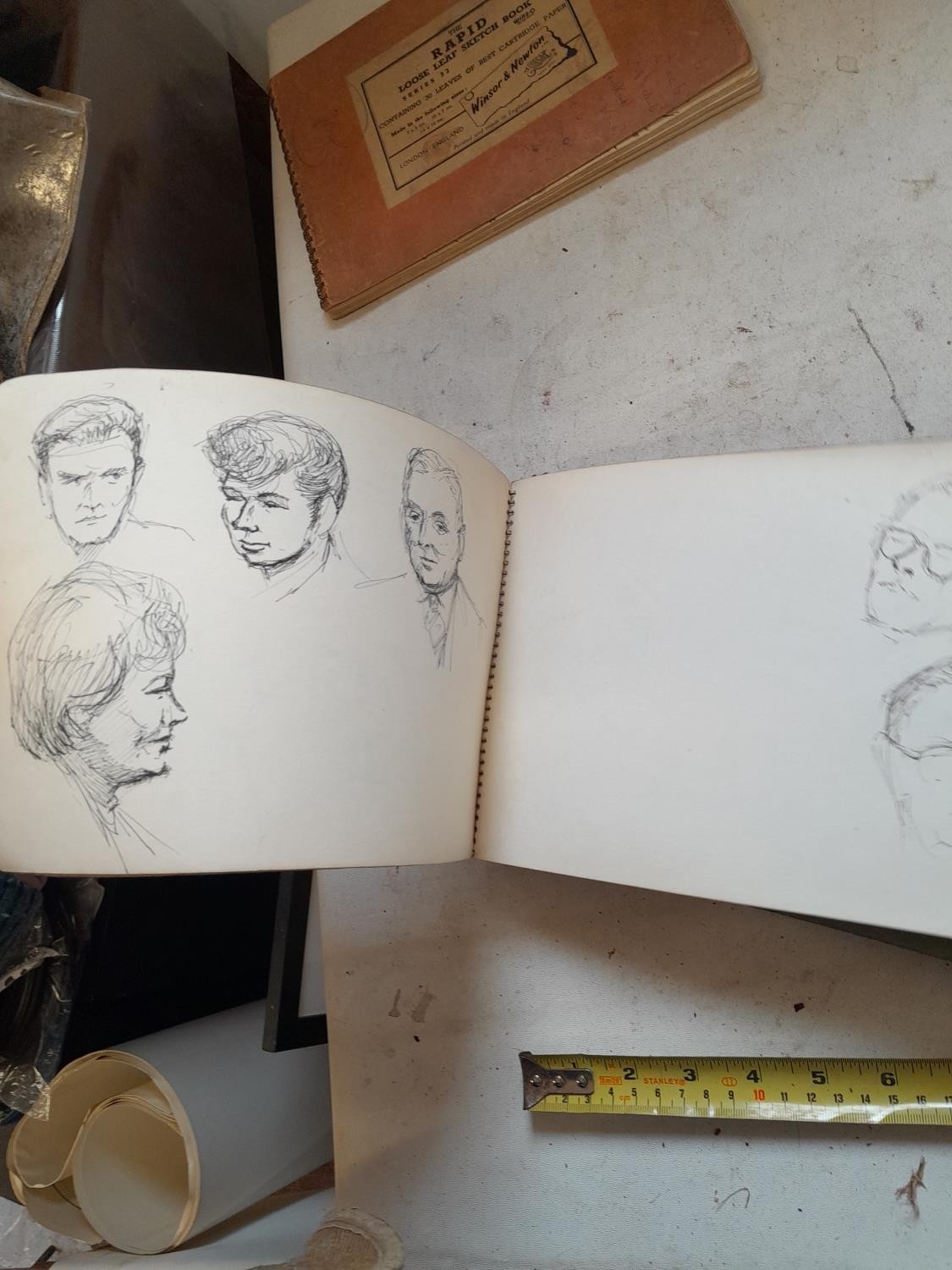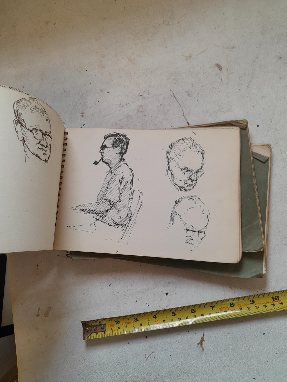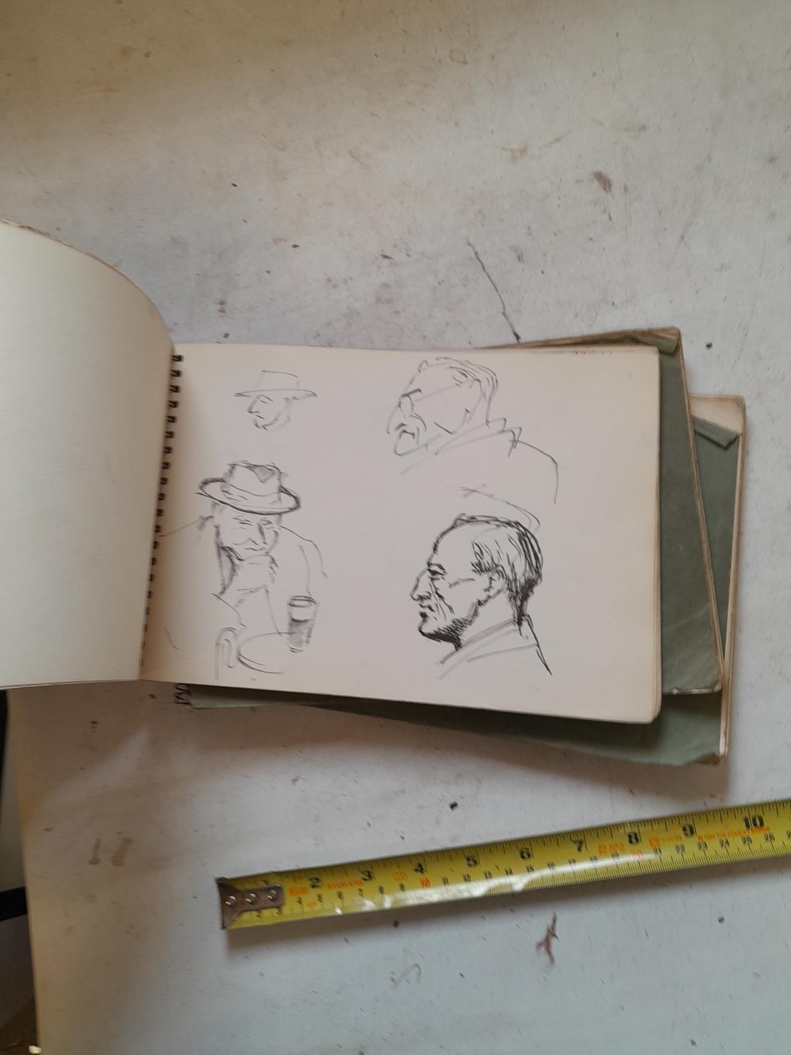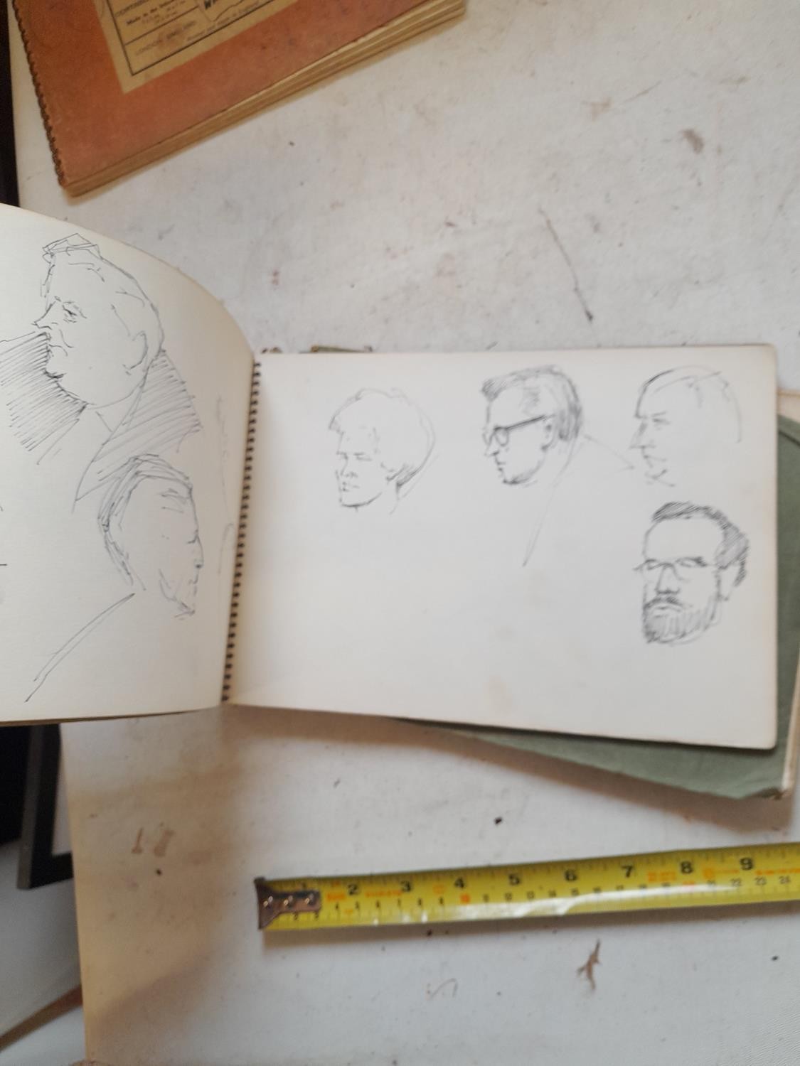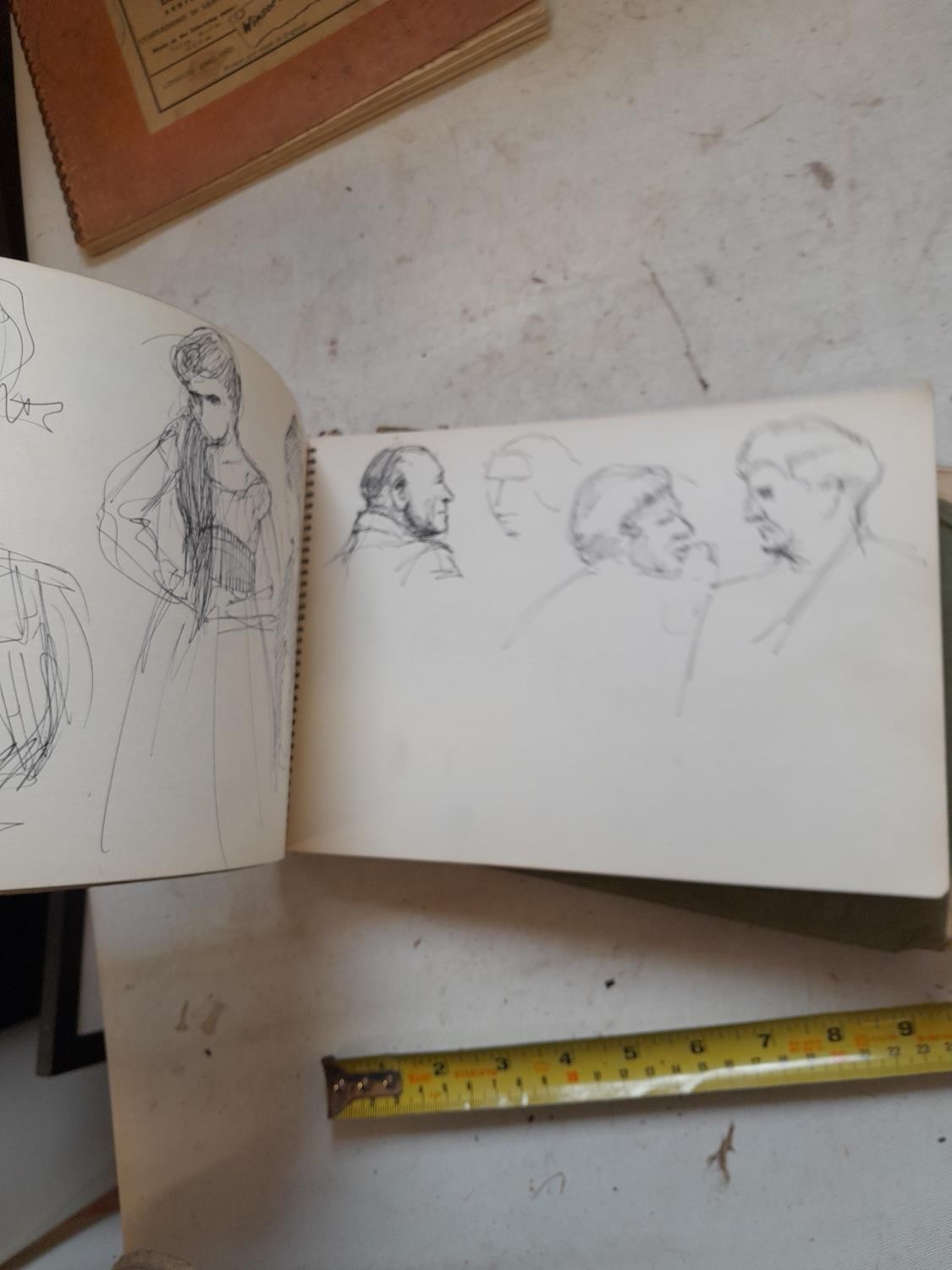 Sketchbooks and pads and loose pen and ink and pastels by Gerald Moneypenny dating from 1950s to early 1970s, assorted themes throughout some portraits etc.