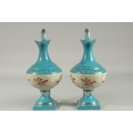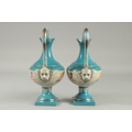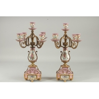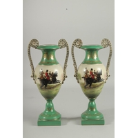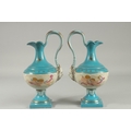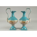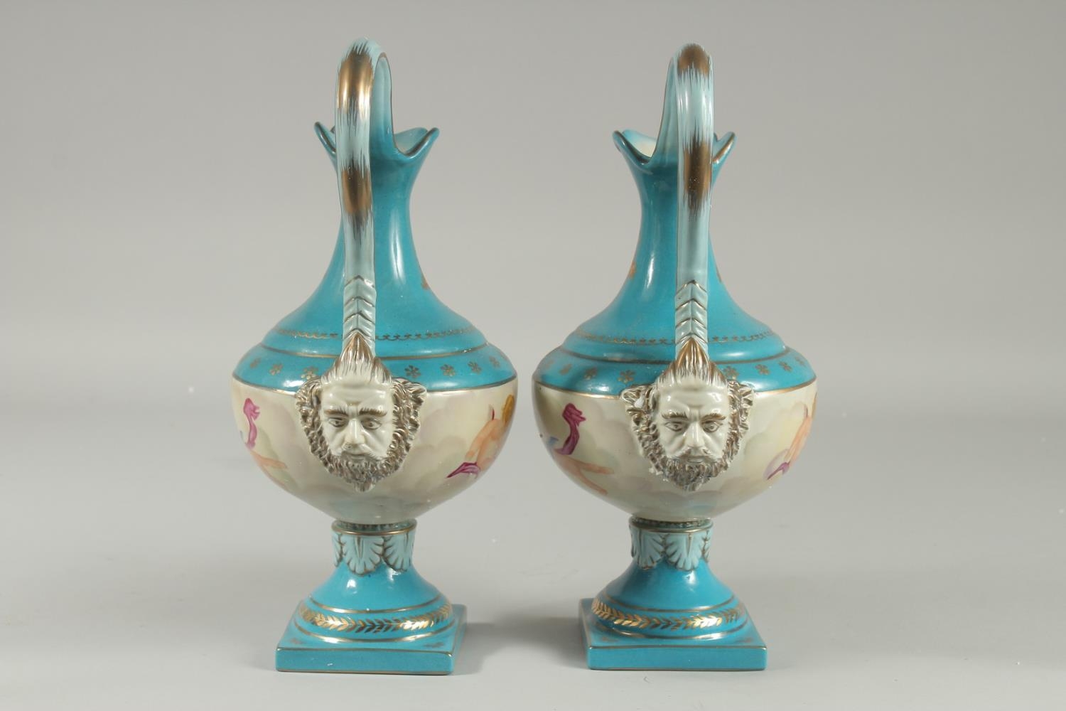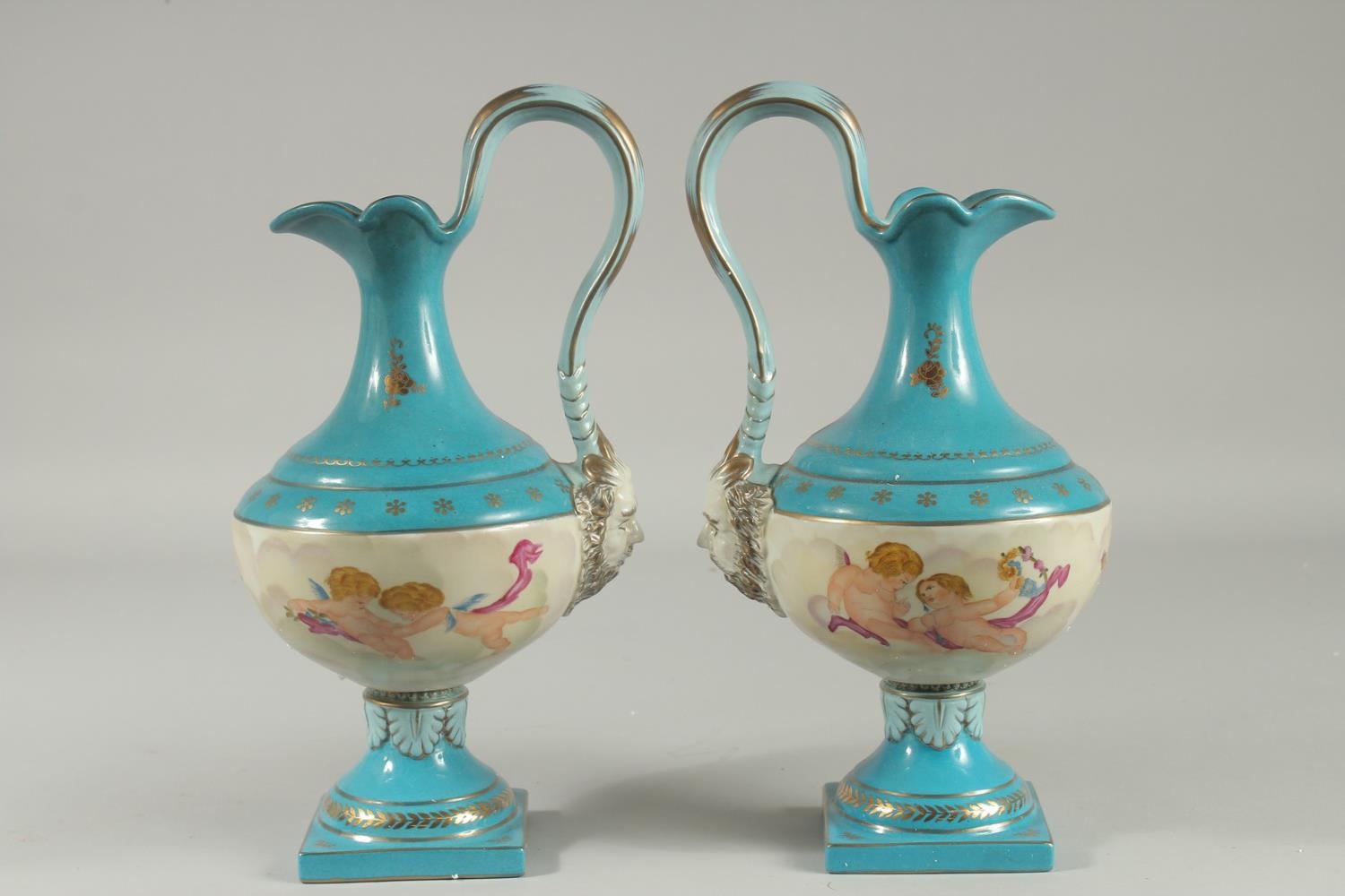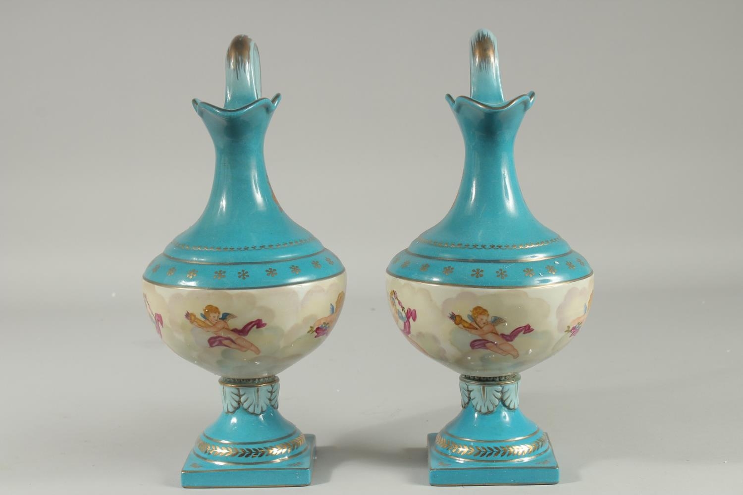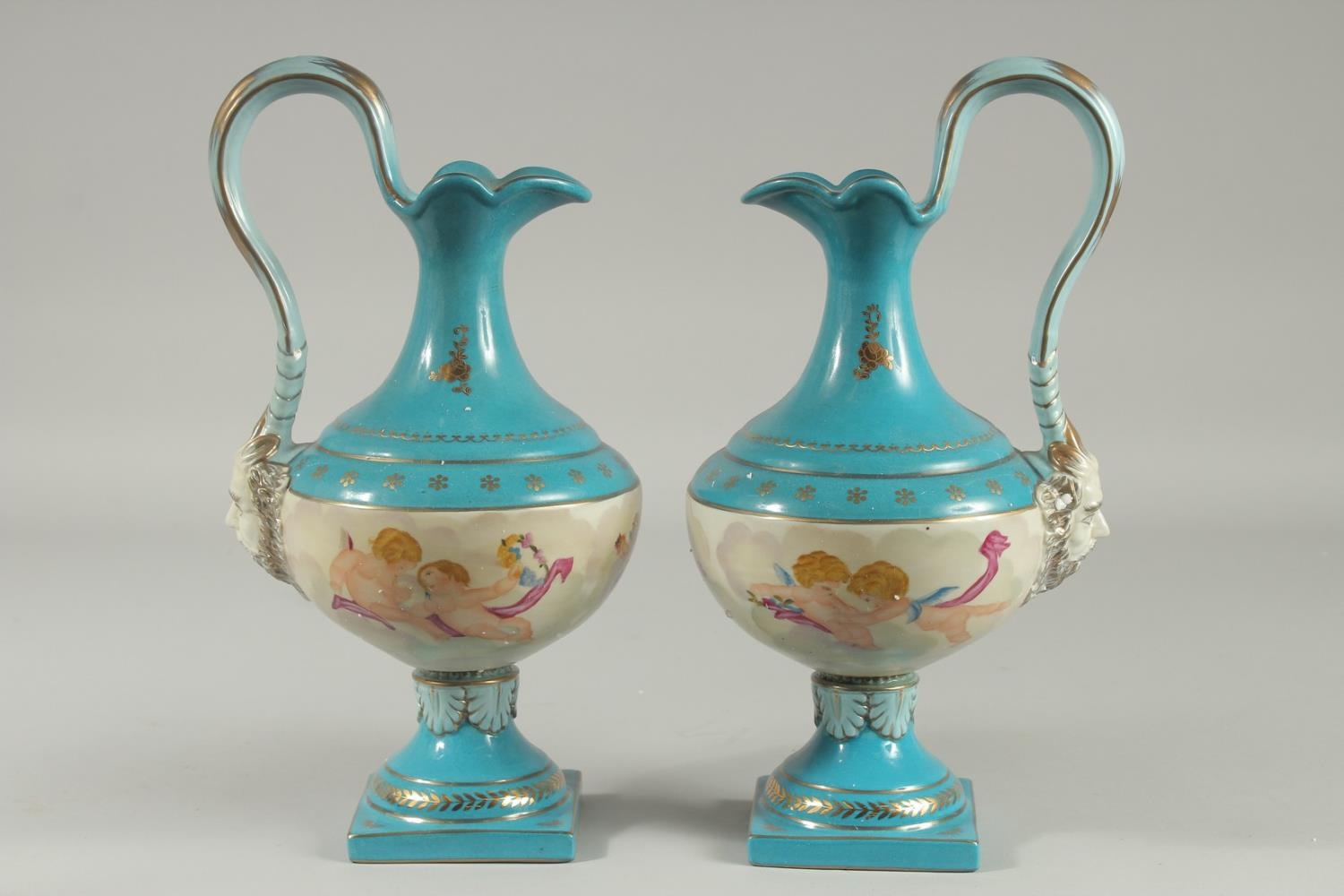 A PAIR OF SEVRES DESIGN PORCELAIN JUGS with a band of cupids. 13ins high.