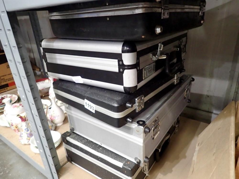 Five mixed leather and metal briefcases. Not available for in-house P&P