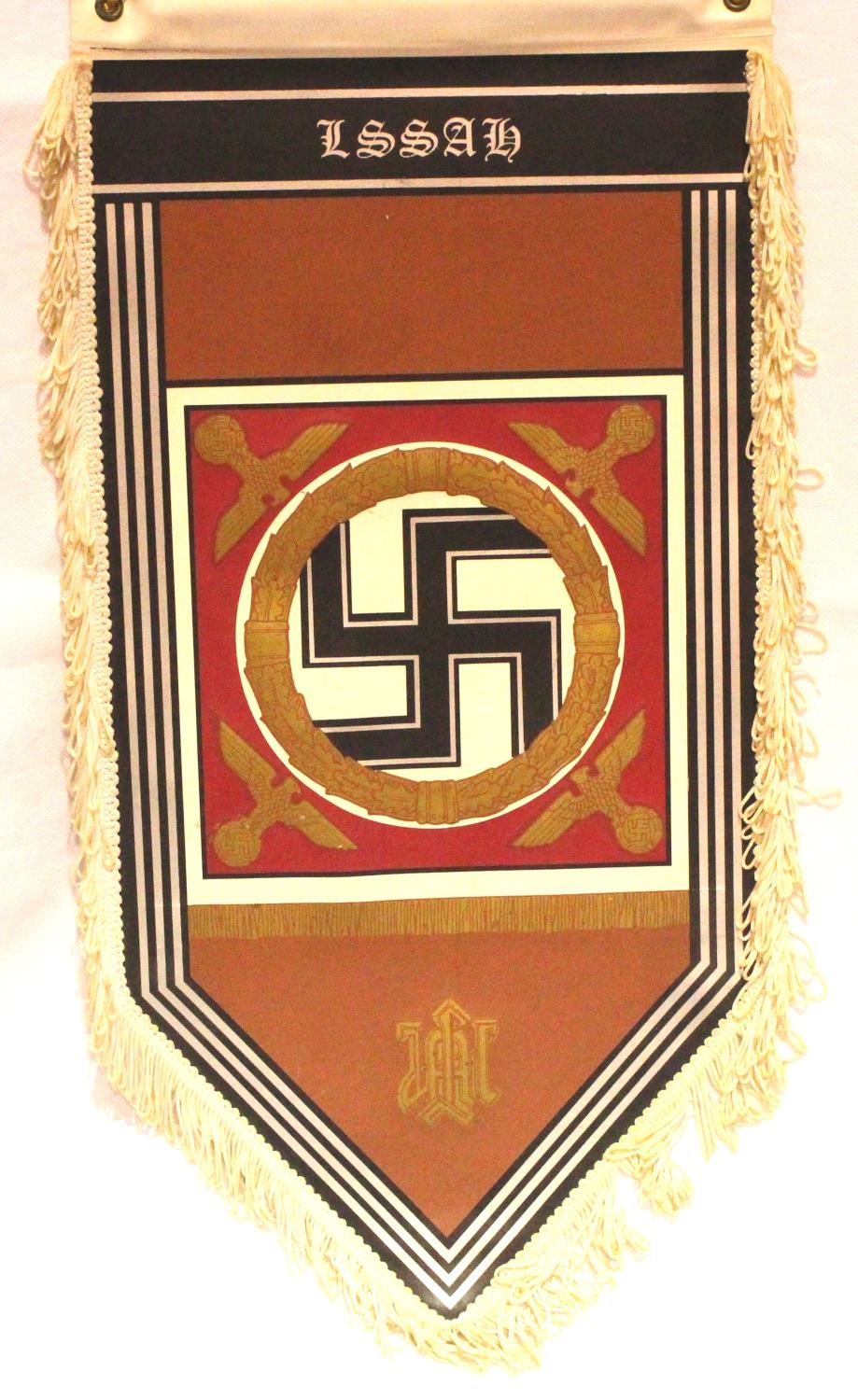 German WWII representation leather effect pennant for the Liebstandarte SS 1st Panzer Division, fringed, 50 x 25 cm. P&P Group 1 (£14+VAT for the first lot and £1+VAT for subsequent lots)
