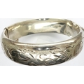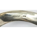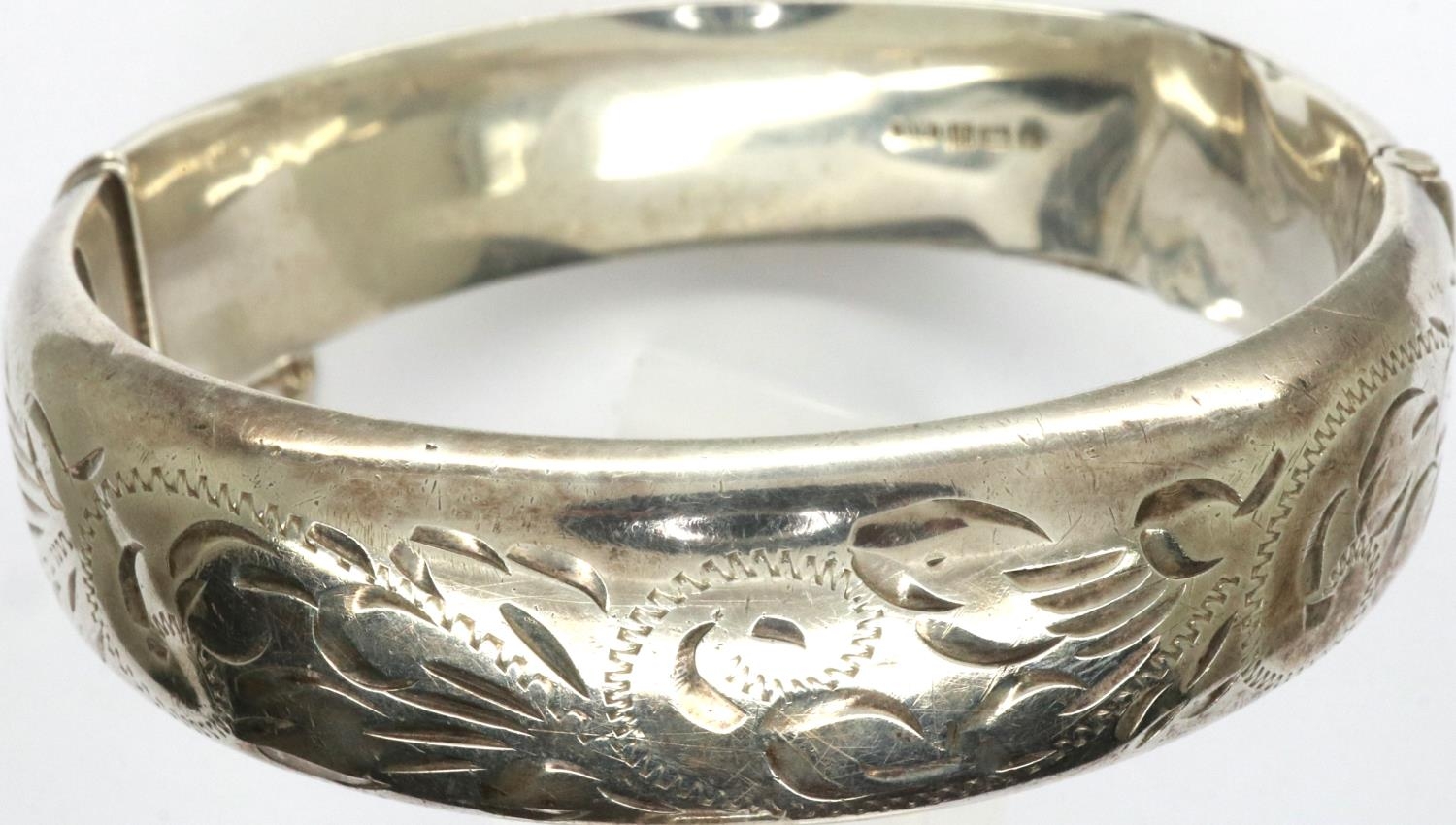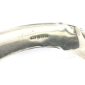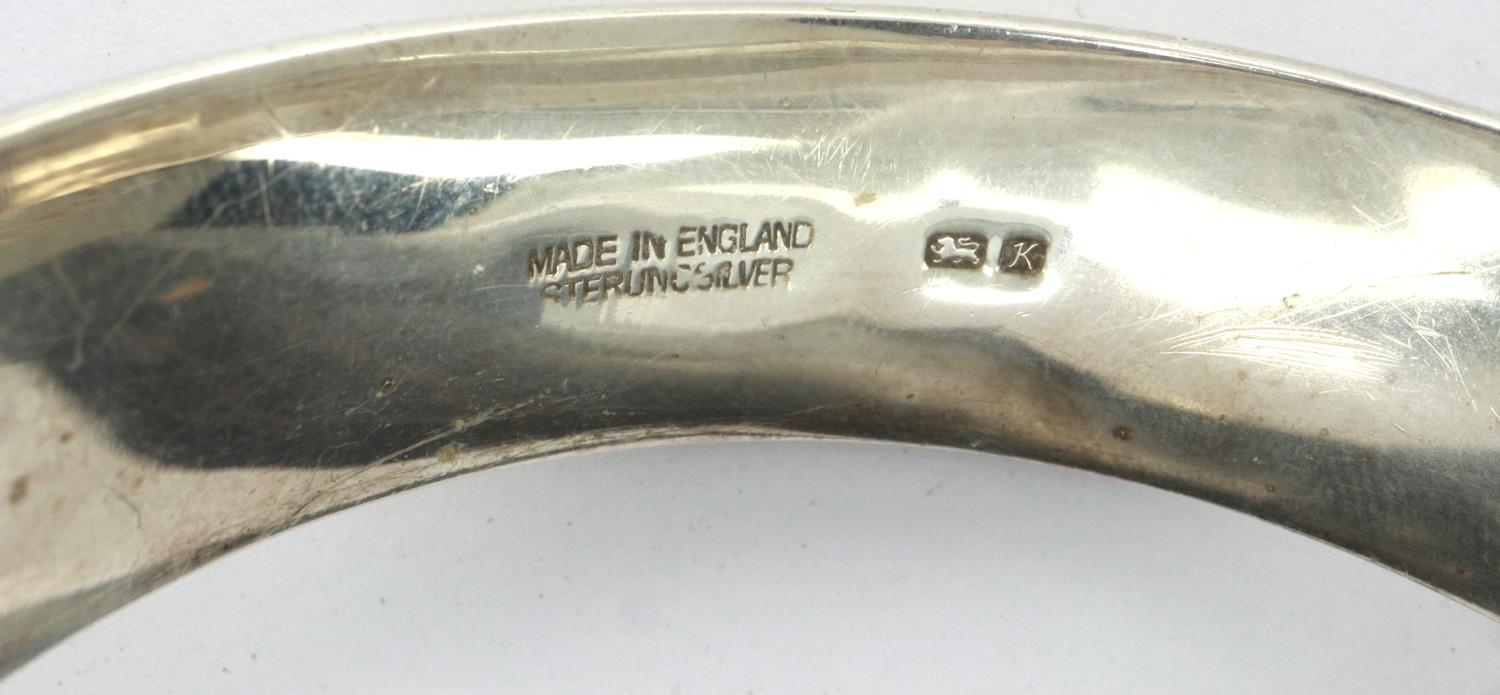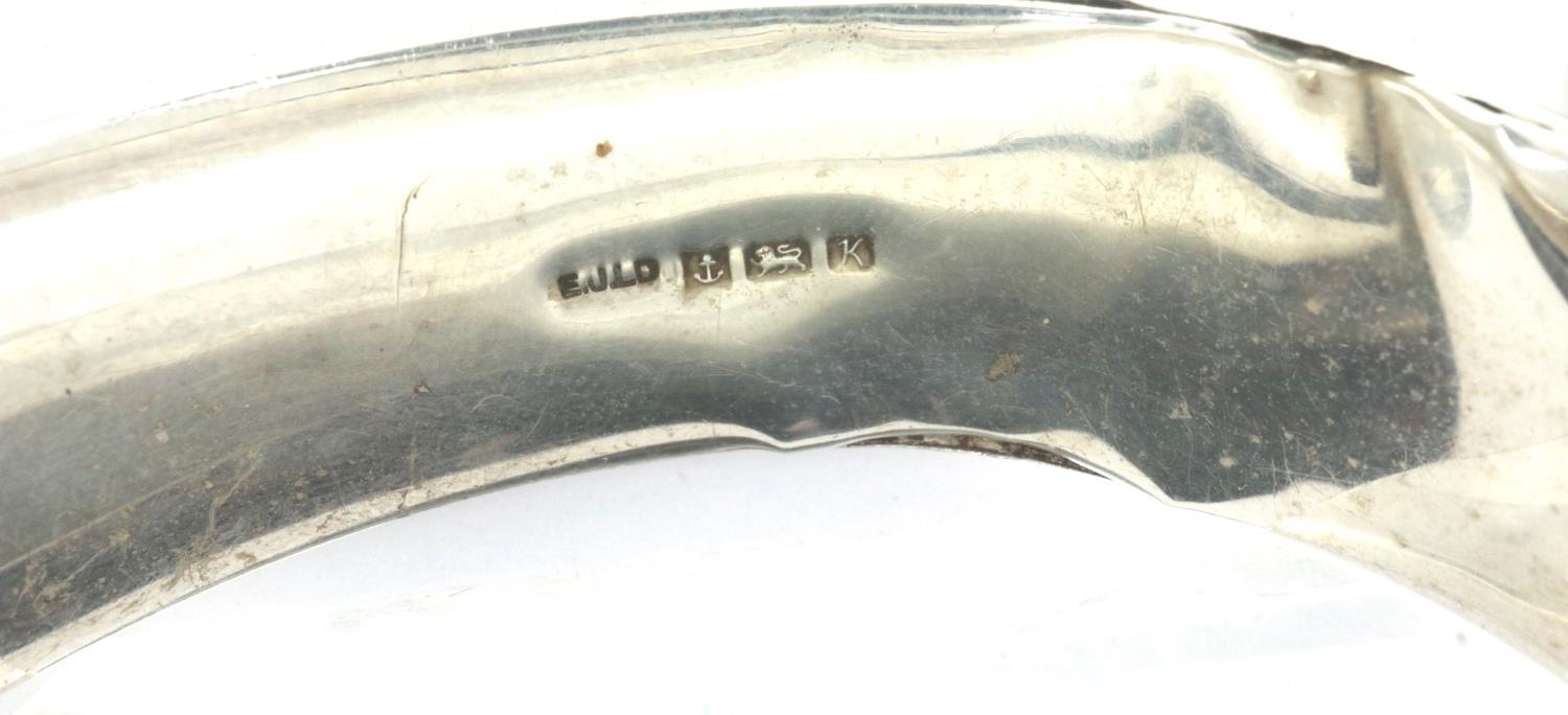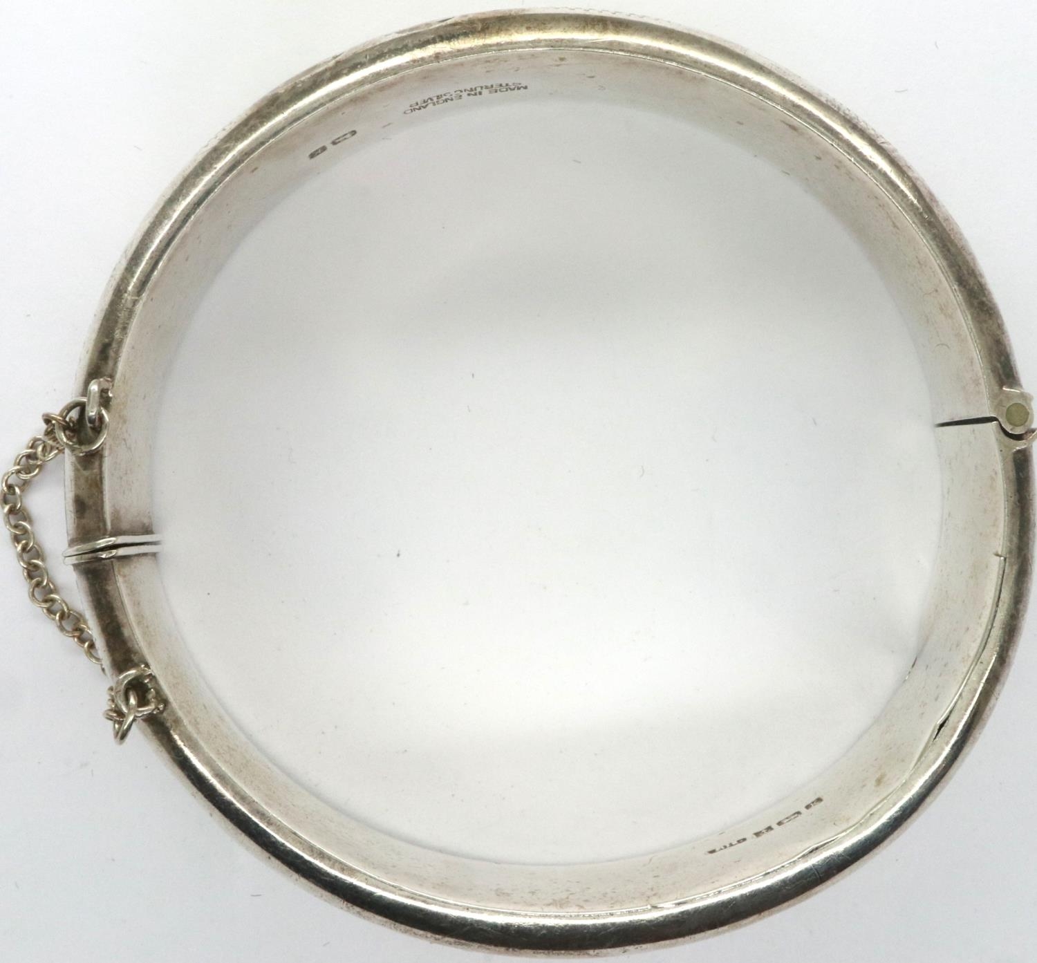 Hallmarked silver snap bangle with safety chain, D: 65 mm, 23g, slight dent to silver. P&P Group 1 (£14+VAT for the first lot and £1+VAT for subsequent lots)