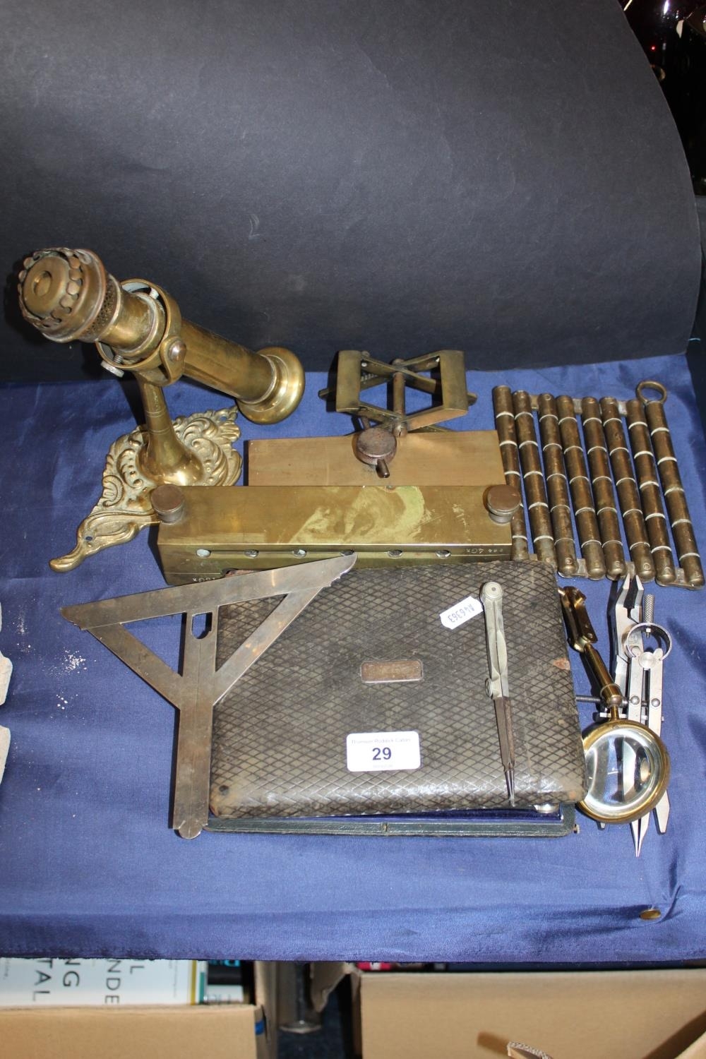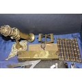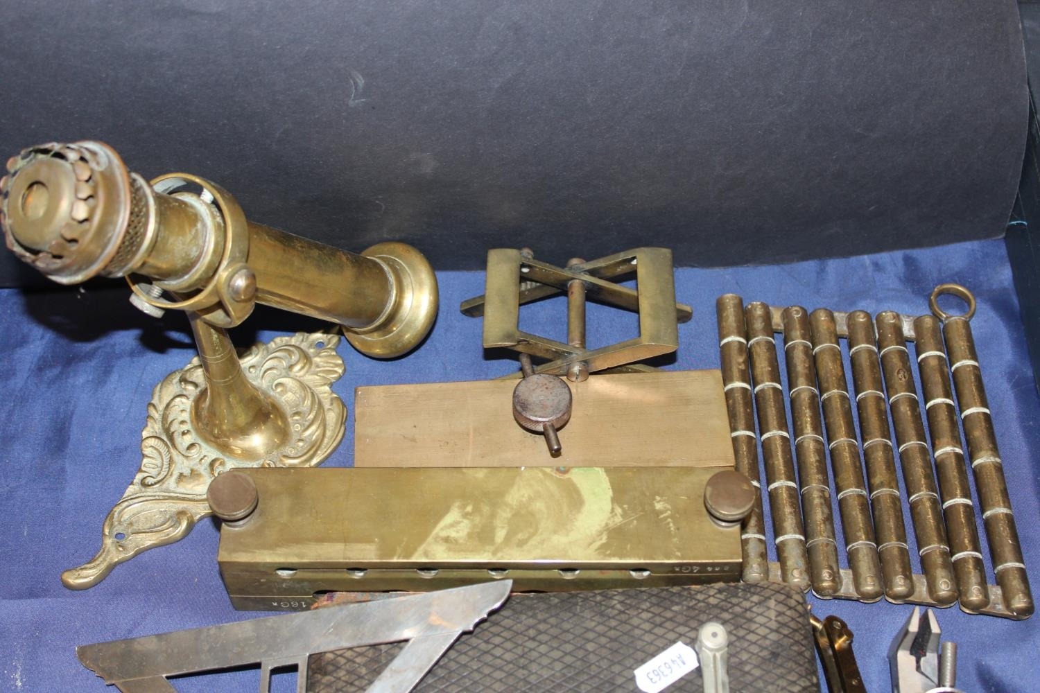 Scientific instruments, a brass ships' gimbal, candlesticks, an antique suppository mould, etc.