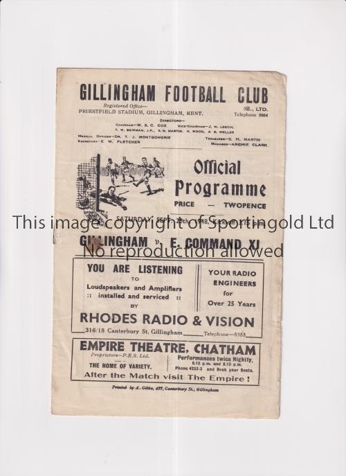 GILLINGHAM V EASTERN COMMAND XI 1948 programme for the match at Gillingham 25/9/1948, slightly marked. Fair to generally good