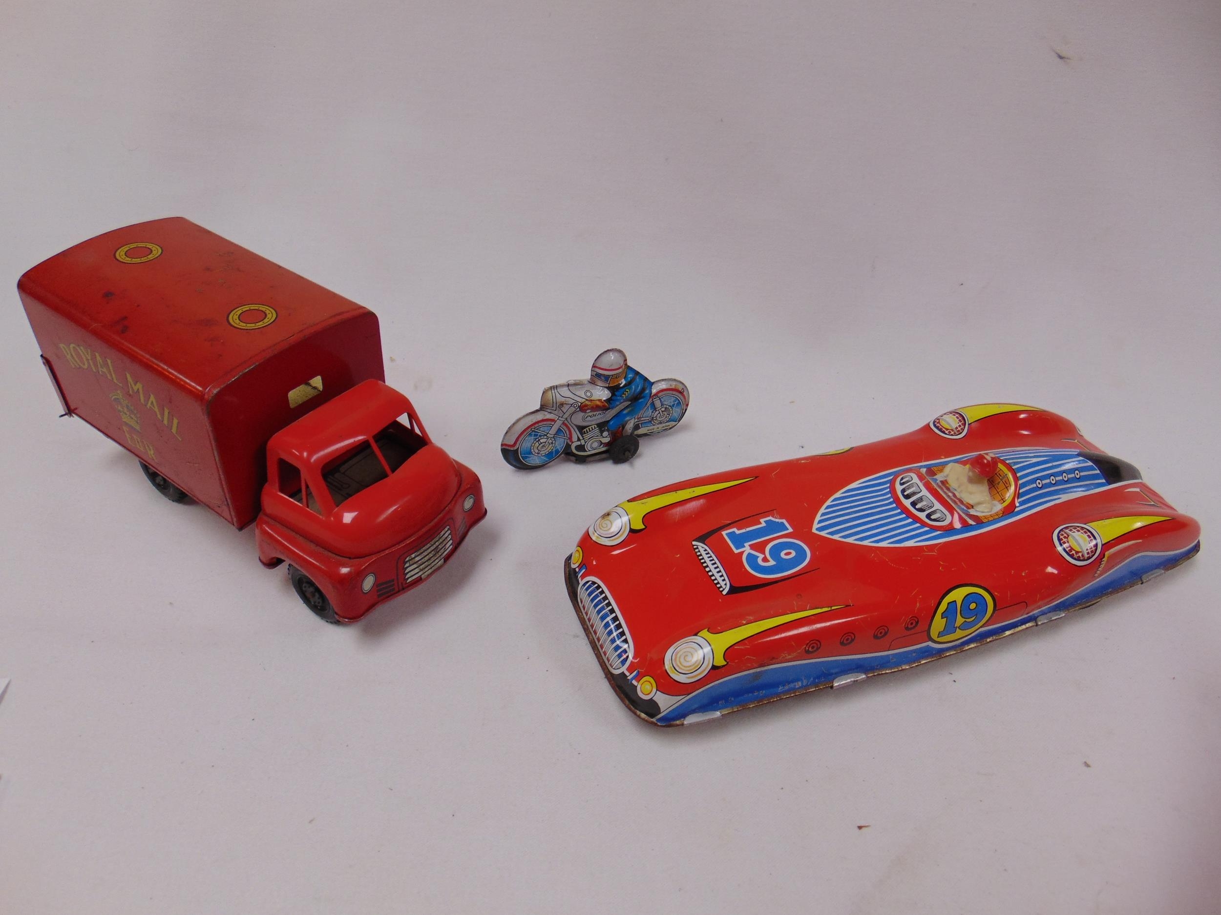 Vintage tinplate Royal Mail van, British tinplate Racing Car etc.