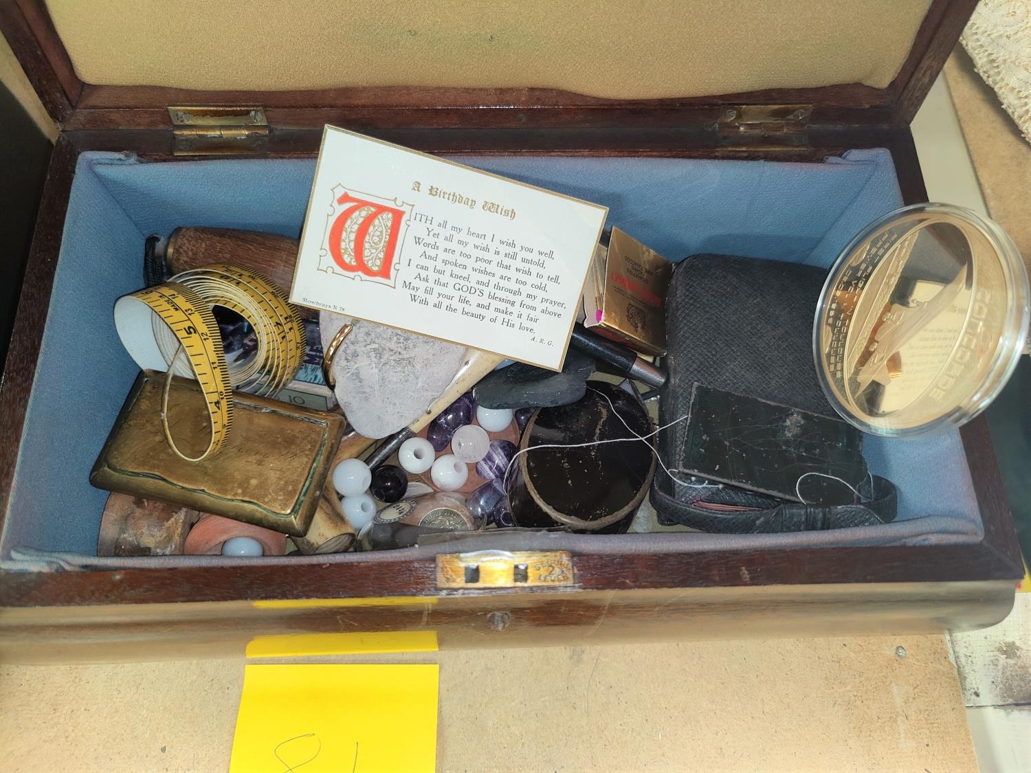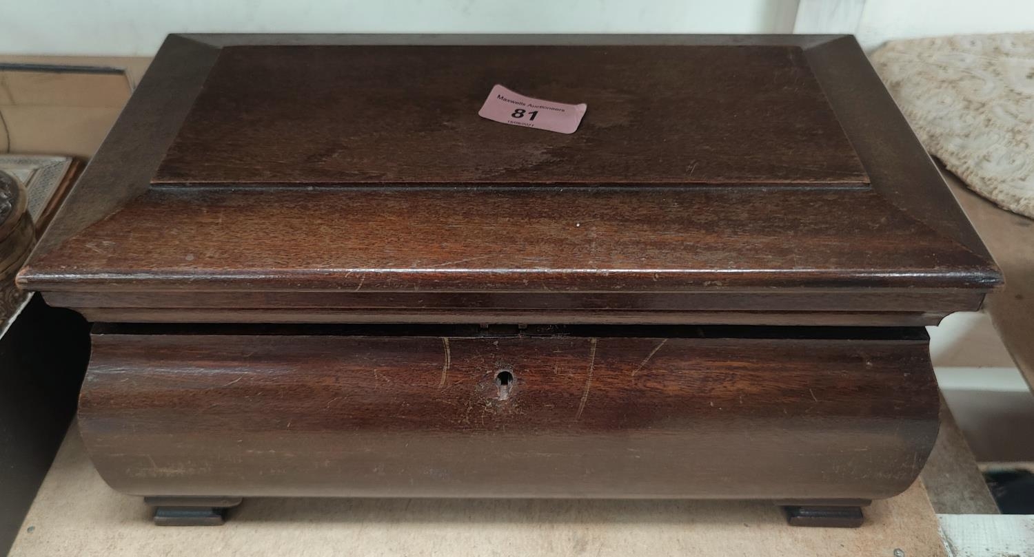 A brass snuff box; an oak sarcophagus shaped jewellery box, 32 cm; other collectables