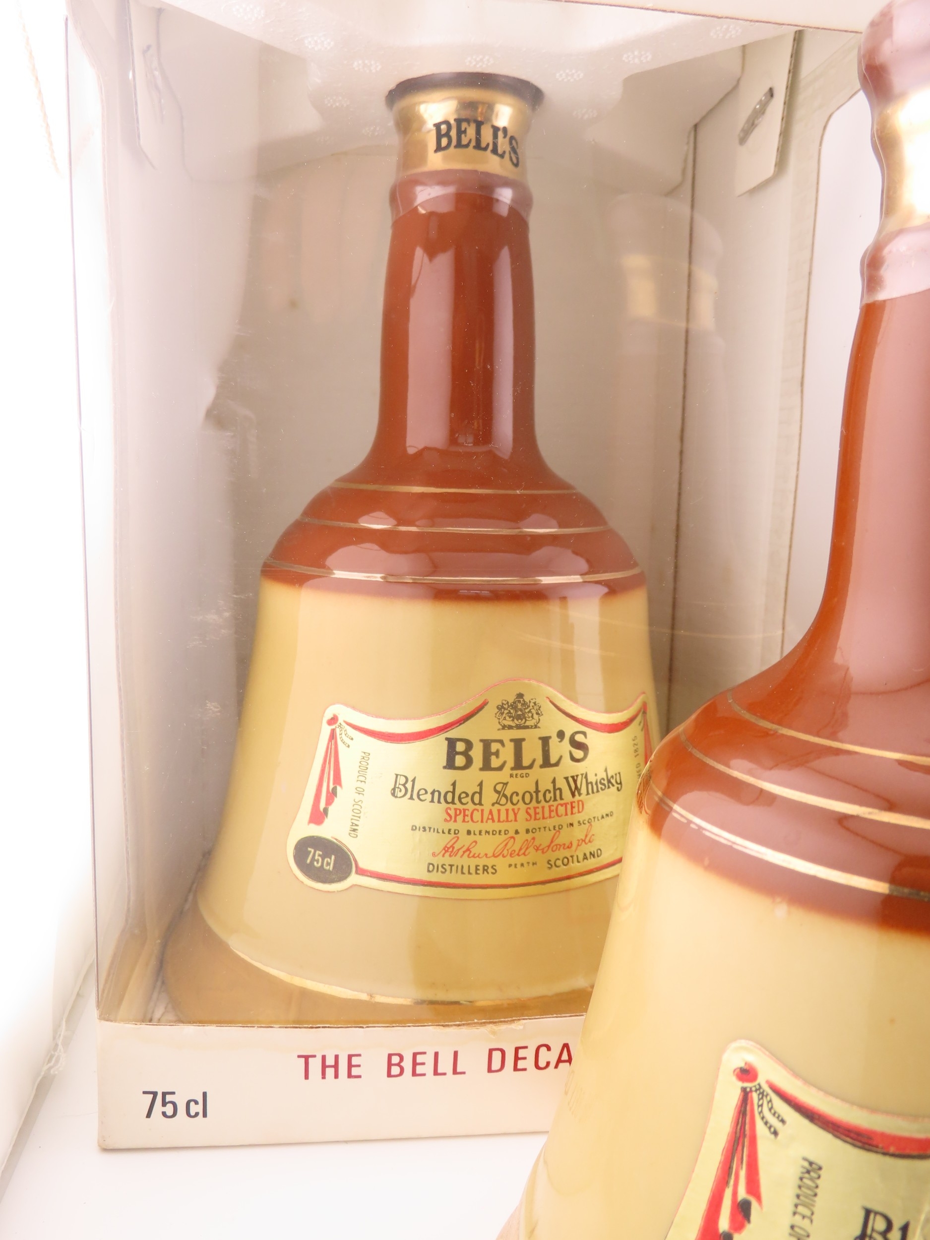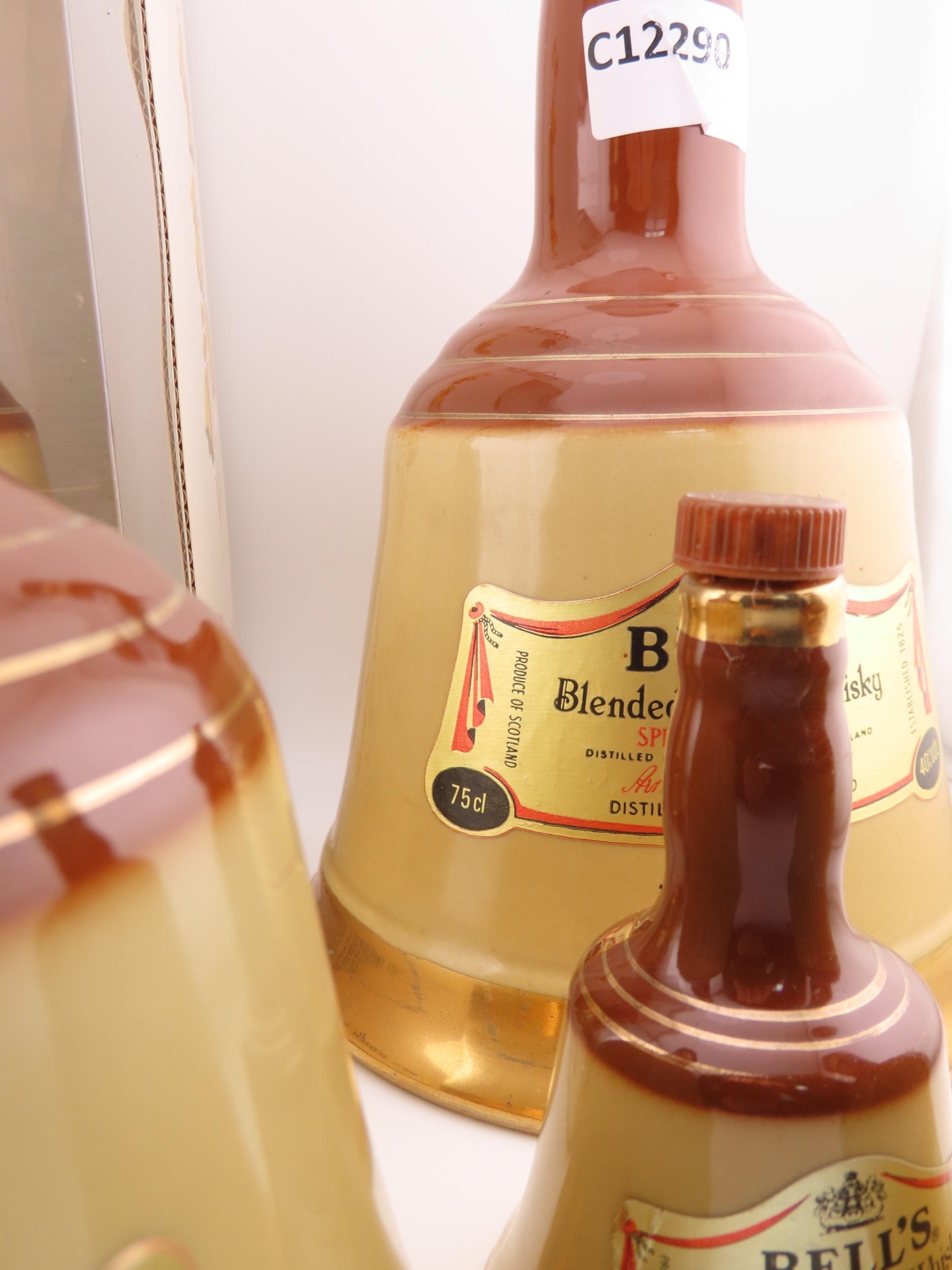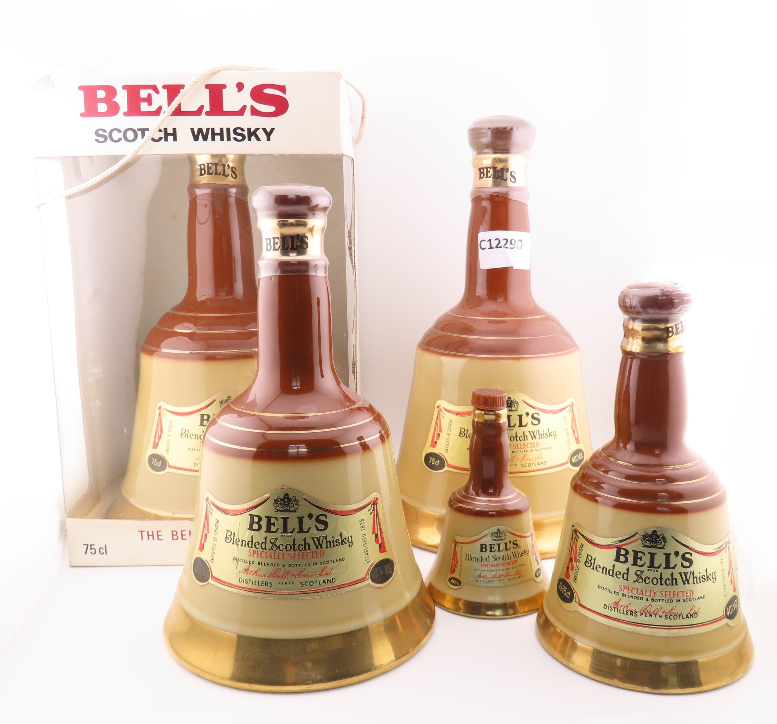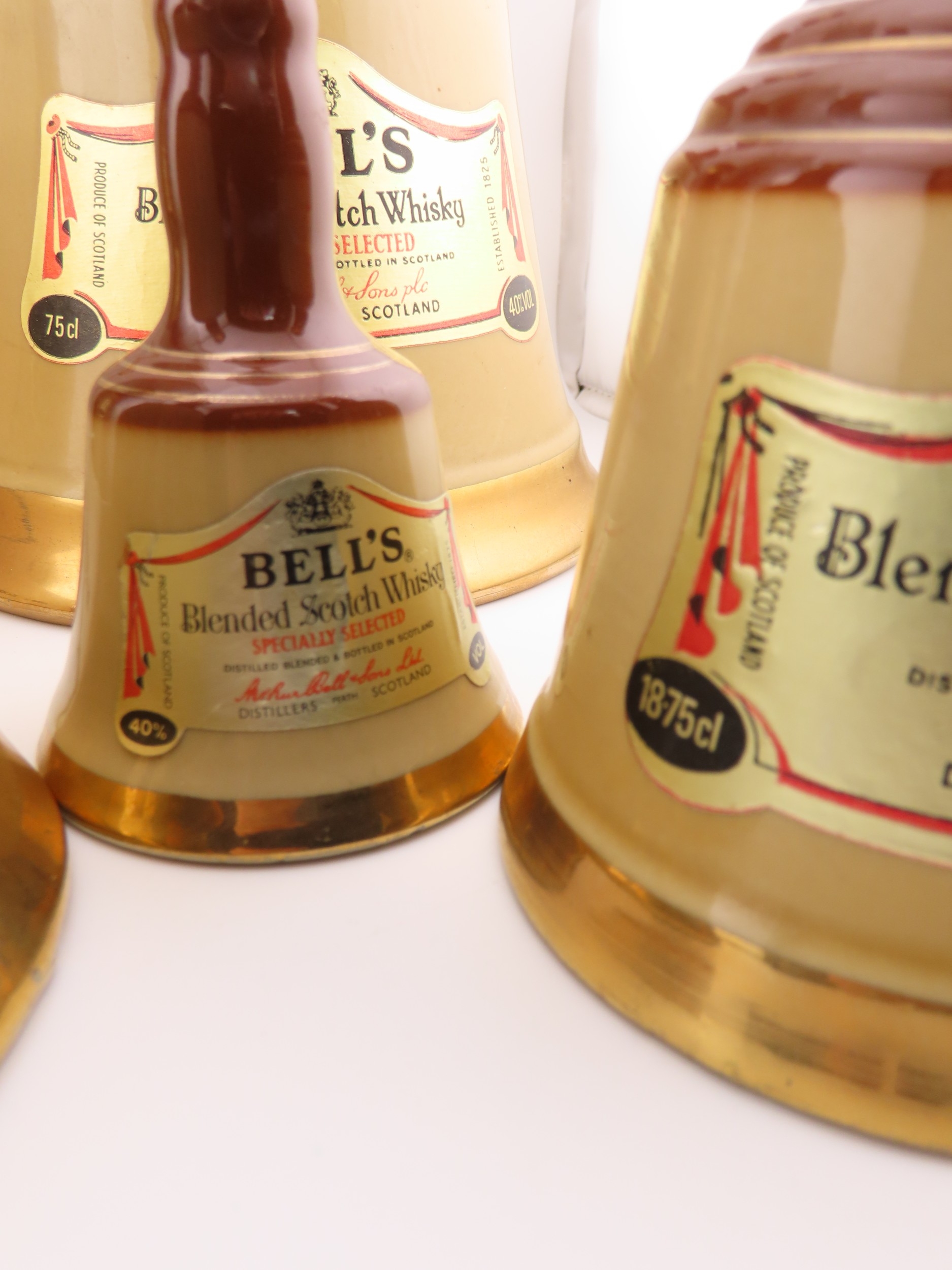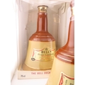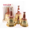 Five Full sealed Bells whisky Wade bell decanters, various sizes and one still boxed.