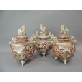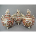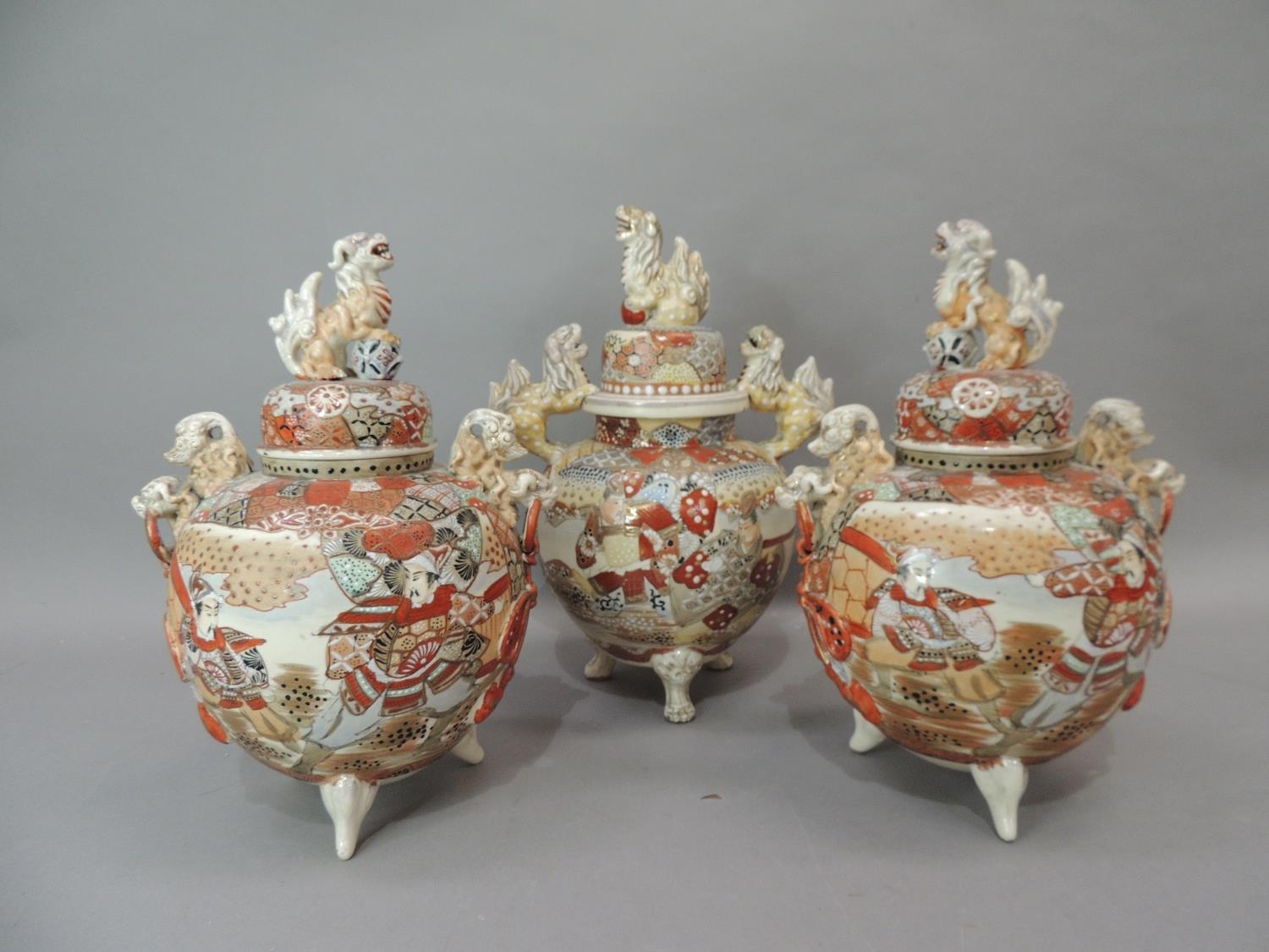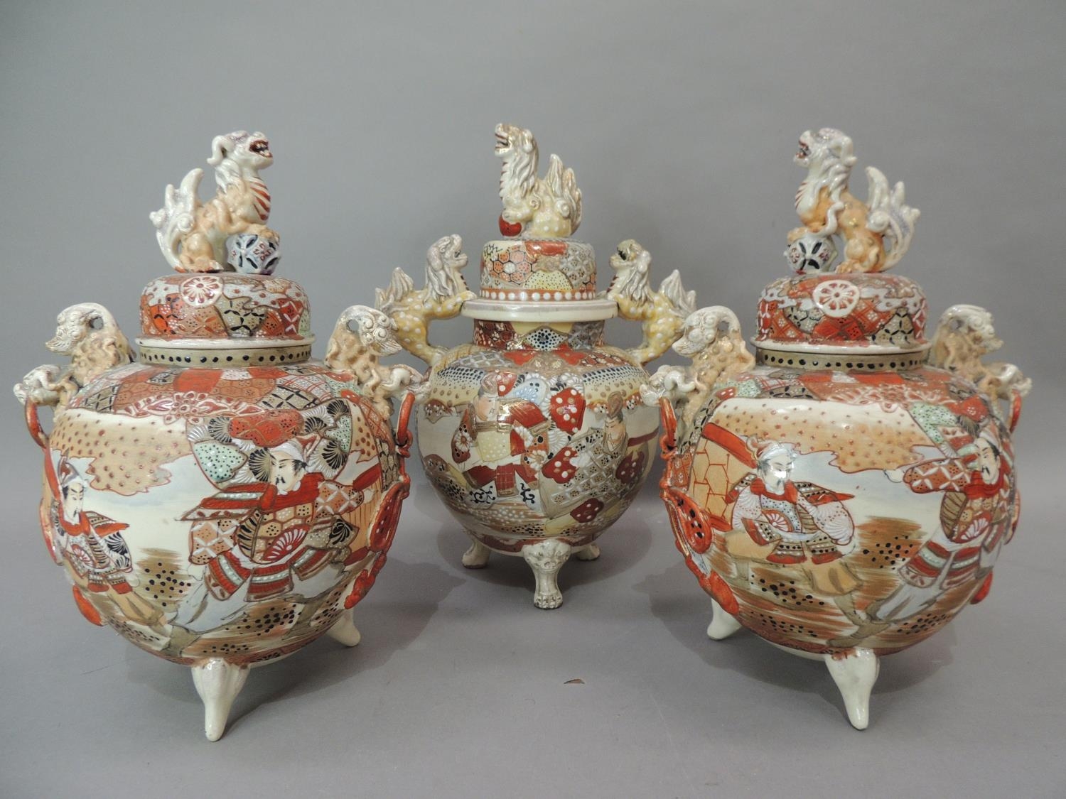 Three early twentieth century Japanese pottery koros and covers, each domed cover with a Dog of Fo finial, further Dogs of Fo to the shoulders, each painted with figures in a landscape