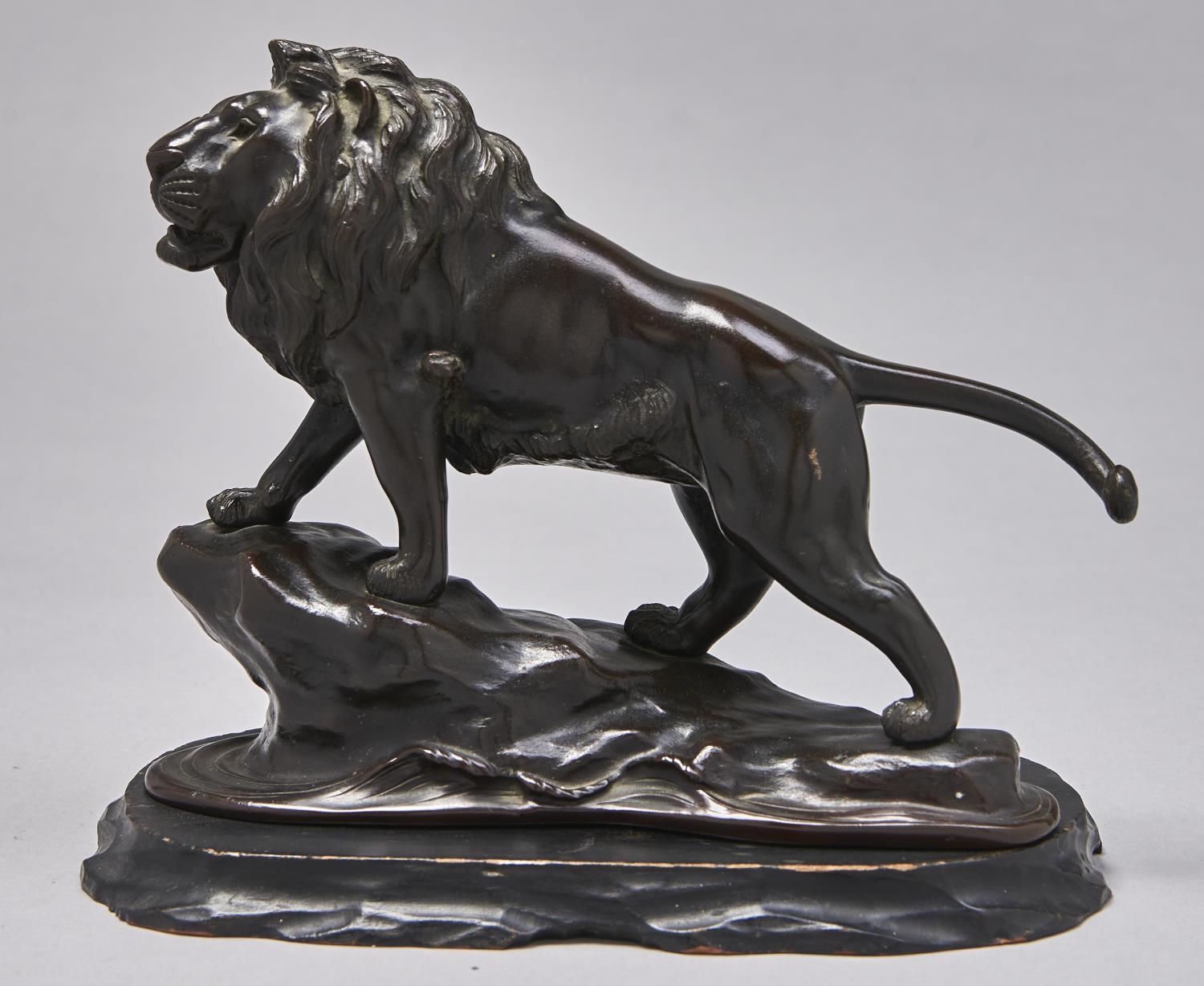 A Japanese bronze sculpture of a lion, Genryusai Seiya Studio, Meiji period, reddish brown patina, slightly scratched on rump, 22cm h, Seiya Saku mark and a wood stand (2)