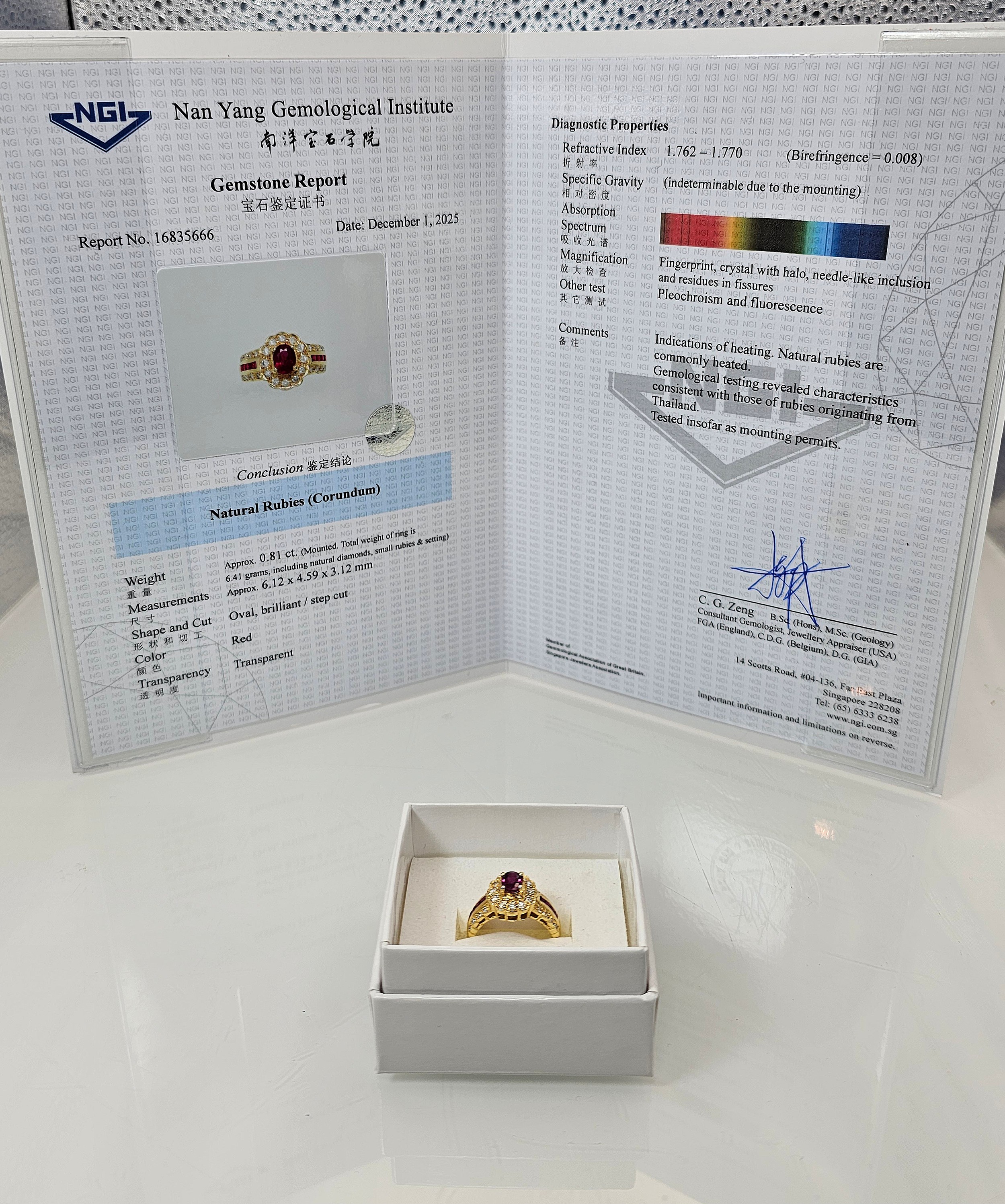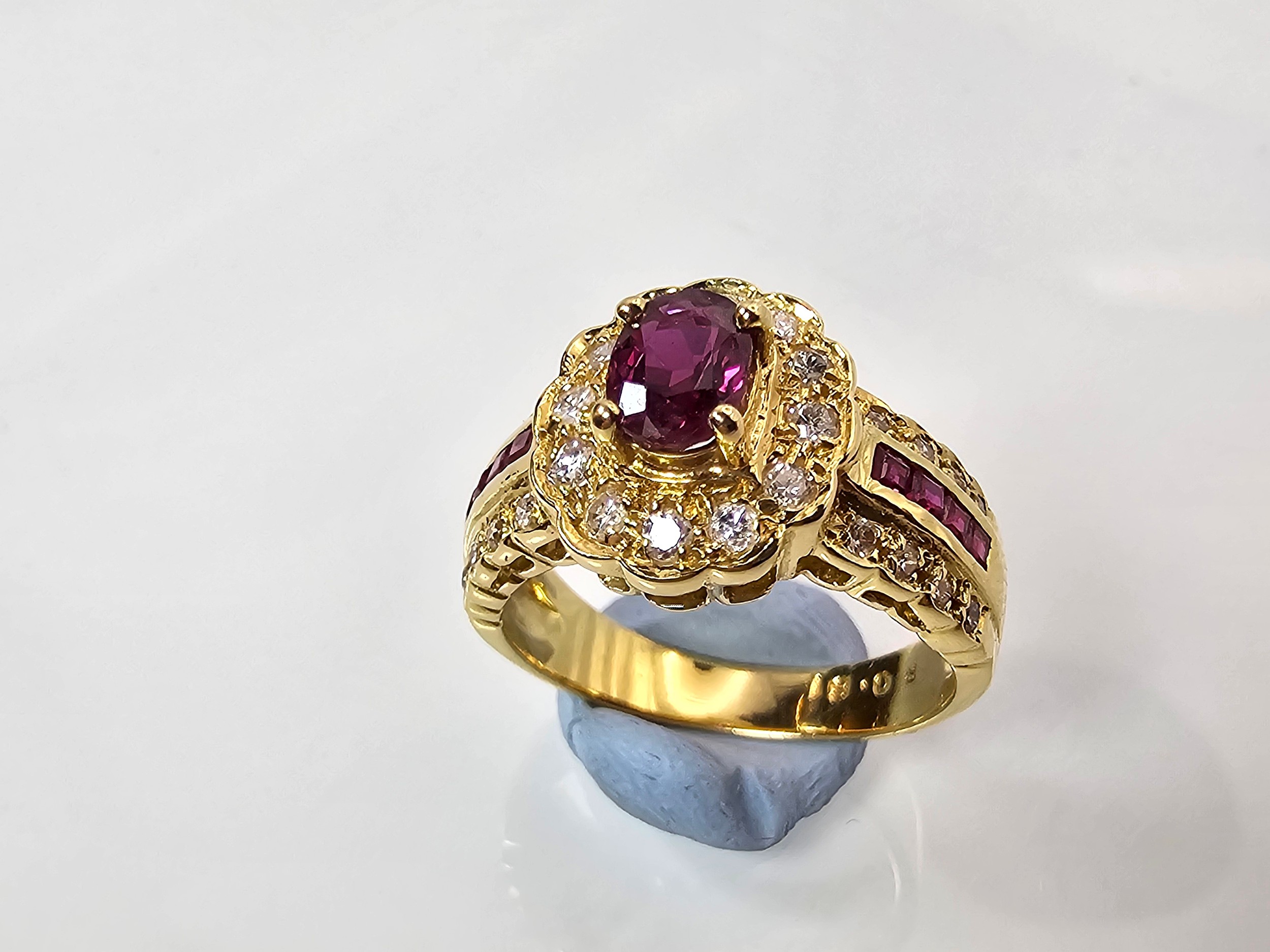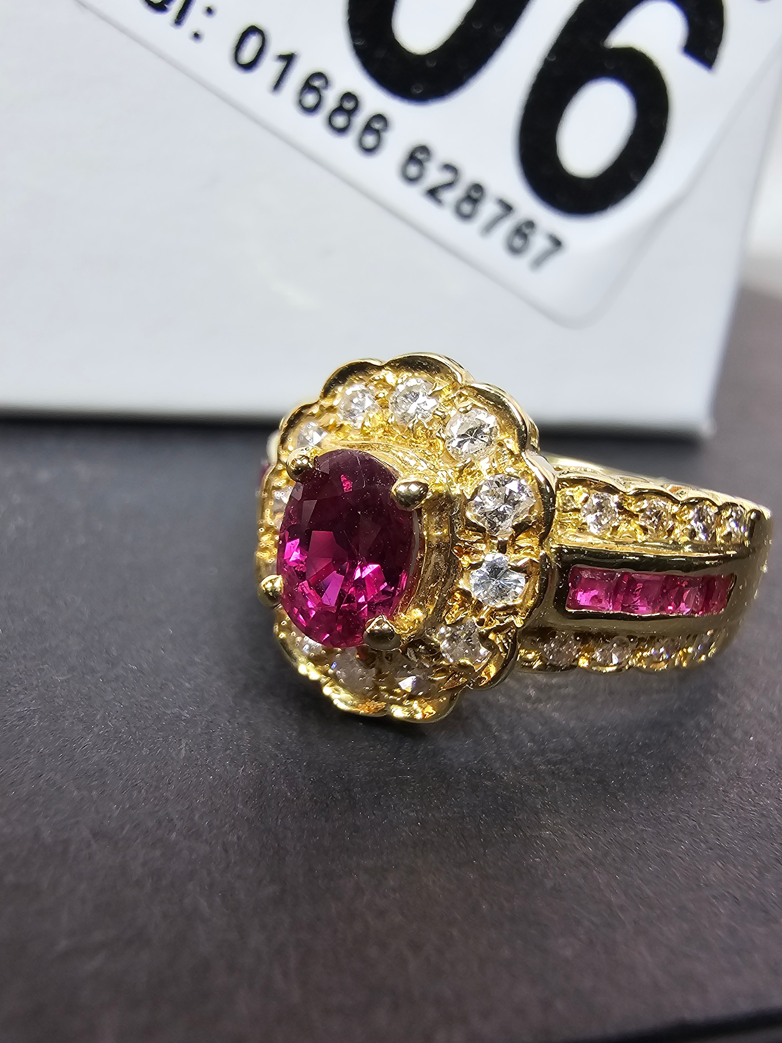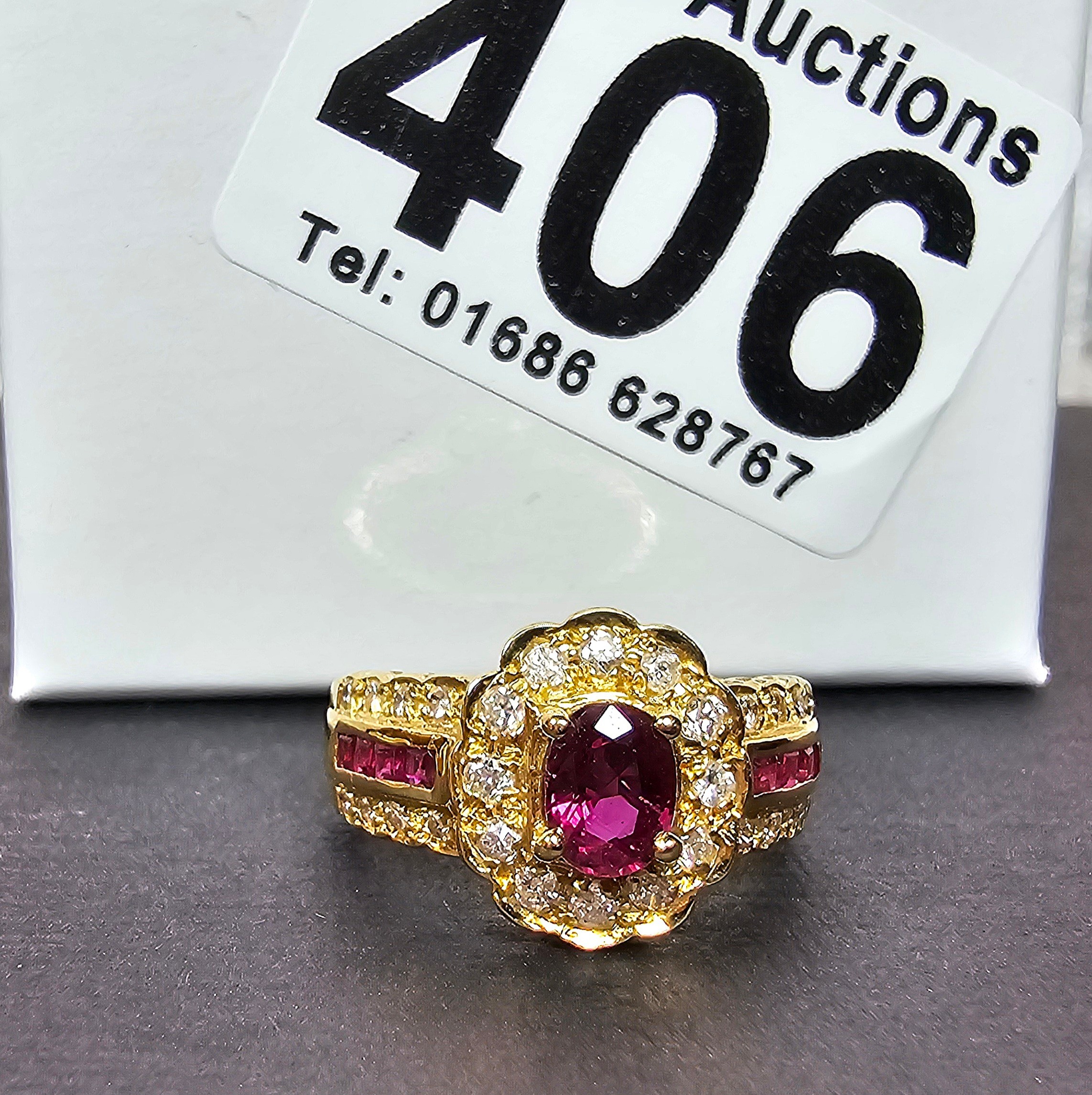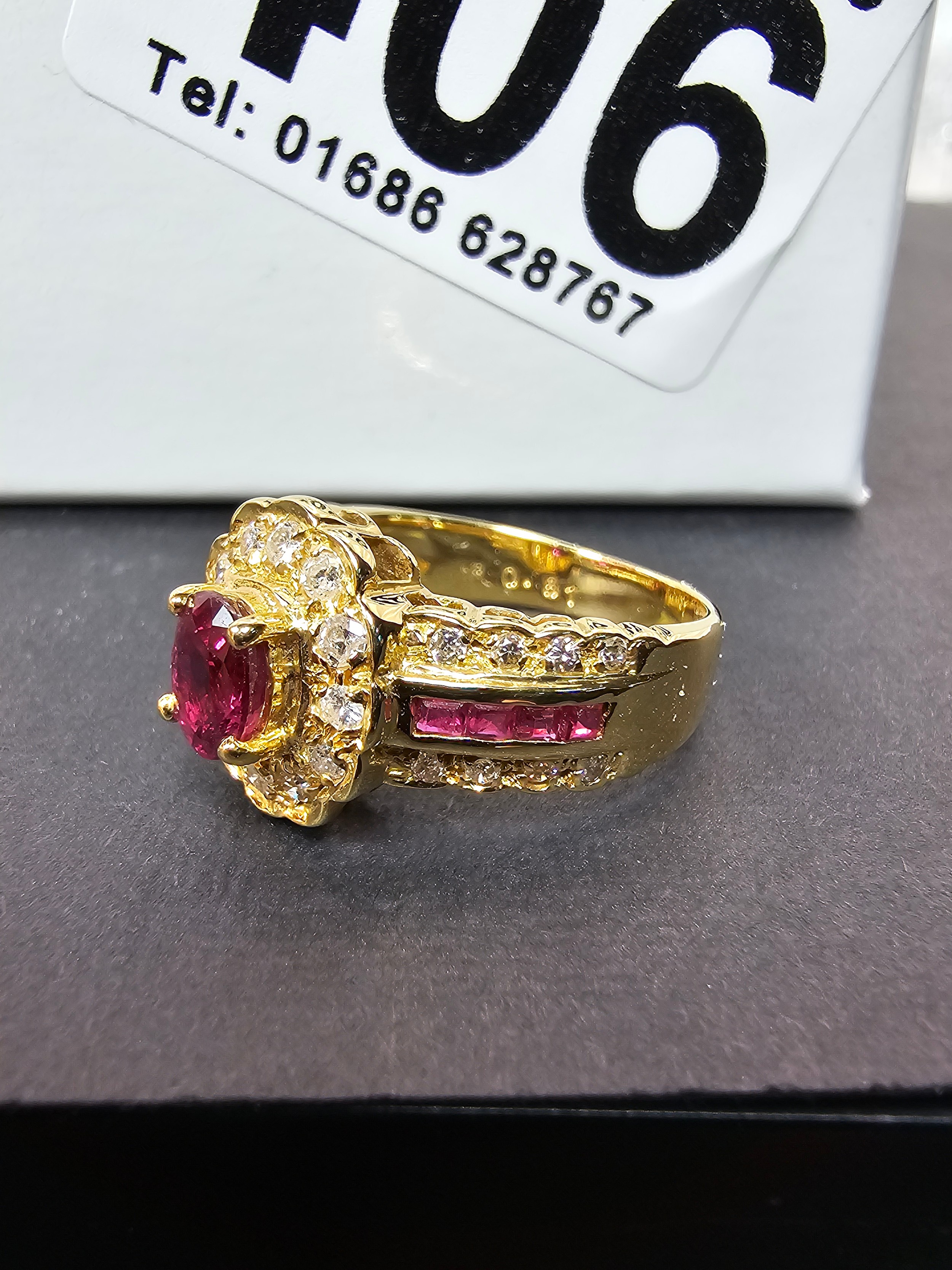 A fine quality 18ct Gold Ruby & Diamond Halo Ring. Claw set with an oval cut natural Ruby weighing 0.81ct, displaying a pleasing red hue, surrounded by a halo of round brilliant cut diamonds, the shoulders further accented with diamond and calibre cut ruby detail stones creating a well balanced and elegant design. Accompanied by it's NGI Gemstone Report confirming the Ruby to be natural with indications of heating, a standard and accepted treatment within the trade. The ring is brand new and displays very nicely. total weight of the ring is 6.14g. Complete with its presenetation box.