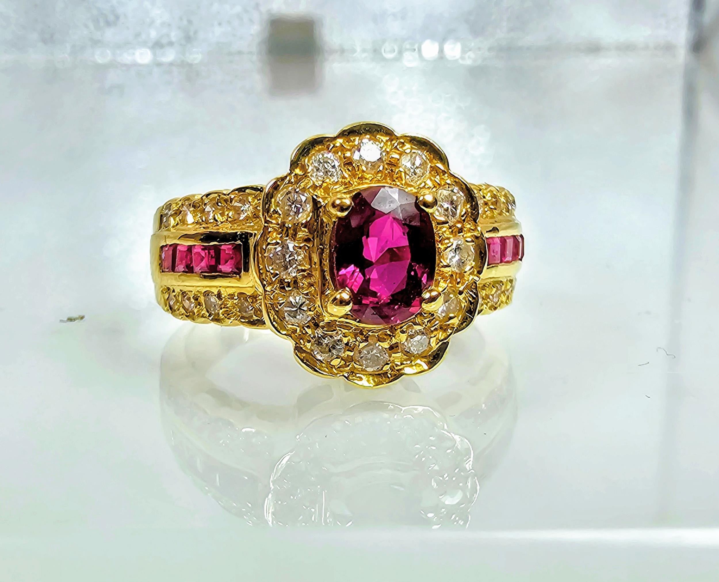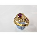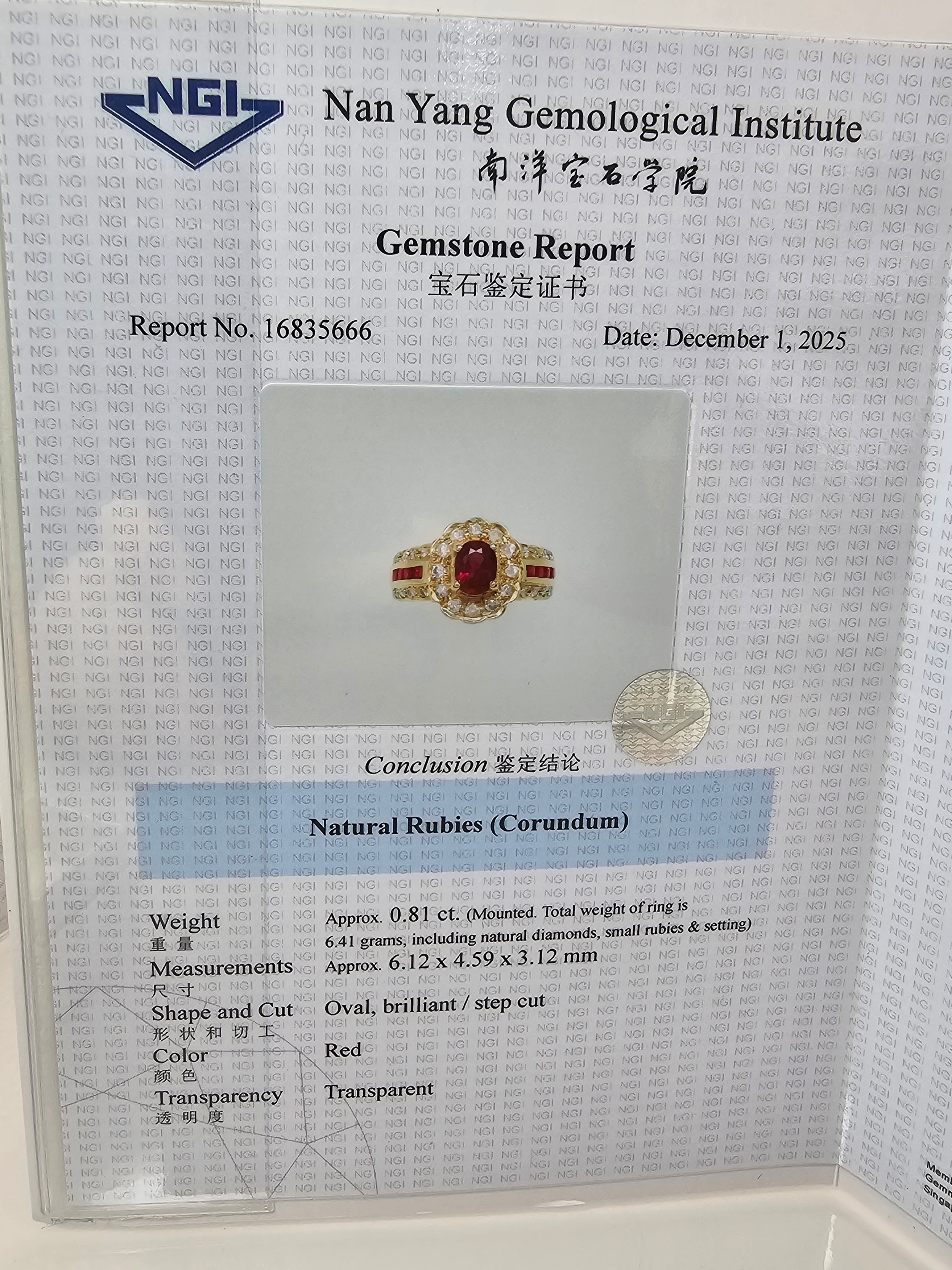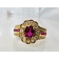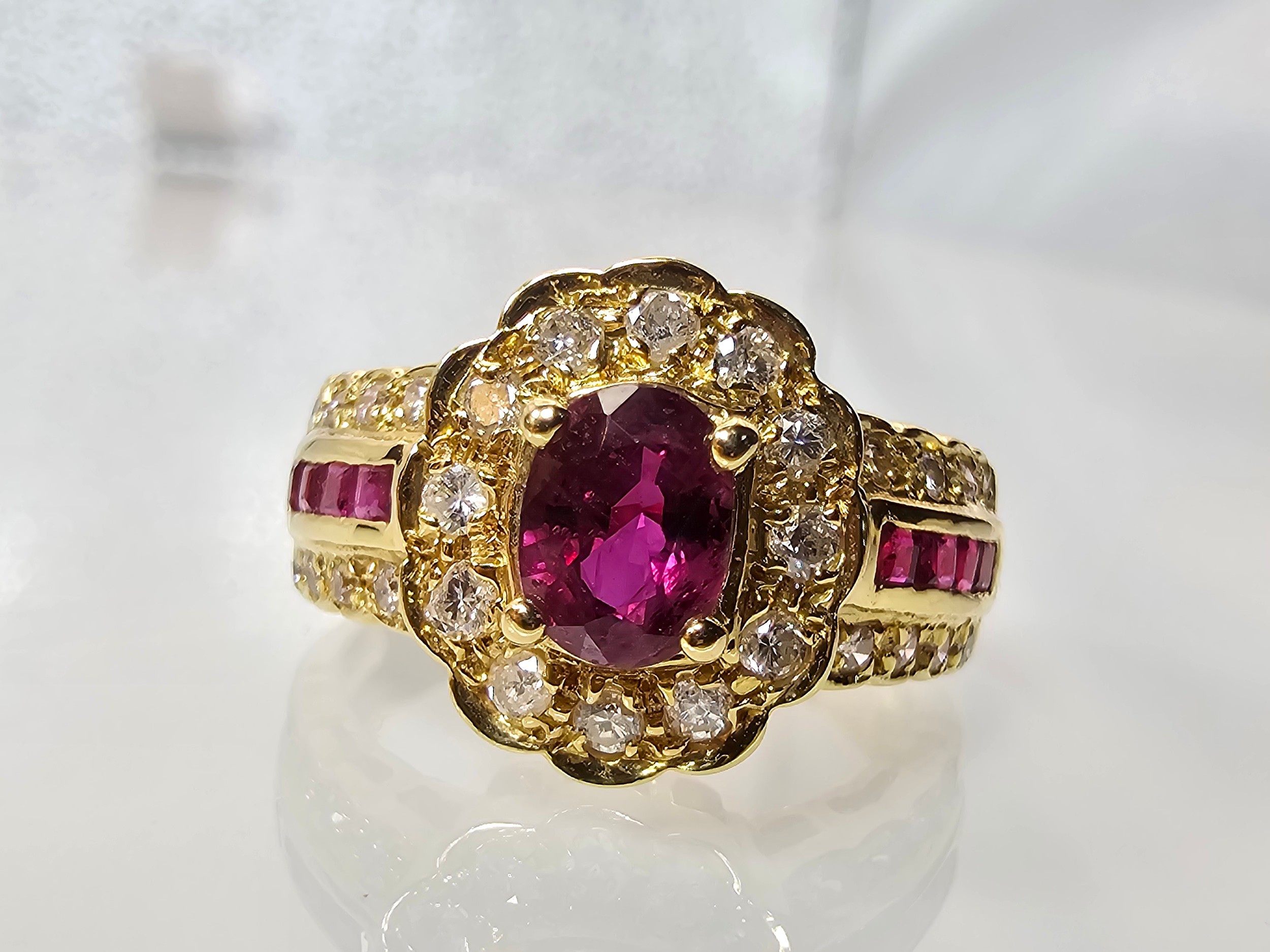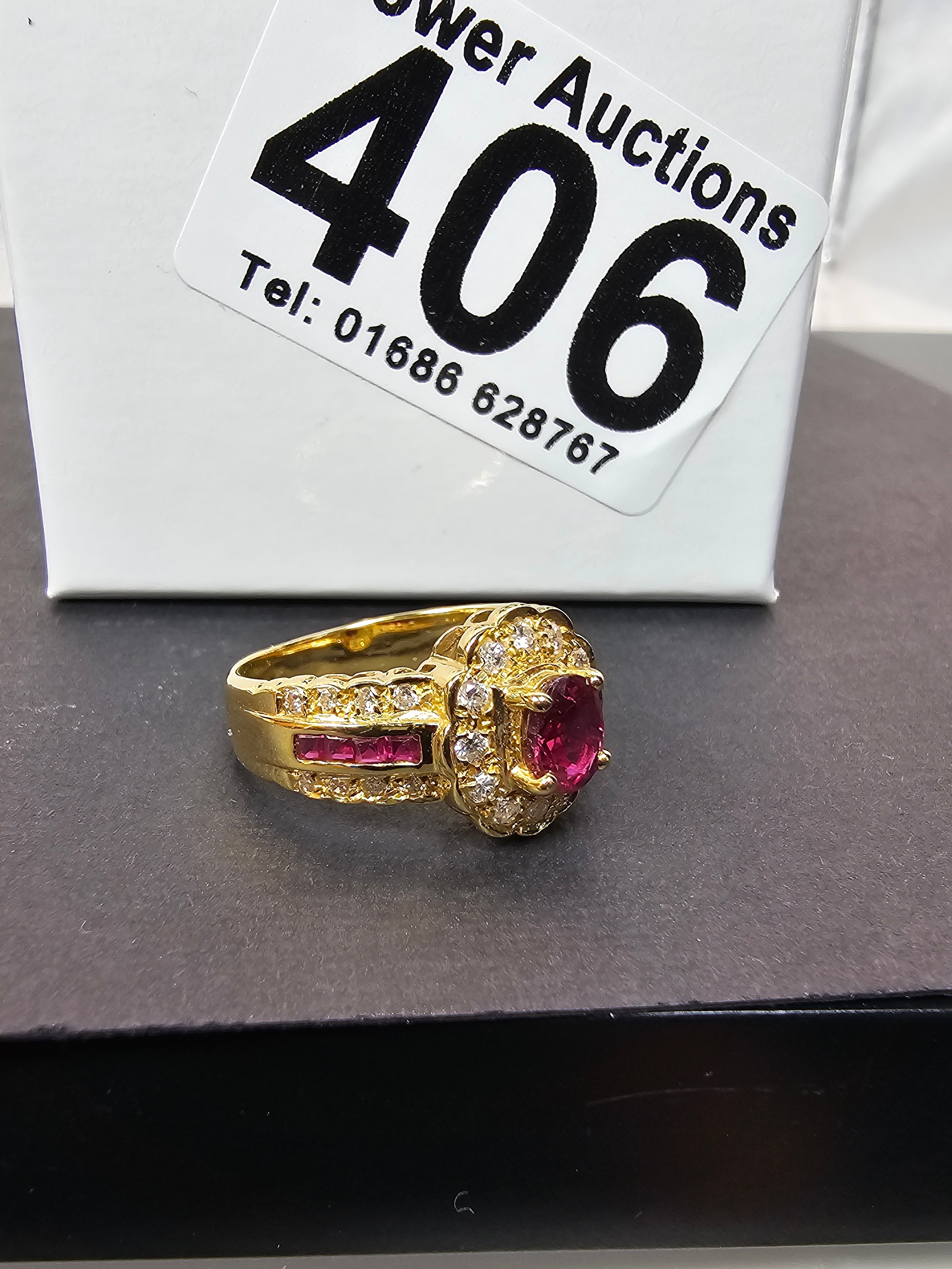 A fine quality 18ct Gold Ruby & Diamond Halo Ring. Claw set with an oval cut natural Ruby weighing 0.81ct, displaying a pleasing red hue, surrounded by a halo of round brilliant cut diamonds, the shoulders further accented with diamond and calibre cut ruby detail stones creating a well balanced and elegant design. Accompanied by it's NGI Gemstone Report confirming the Ruby to be natural with indications of heating, a standard and accepted treatment within the trade. The ring is brand new and displays very nicely. total weight of the ring is 6.14g. Complete with its presenetation box.