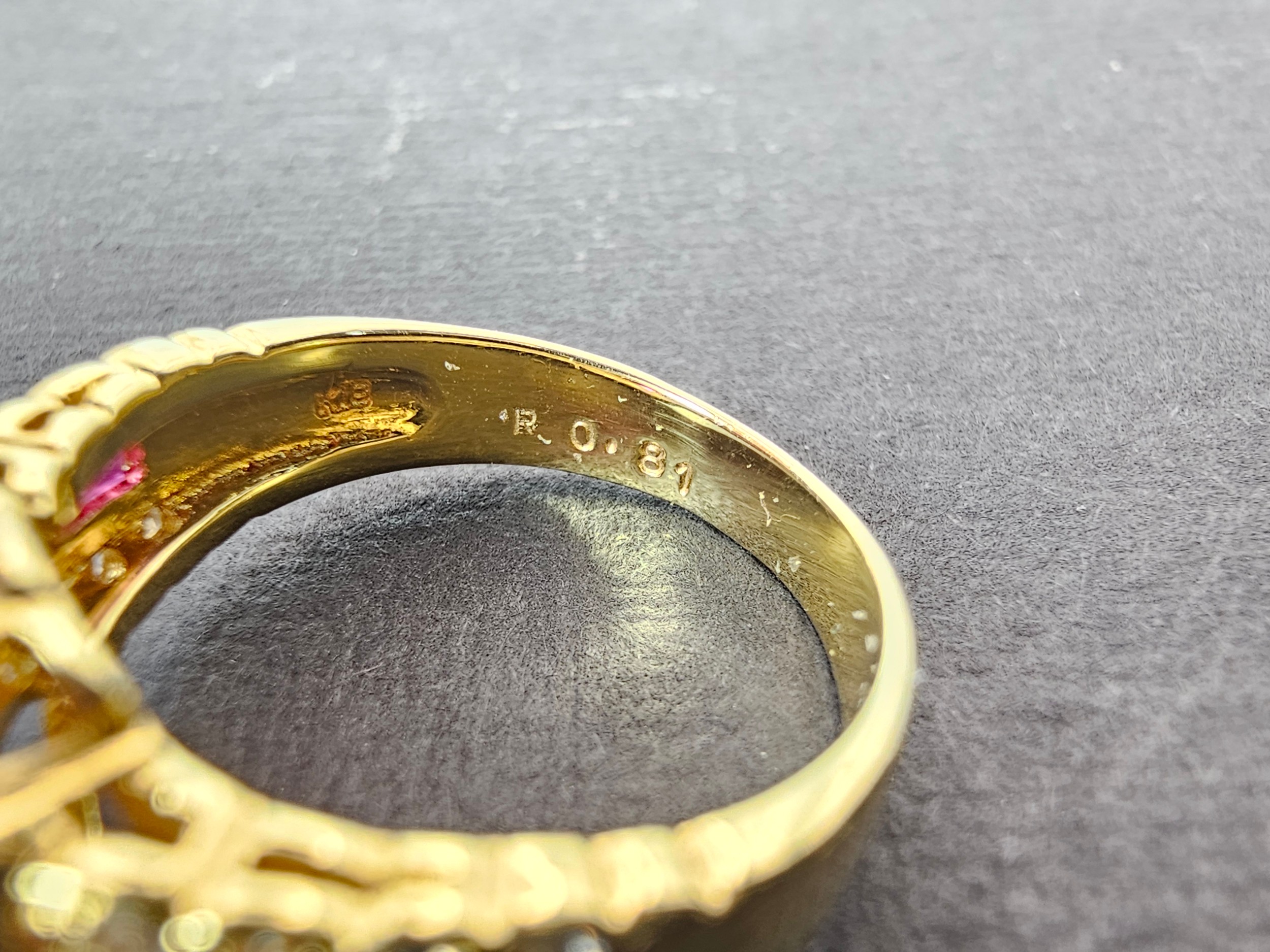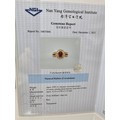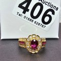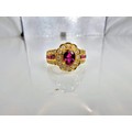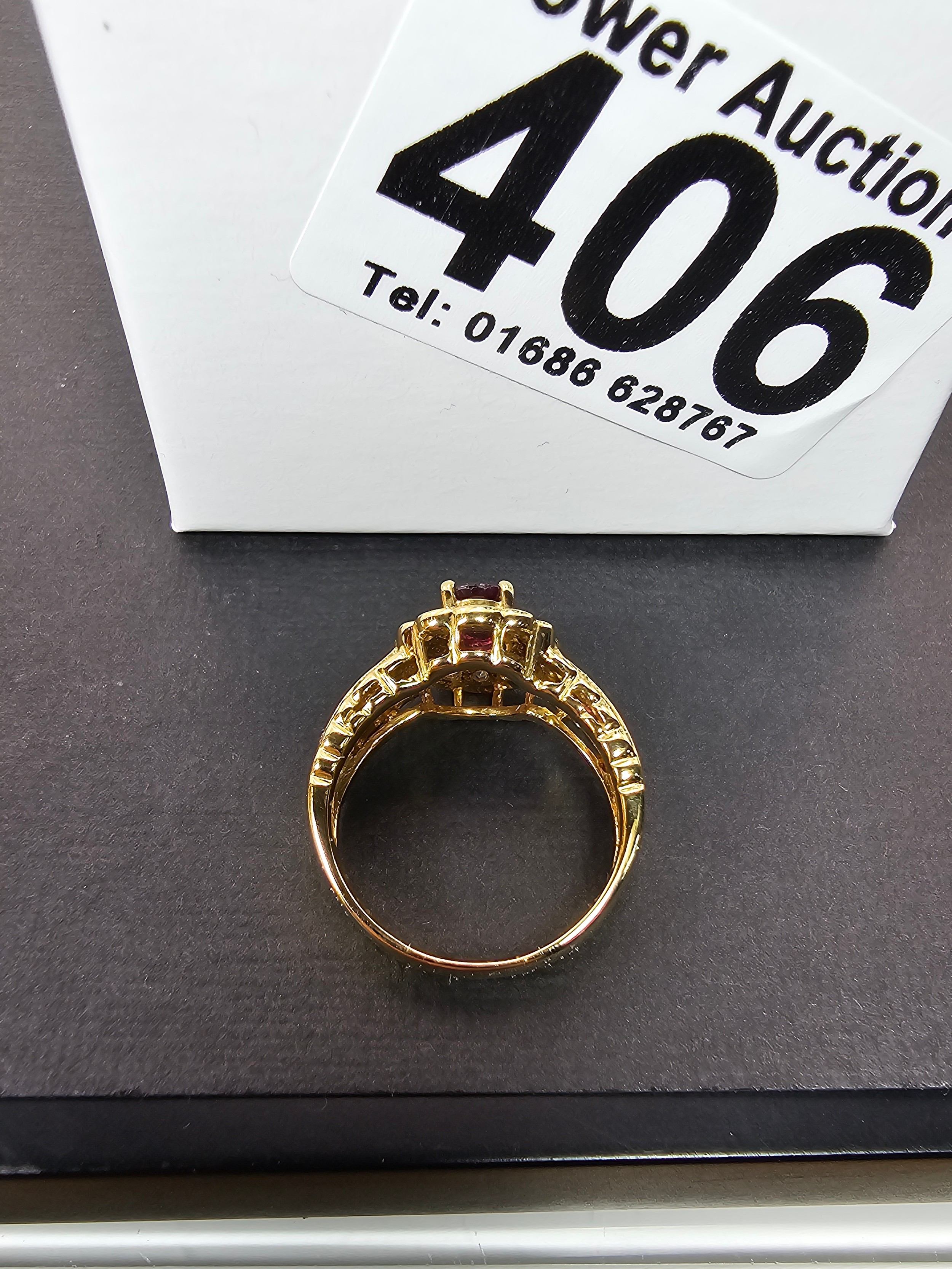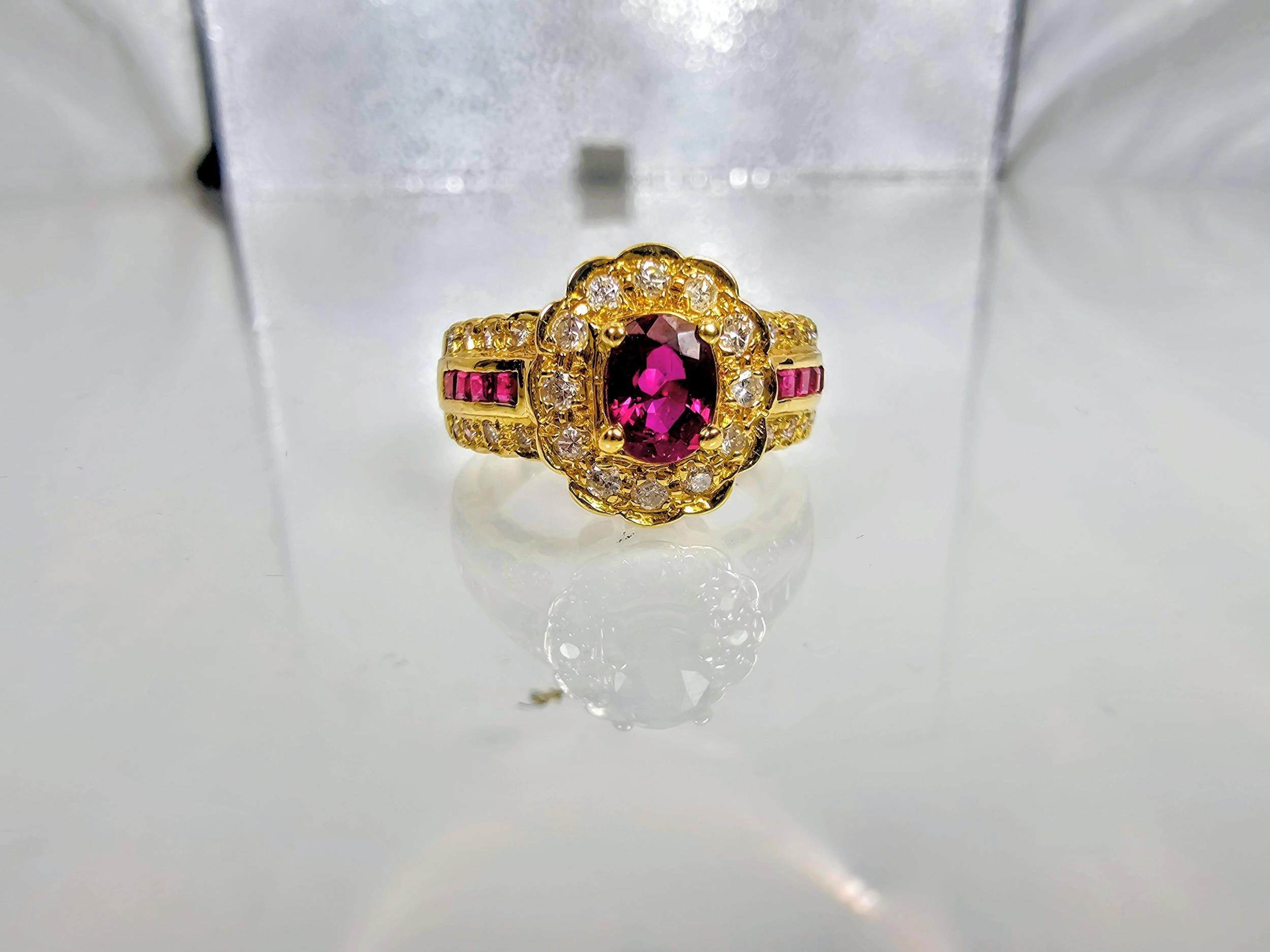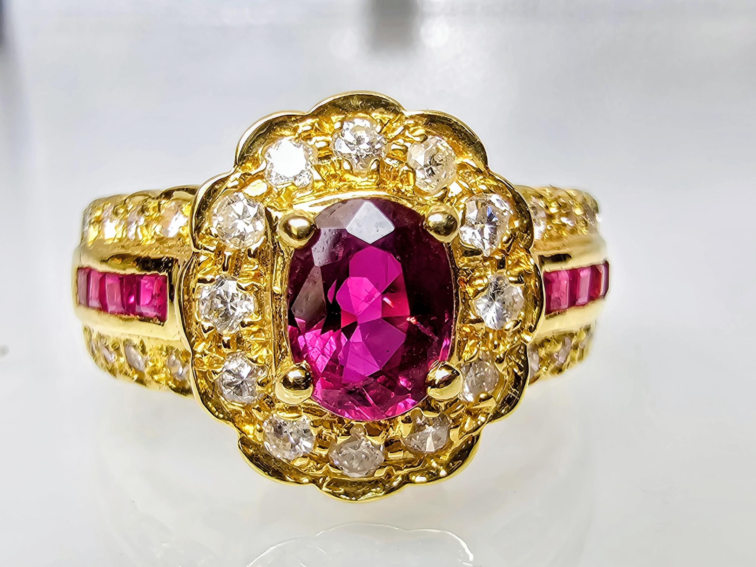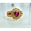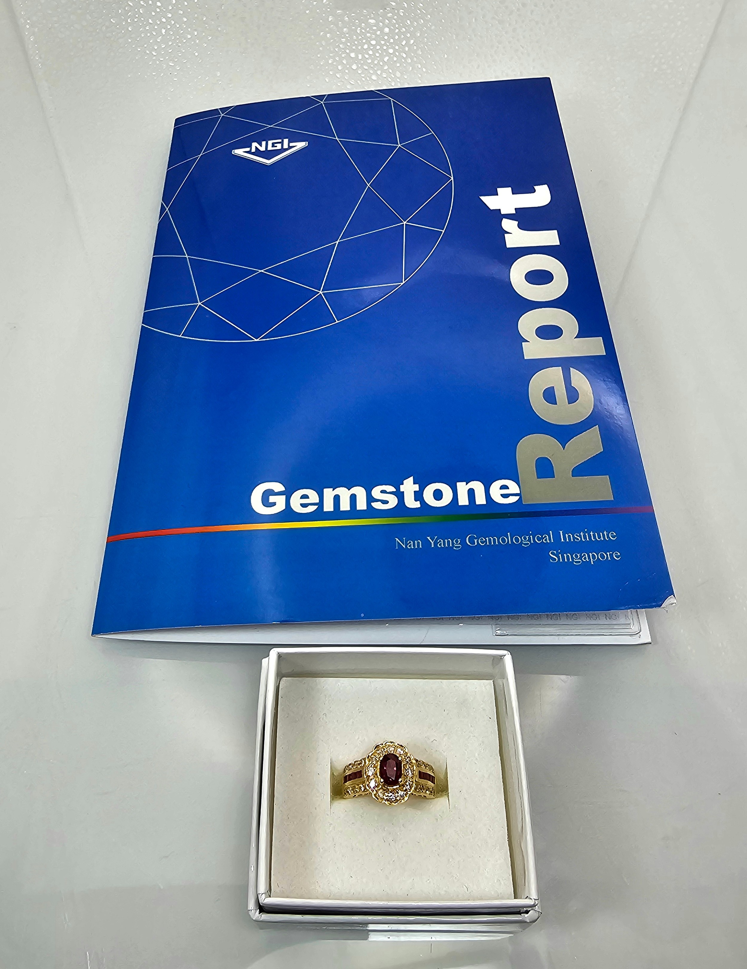 A fine quality 18ct Gold Ruby & Diamond Halo Ring. Claw set with an oval cut natural Ruby weighing 0.81ct, displaying a pleasing red hue, surrounded by a halo of round brilliant cut diamonds, the shoulders further accented with diamond and calibre cut ruby detail stones creating a well balanced and elegant design. Accompanied by it's NGI Gemstone Report confirming the Ruby to be natural with indications of heating, a standard and accepted treatment within the trade. The ring is brand new and displays very nicely. total weight of the ring is 6.14g. Complete with its presenetation box.