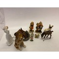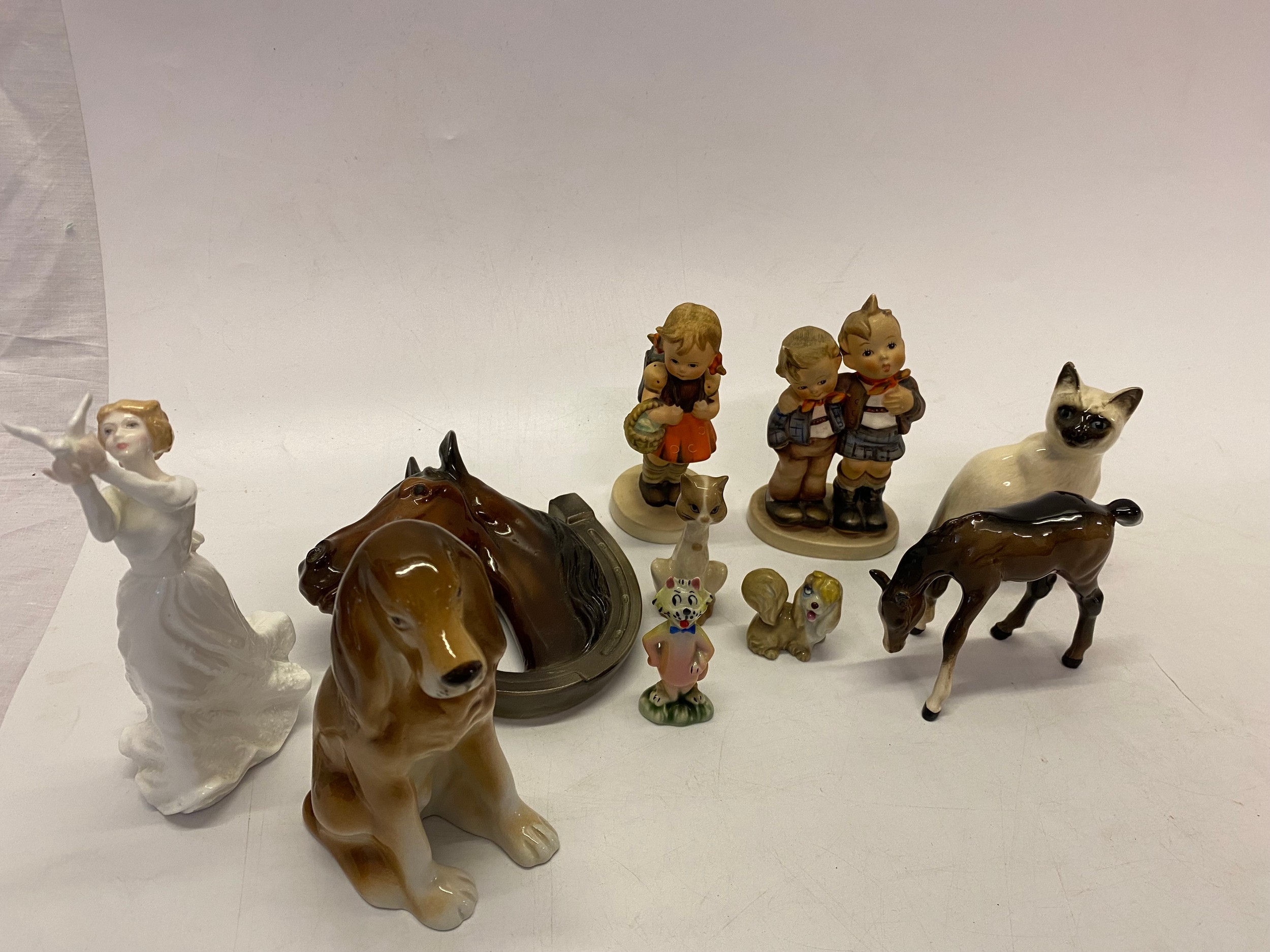 A Royal Doulton figure - Thinking Of You, a Szeiler model of a cat, a Beswick brown glass model of a foal, two Hummel figures, Wade figures, Royal Dux model of a dog, Royal Doulton Siamese cat etc..