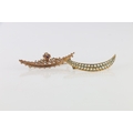 Victorian 9ct gold brooch of crescent shape set with seed pearls having heart surmount set with sapphire stone, 3.1g, 5cm long and an unhallmarked yellow metal crescent brooch set with seed pearls, perhaps 15ct gold, 5g 4.5cm, (2)