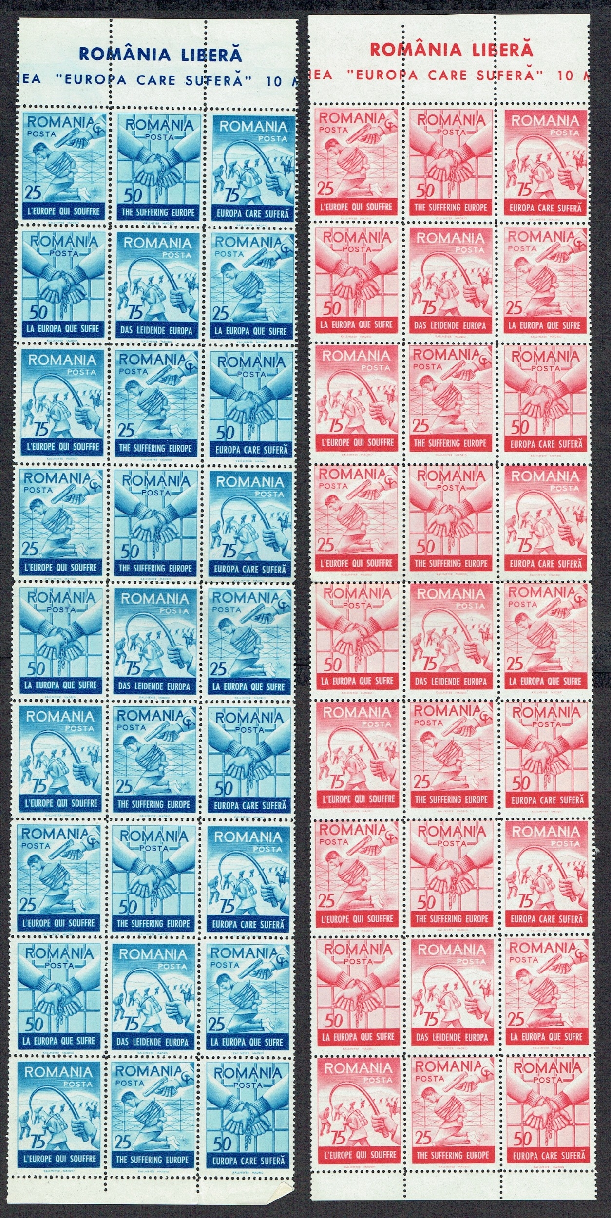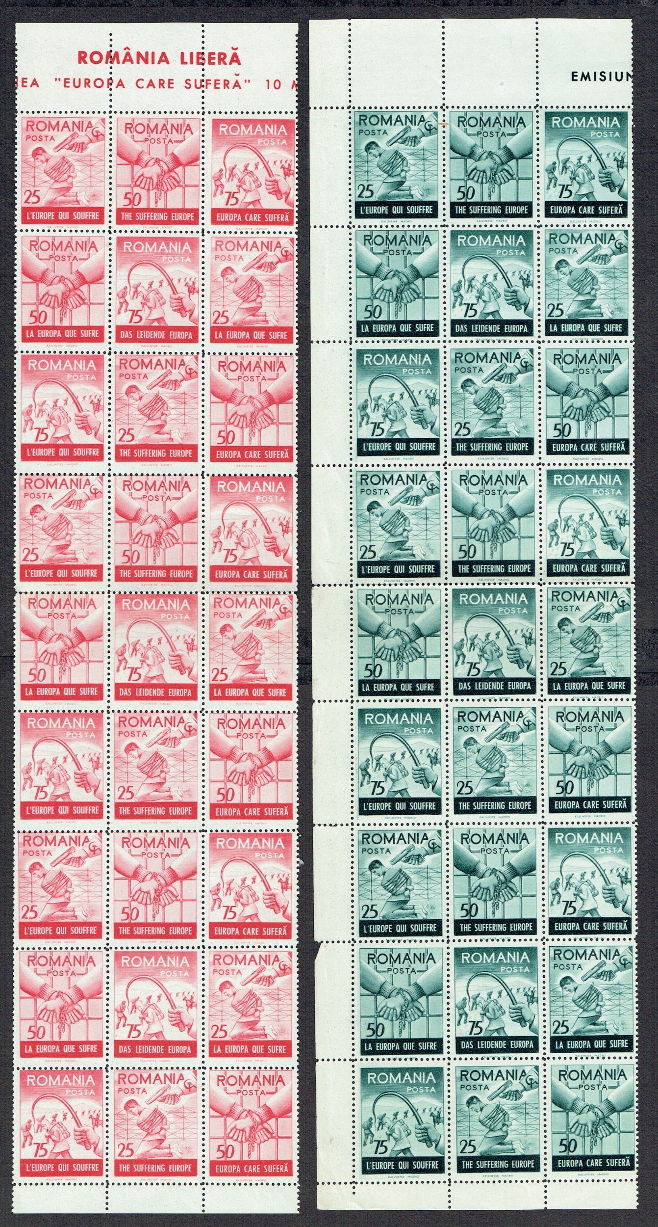 REVENUES & CINDERELLA - Romania Cinderellas: 1959 (10 May) Europe that suffers 3 values in 3 different colours unmounted mint stock of setenant blocks of 27 mainly of blue-green issue (26 blocks), Blue (7 blocks), red (3 blocks), each for face values of 2 x 25b, 3 x 75b & 3 x 50b. 15,000 blocks of 9 were printed. (972 labels).