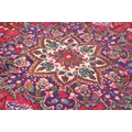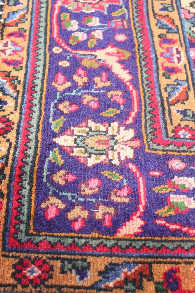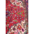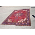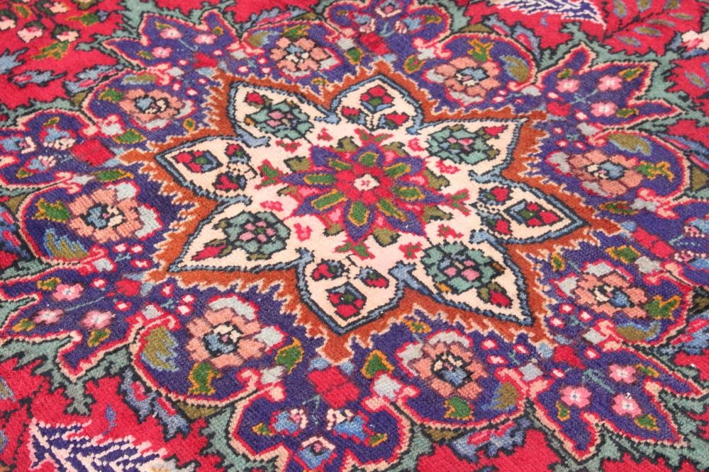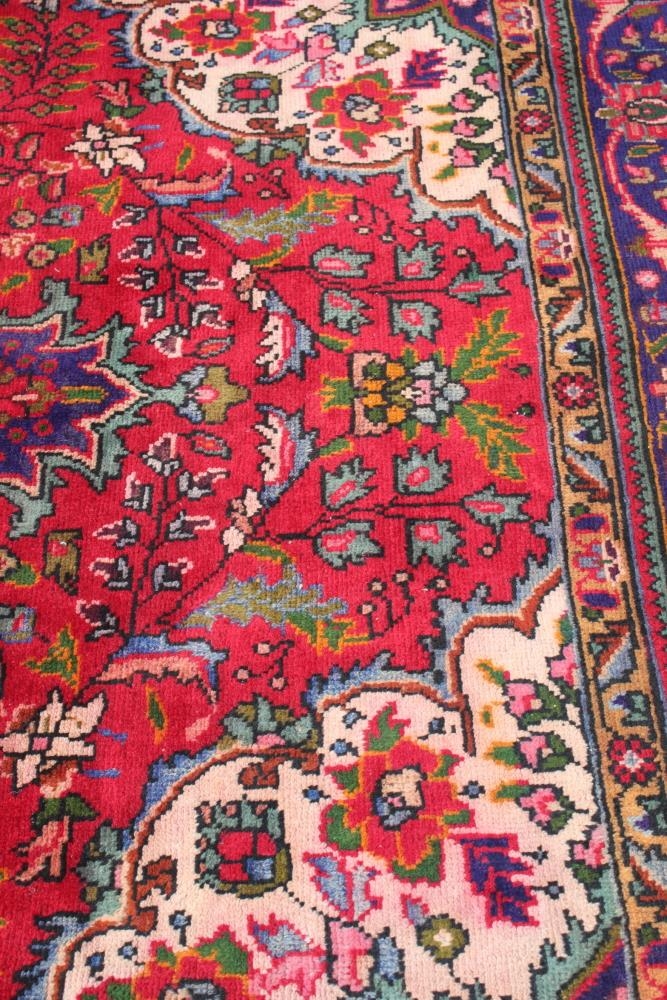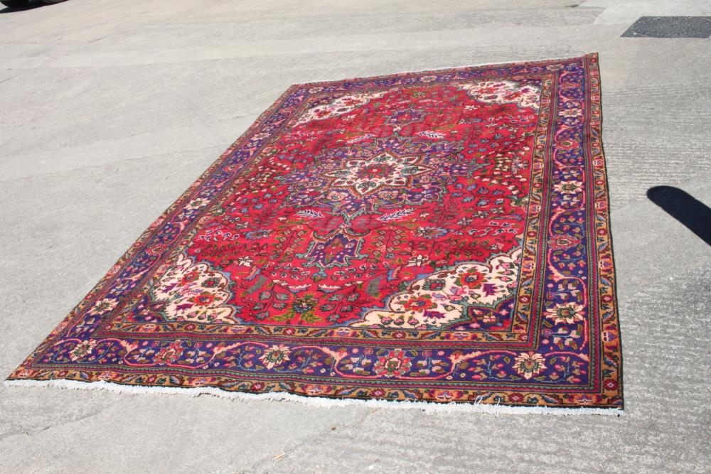 A vintage Persian Tabriz rug with central floral medallion design on a red ground with multi-borders, 117" x 77" approx