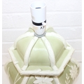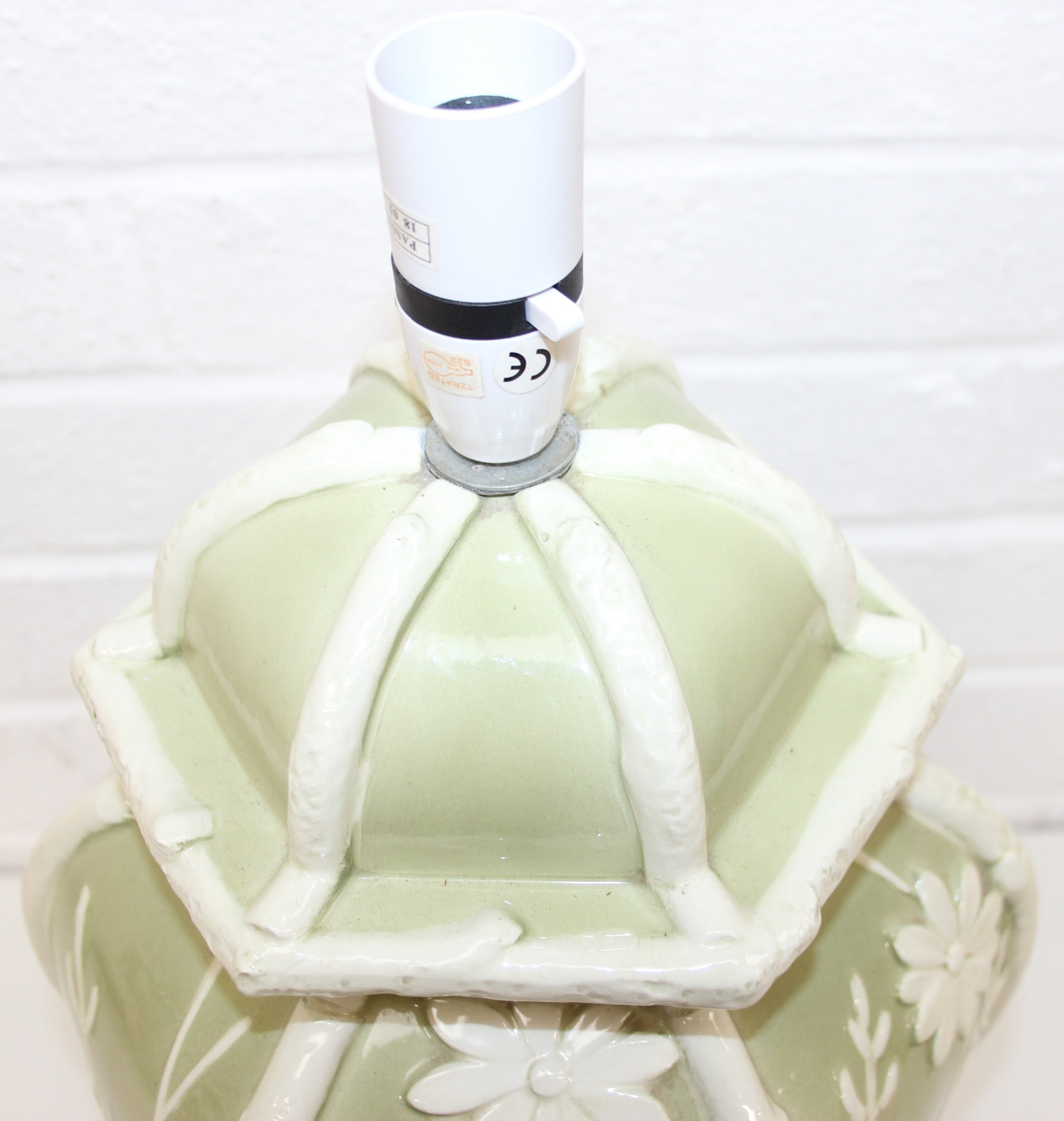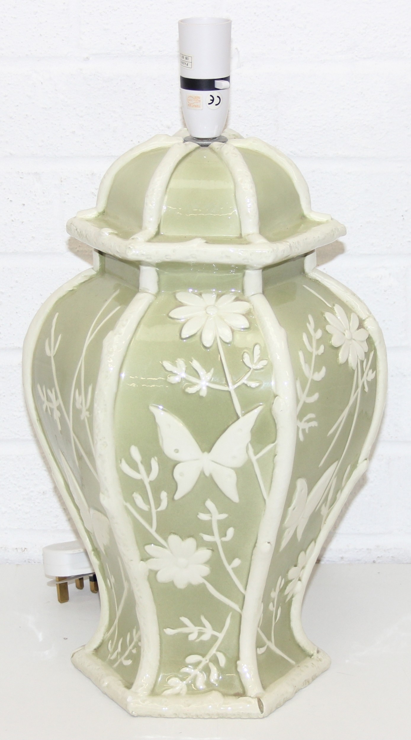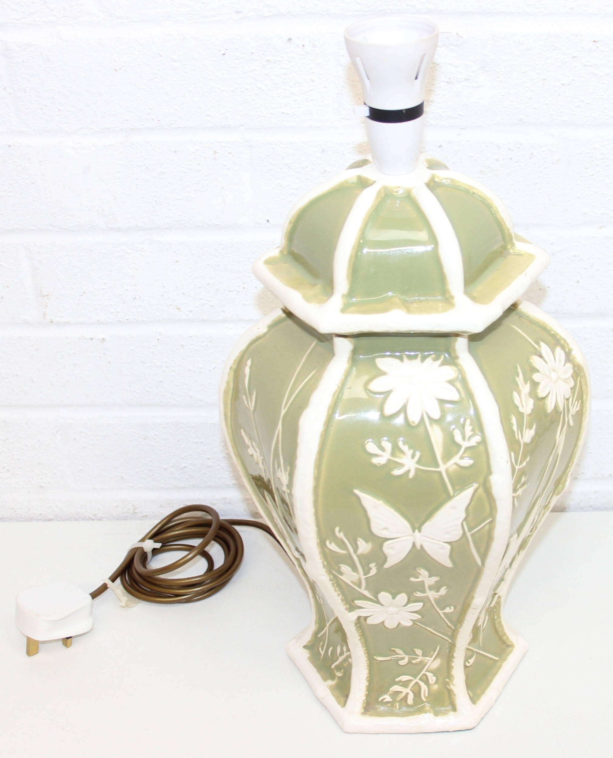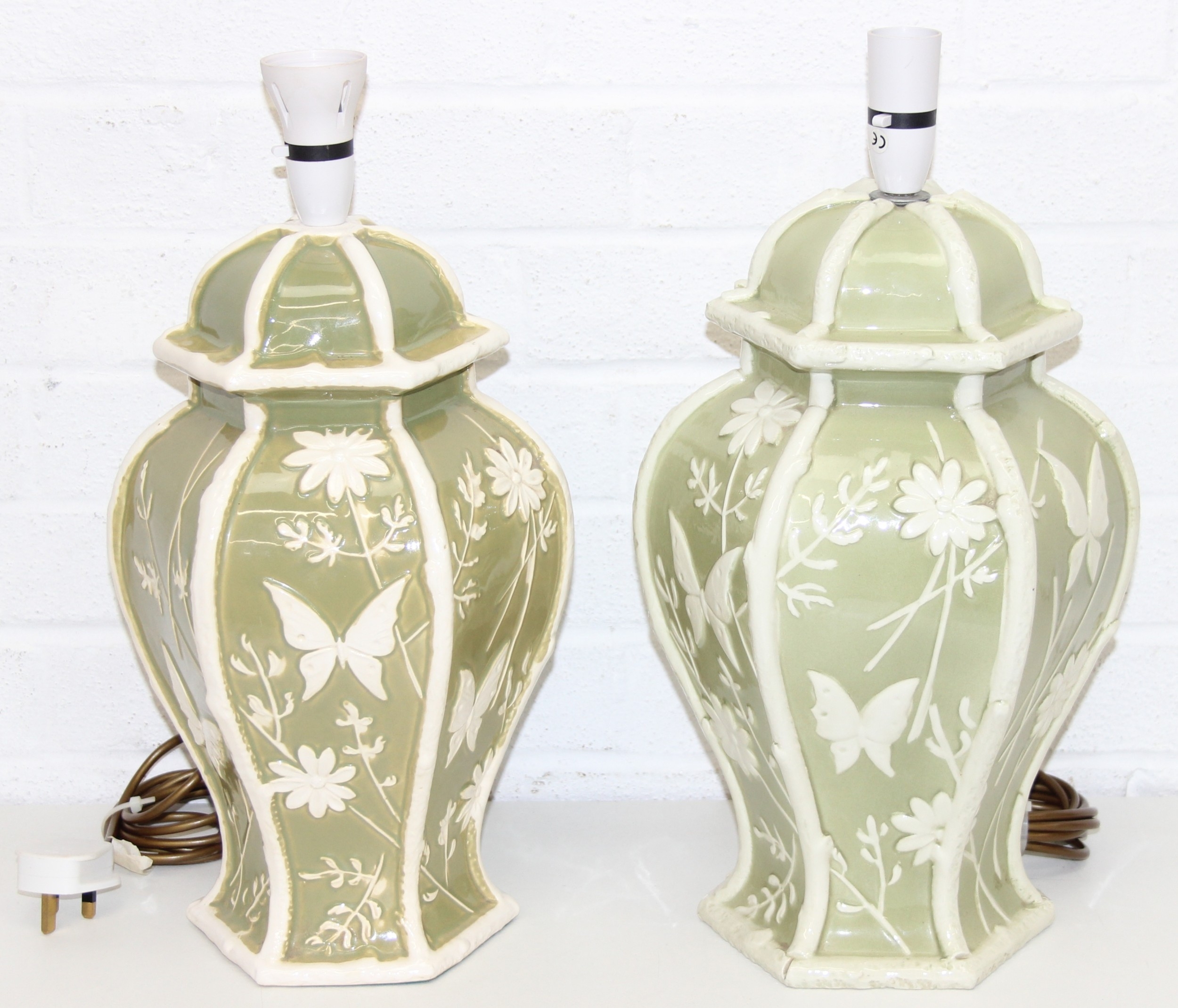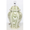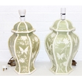 A pair of Chinese style pottery table lamps, the body formed as a Celadon hexagonal green base decorated with white flowers and butterflies, no shades, each 48cm tall