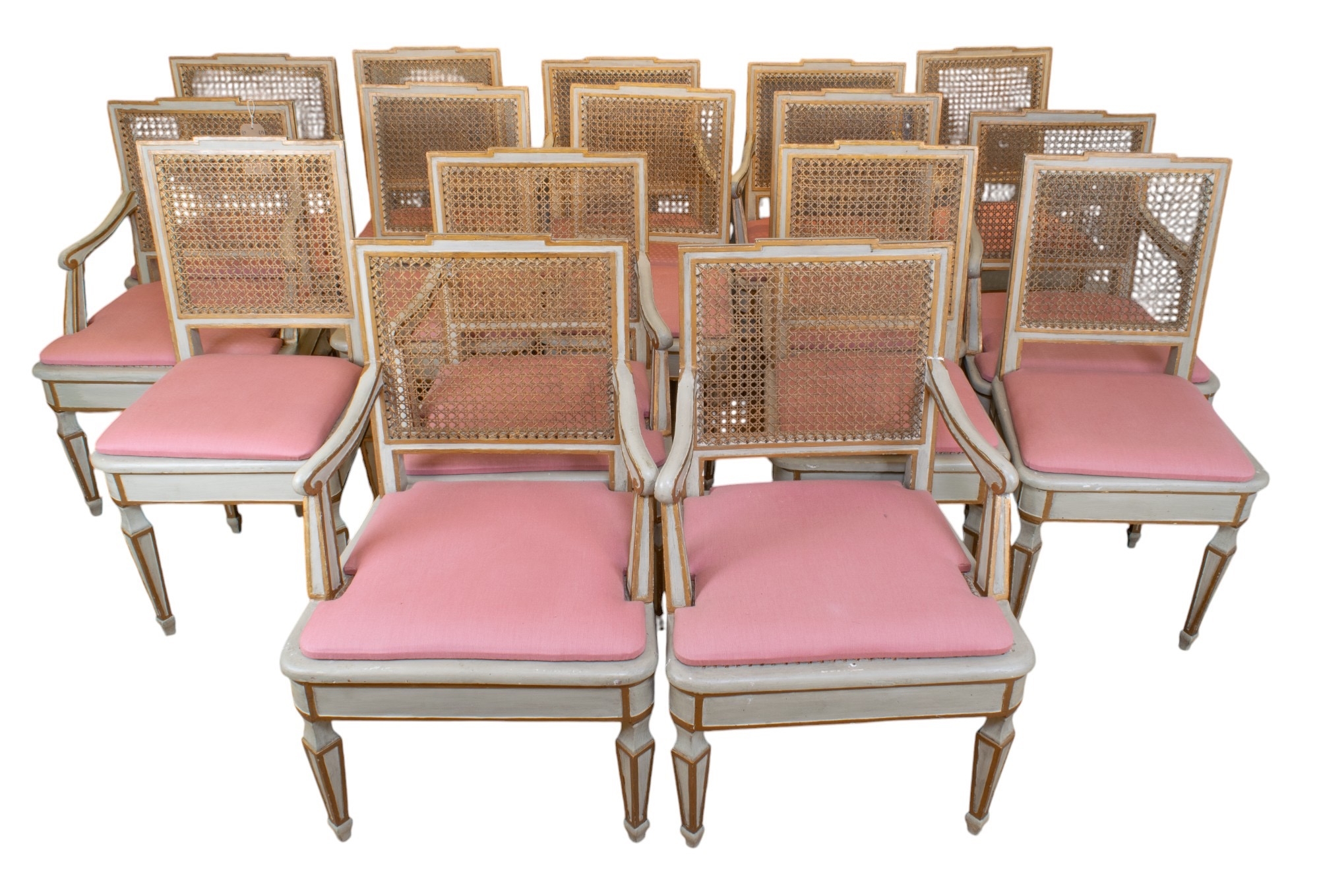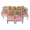 A set of sixteen grey painted antique chairs, with drop on pink upholstered seats on and cane seats and backs