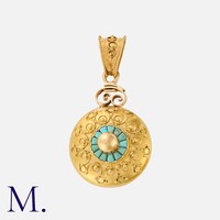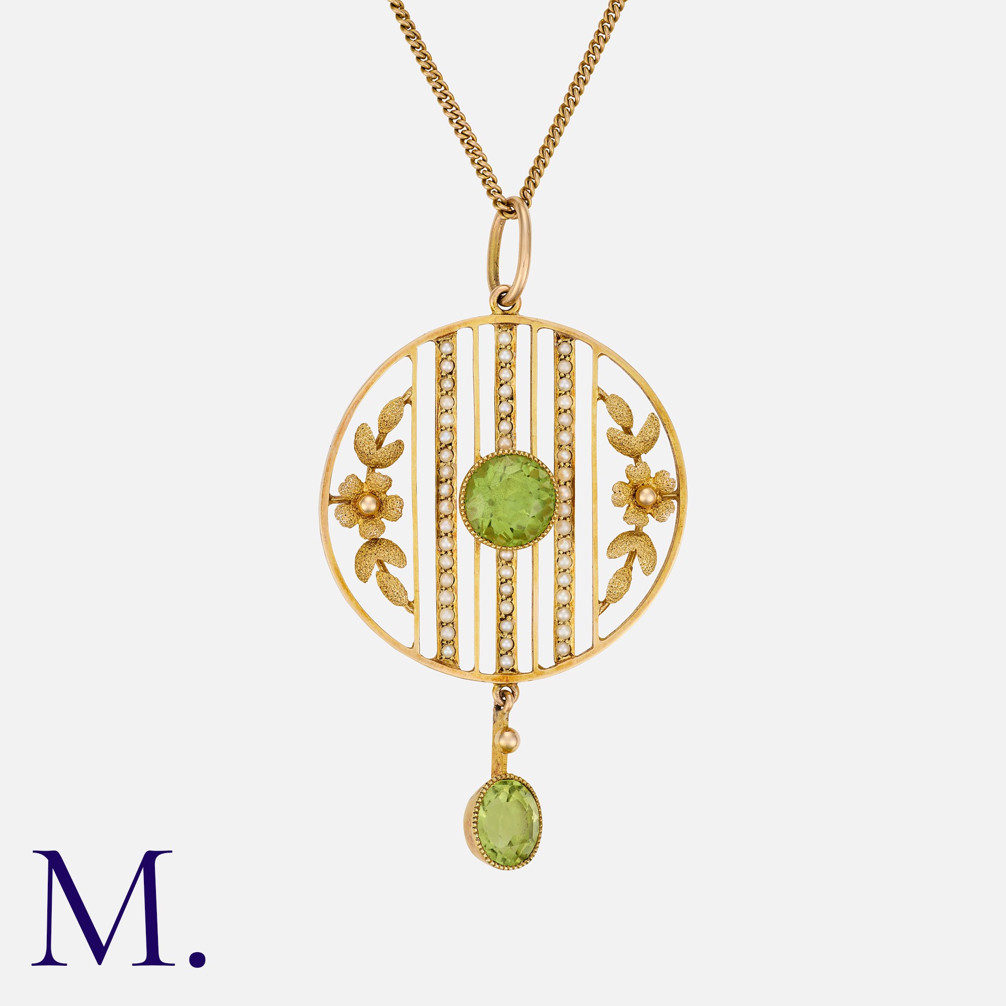 An Edwardian Peridot and Pearl Pendant Necklace in 15 carat yellow gold, of openwork circular form, set with a central round cut peridot, accented by three pearl set bars and floral motifs, suspending a pear shaped peridot drop. Marked 15ct. Chain Marked 9ct. Accompanied by a Collingwood & son's box.