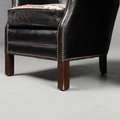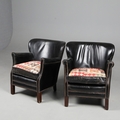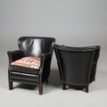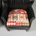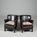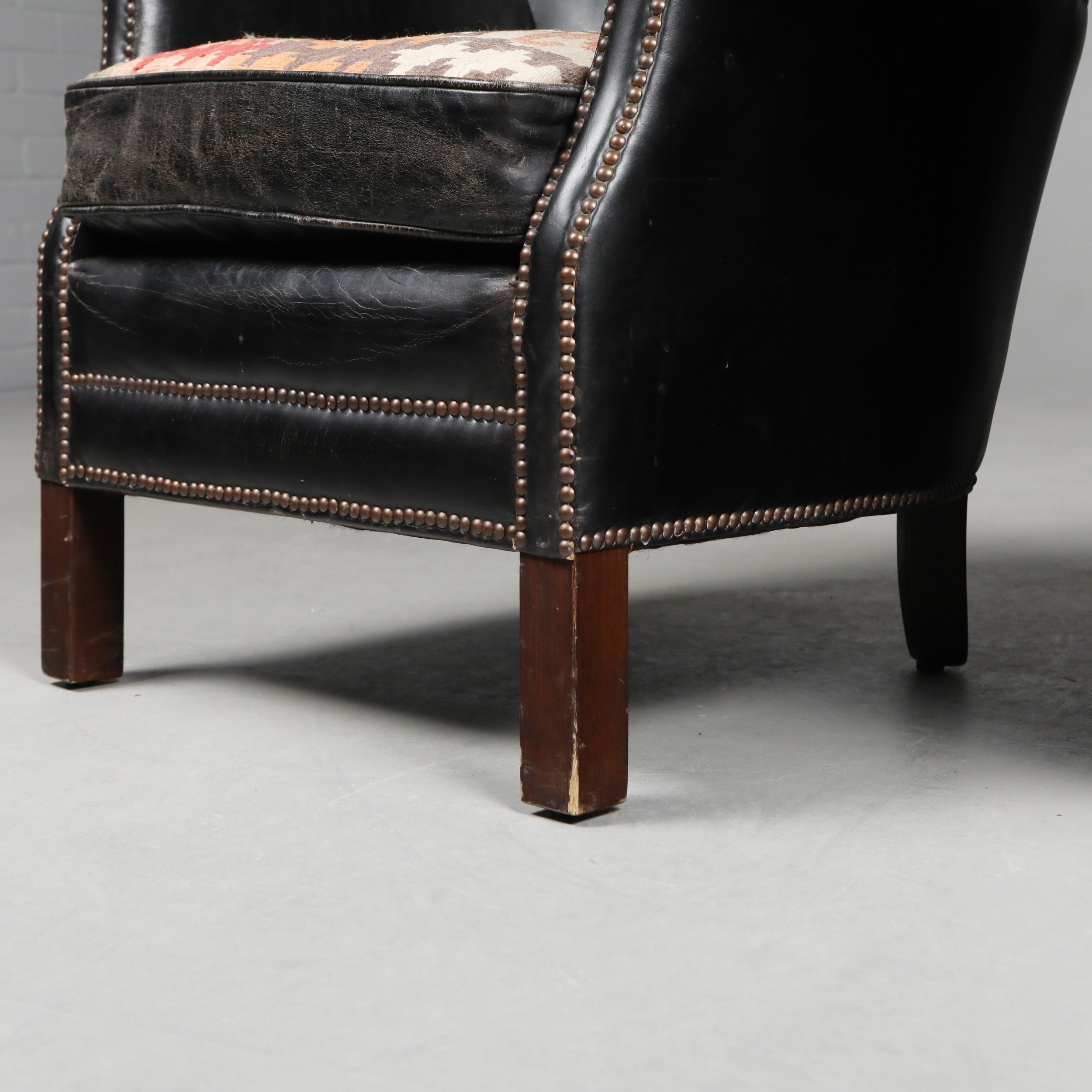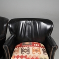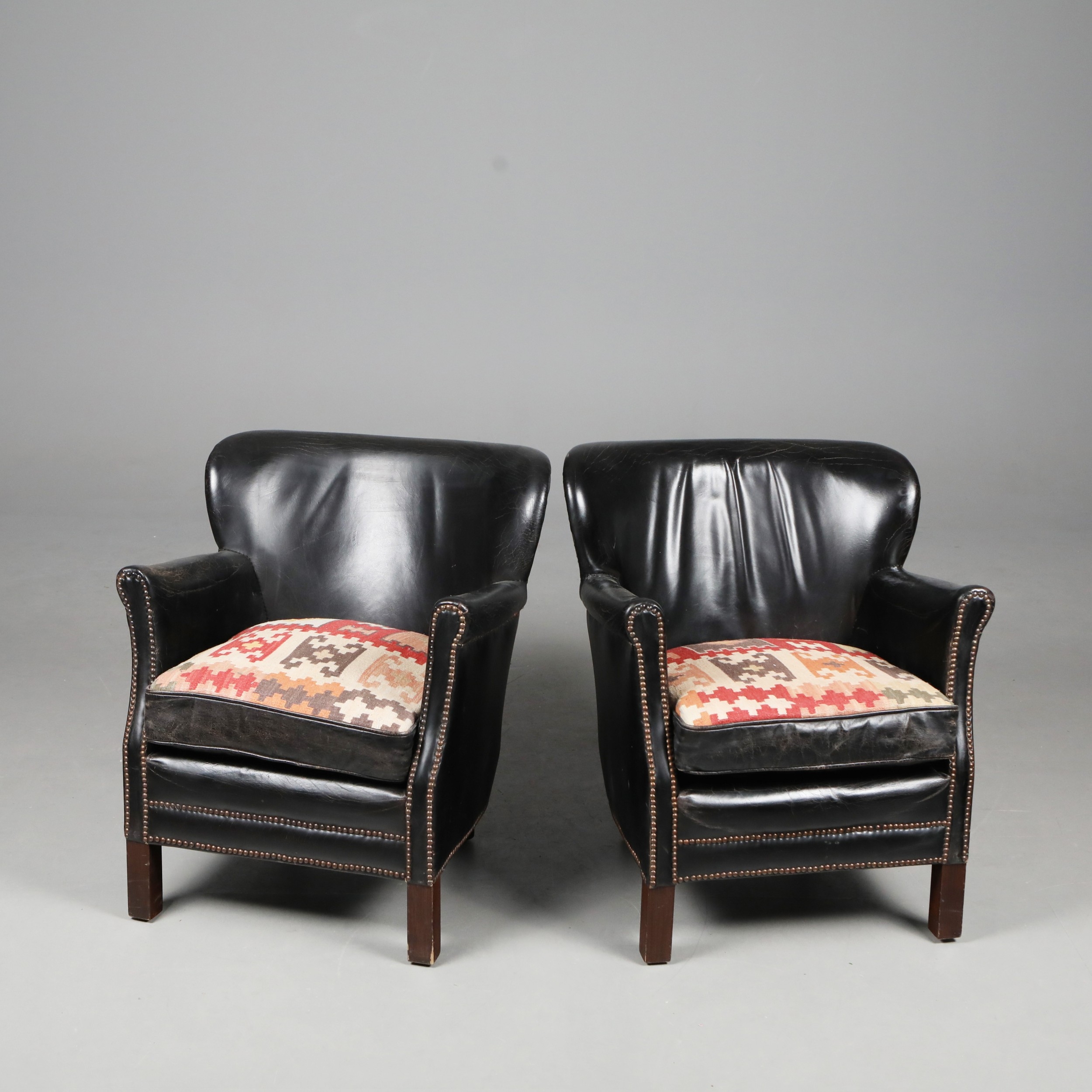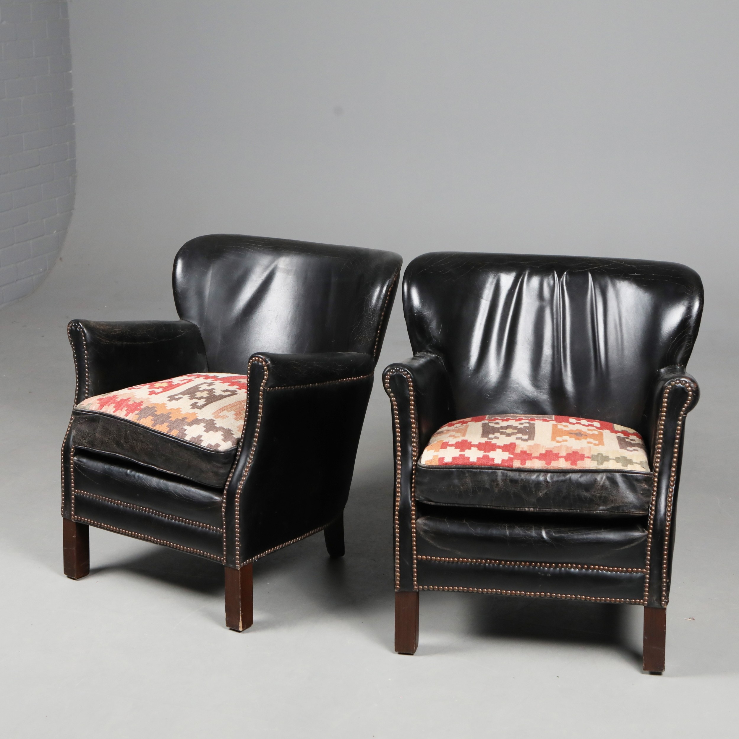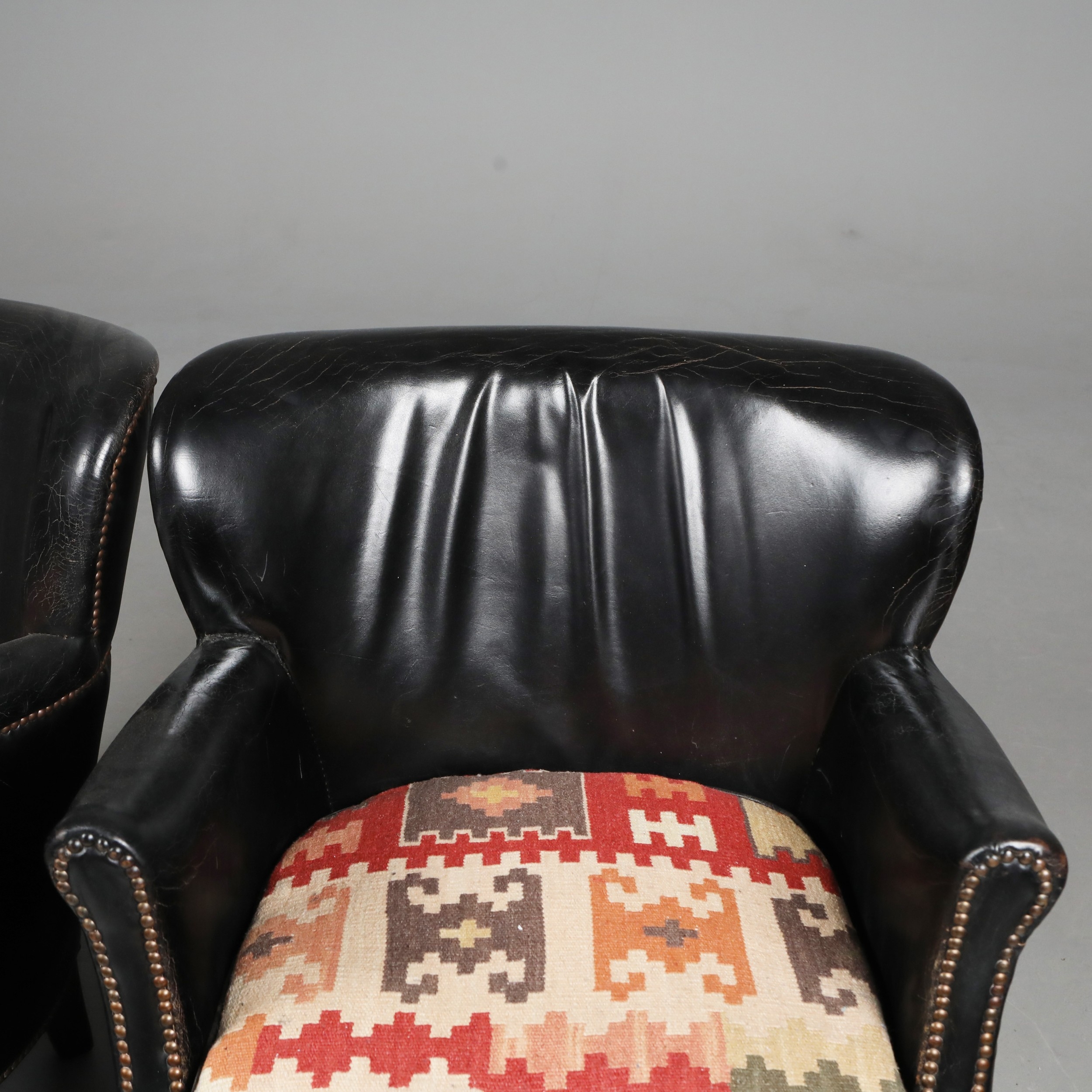 ATTRIBUTED TO ANDREW MARTIN ARMCHAIRS, A PAIR. black leather with reversible kilim seat cushions, 74cm H x 68cm W x 73cm D. (2).