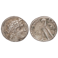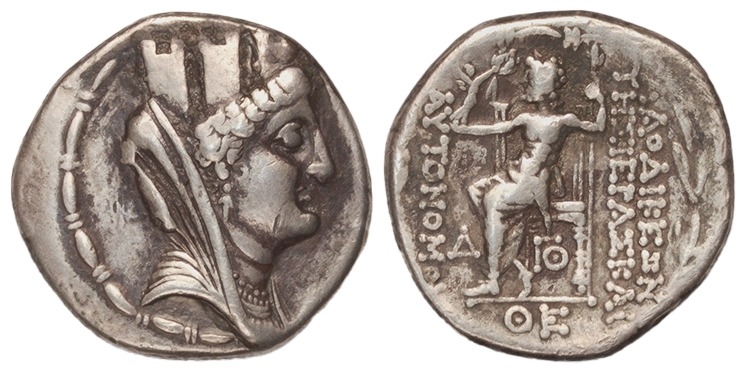 Ancient Greek: Seleucis and Pieria, Laodicea ad Mare autonomous era silver Tetradrachm, dated Δ (year 4) = 80-79 BC. Turreted, veiled and draped bust of Tyche r.; fillet border. / ΛΑΟΔΙΚΕΩΝ, ΤΗΣ ΙΕΡΑΣ ΚΑΙ, ΑΥΤΟΝΟΜΟΥ, Zeus seated l., holding, in his right hand, Nike bearing a wreath to right, and in his left a long sceptre; in the inner left field date Δ; beneath throne ΓΘ; in the exergue ΘΕ. 14.88g. Fine.