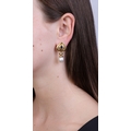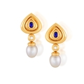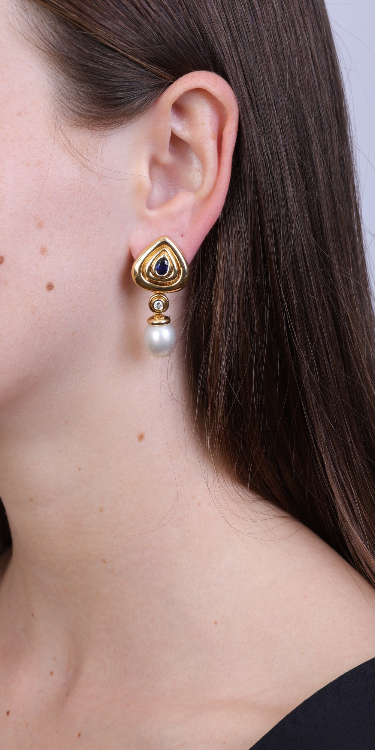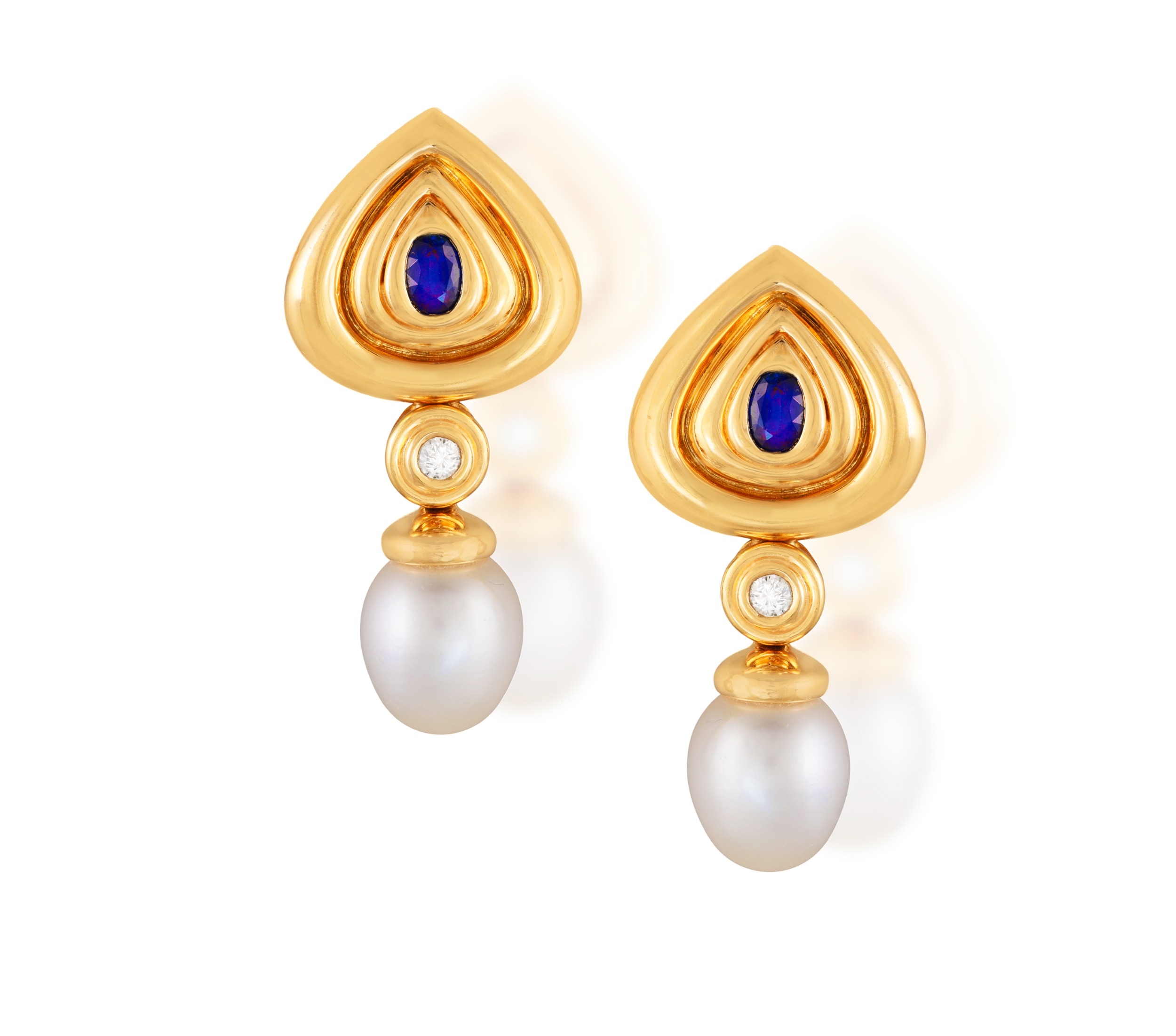 A PAIR OF CULTURED PEARL, SAPPHIRE AND DIAMOND PENDENT EARRINGS Each polished triangular-shaped mount of reeded design, centring an oval-shaped sapphire, suspending a drop-shaped cultured pearl of white tint, to a brilliant-cut diamond spacer, mounted in 18K gold, French assay marks, length 4.4cm