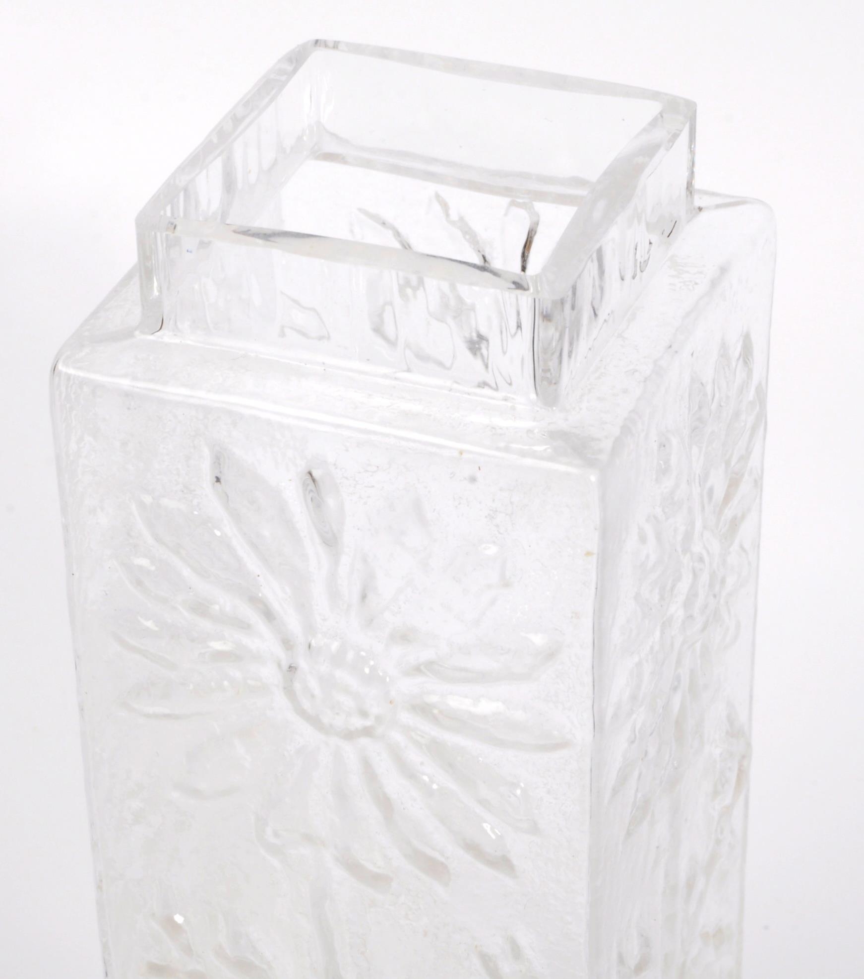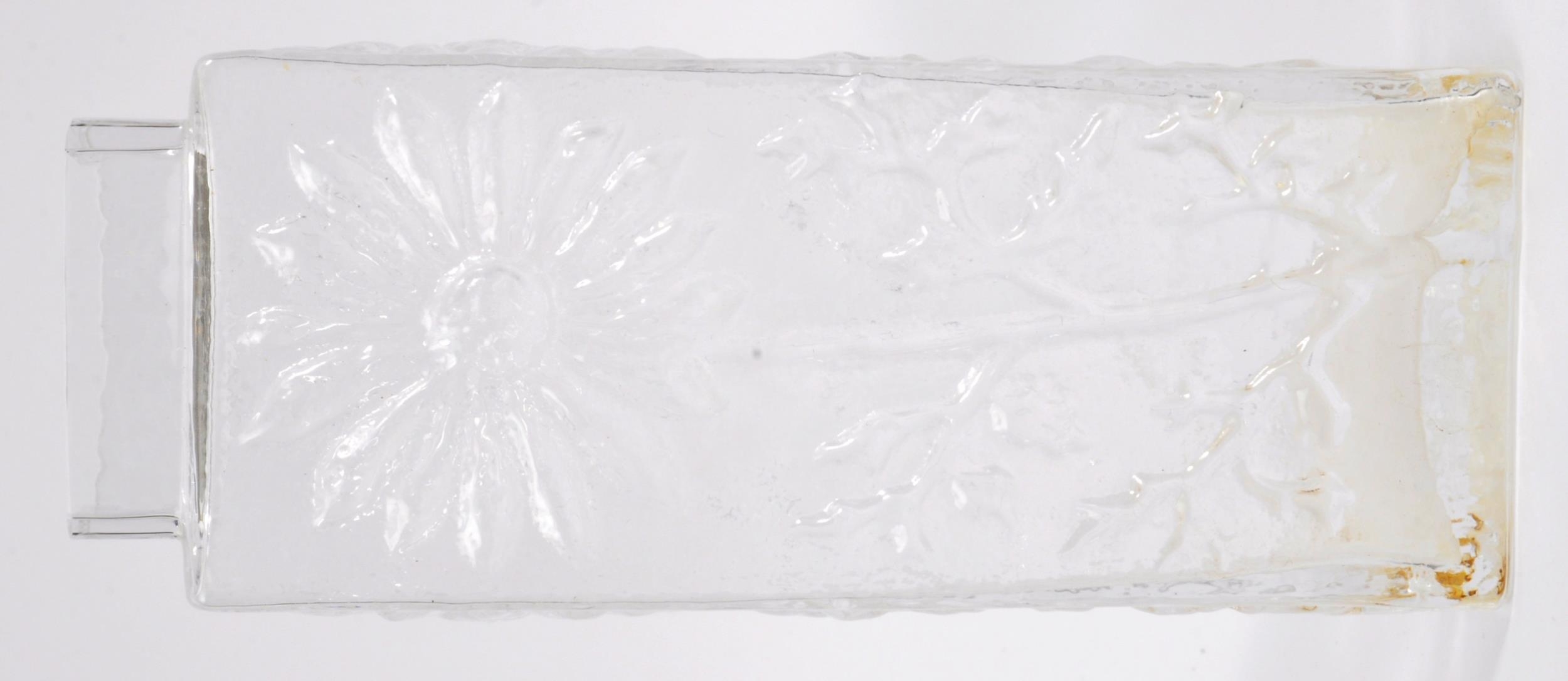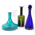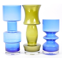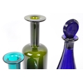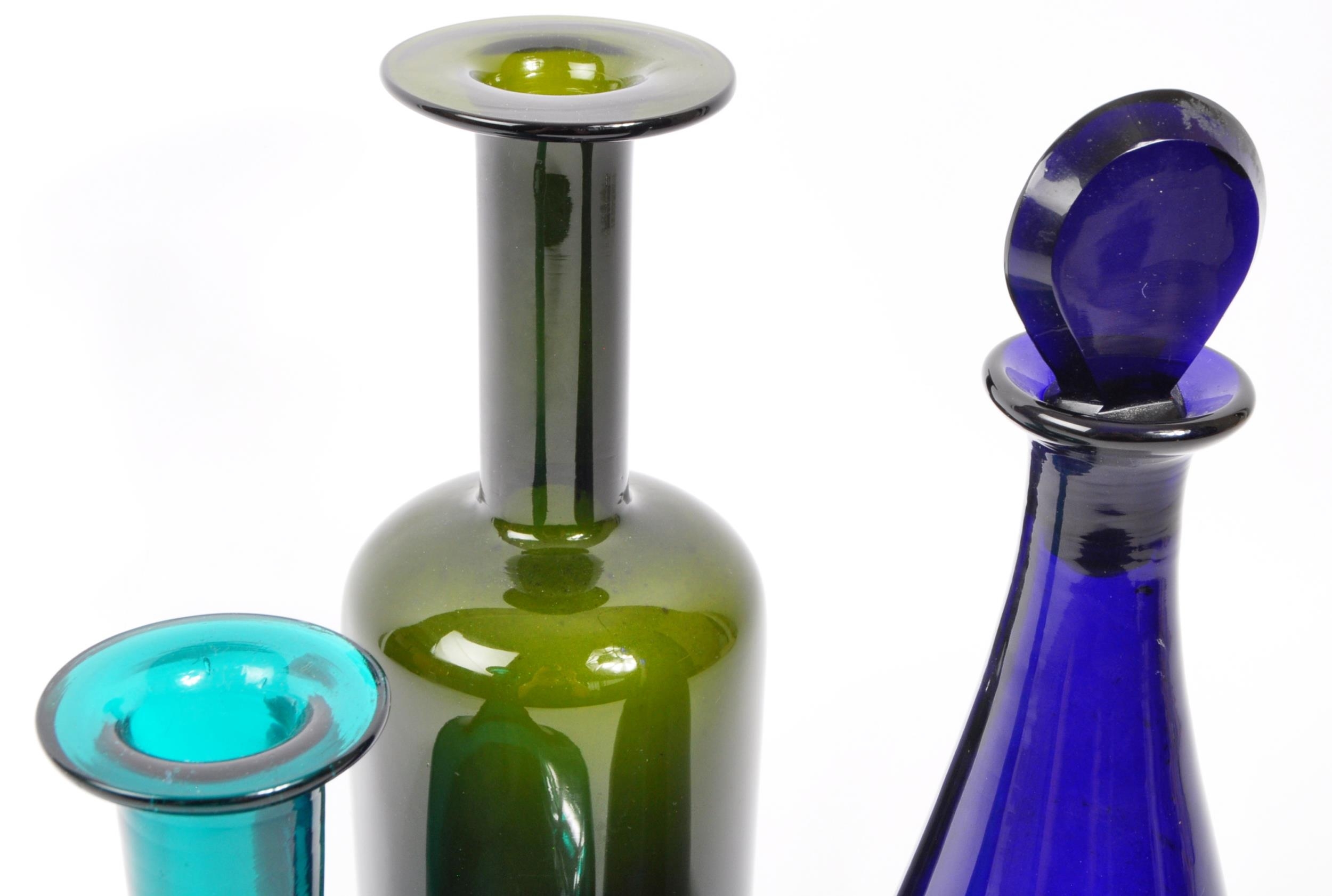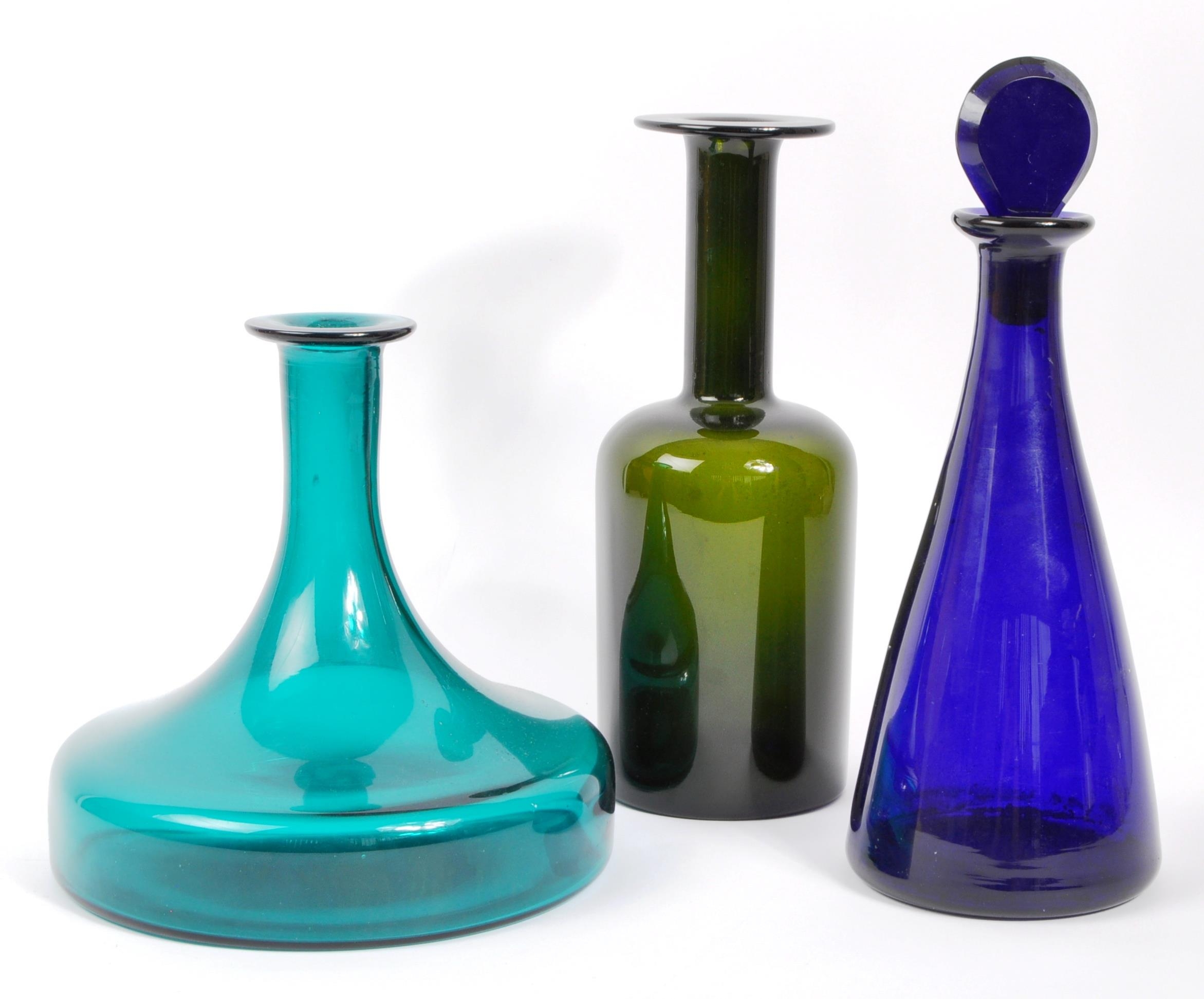 A collection of vintage retro mid 20th century studio glass to include a Otto Brauer Gull vase, a vase in the manner of Dartington flower vase with impressed marguerites to surface, a Bristol Blue decanter (stopper unmatched). Measures 26cm tall.