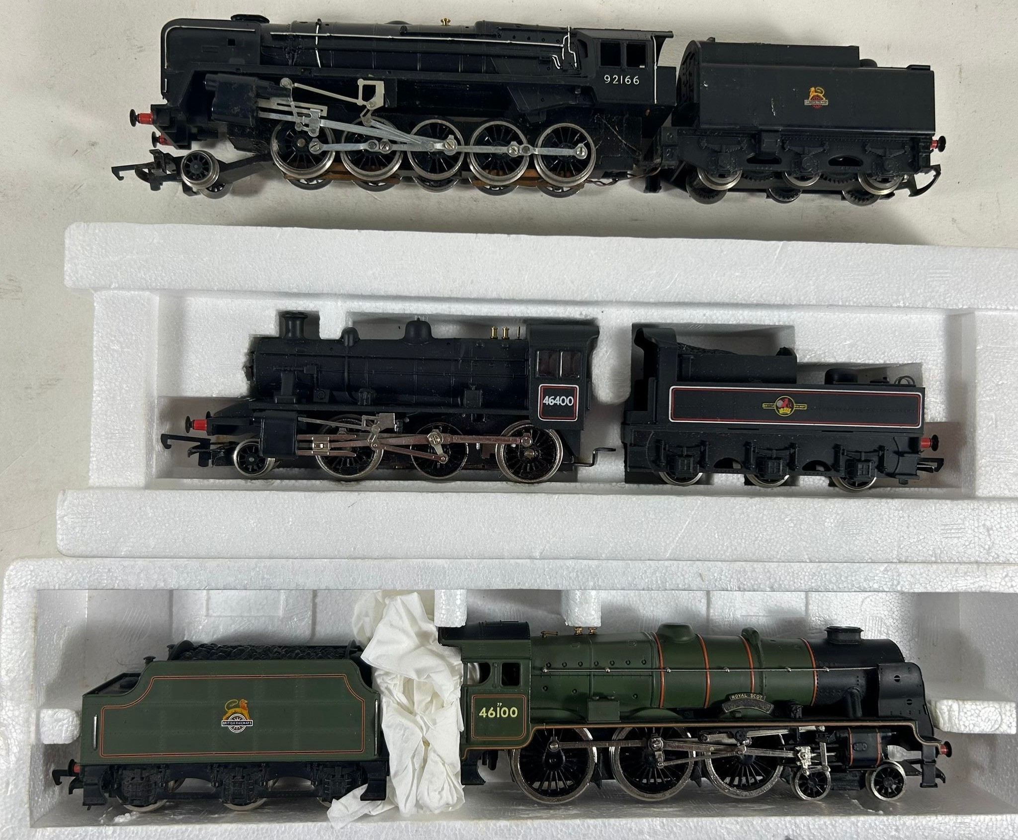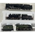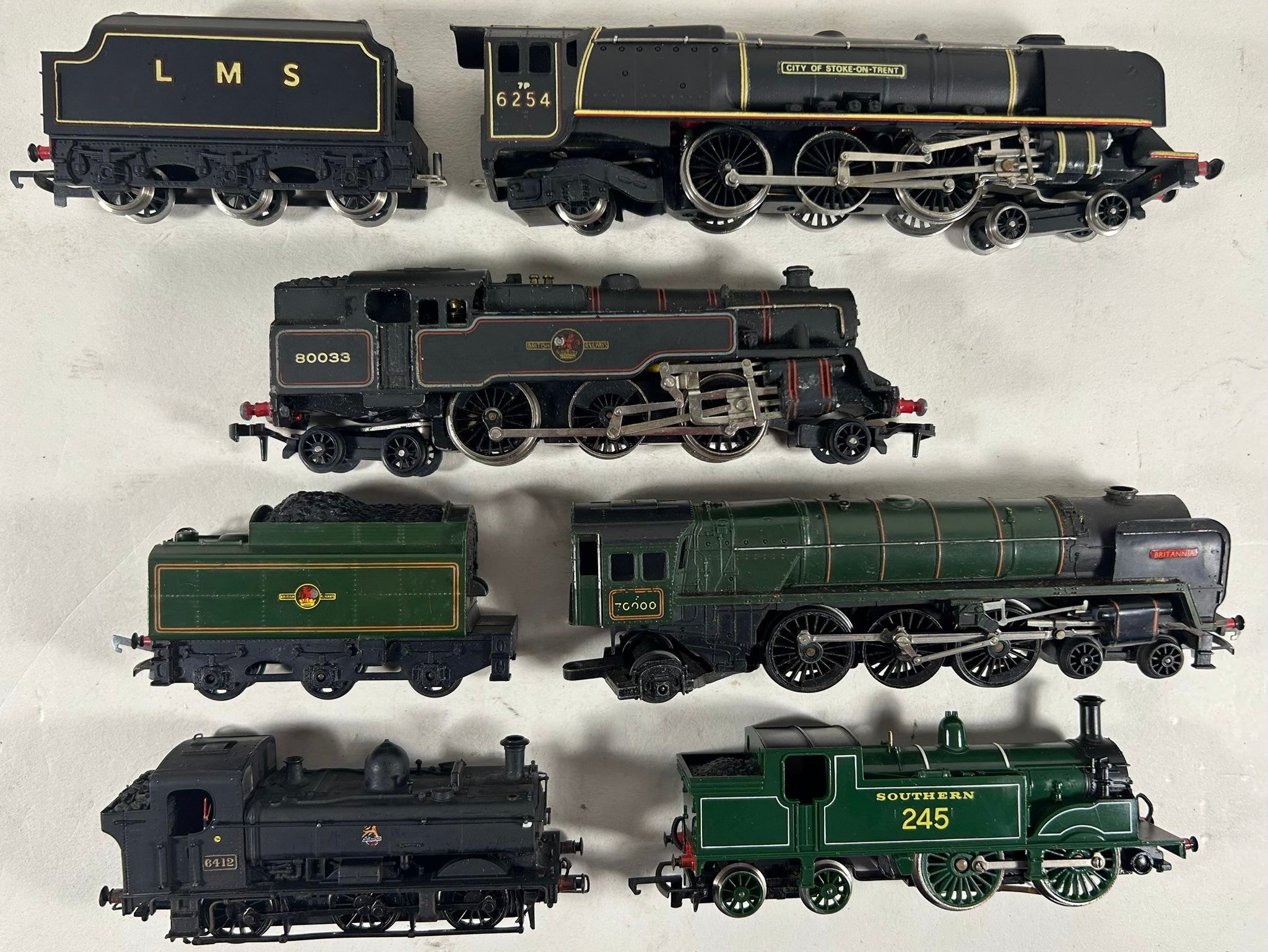 8 OO locomotives. 2 Wrenn - an LMS Coronation Class 4-6-2 tender locomotive, City of Stoke-On-Trent 6254. Plus a BR Class 4MT 2-6-4 tank, 80033. 2 Mainline- BR Royal Scot Class 4-6-0 tender locomotive, Royal Scot 46100. BR 0-6-0 Pannier tank 6412. 2 Tri-ang - BR Class 3MT 2-6-0 tender locomotive, 46400 and a Britannia Class 4-6-2 tender locomotive, Britannia 70000. Plus 2 Hornby - BR Class 9F 2-10-0 tender loco, 92166. And a Southern Class M7 0-4-4 tank, 245. GC-VGC.