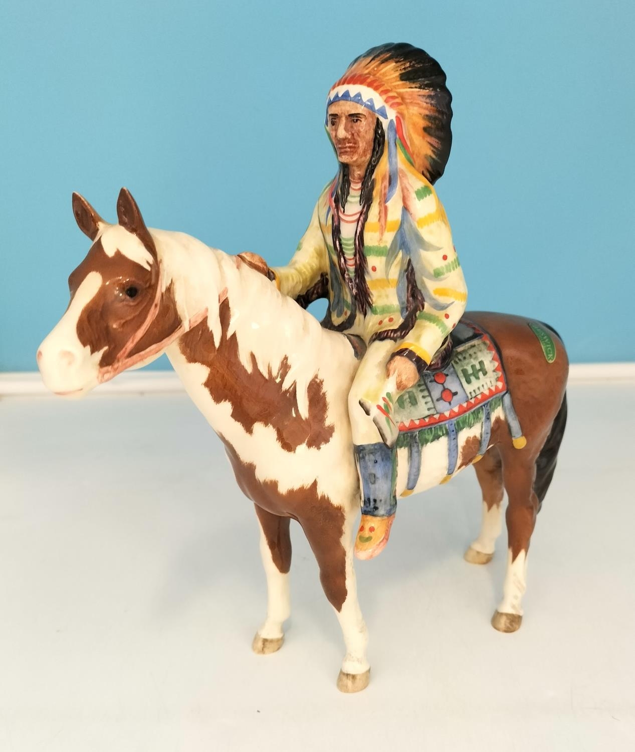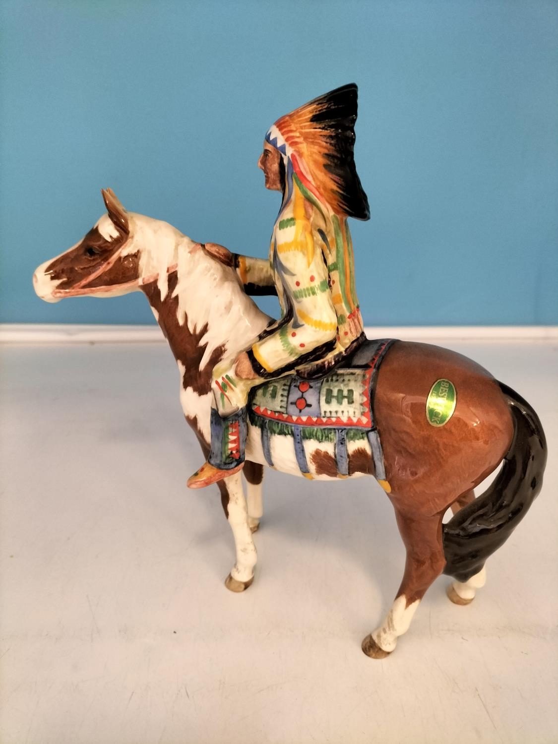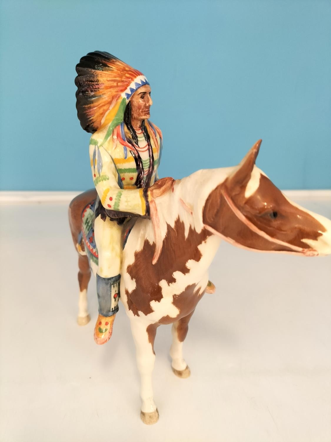 Beswick Figure of a Mounted Indian on Skewbald Horse 1391. 22cm High, 21cm Long. A/F to Back of Headdress (not visible from front).