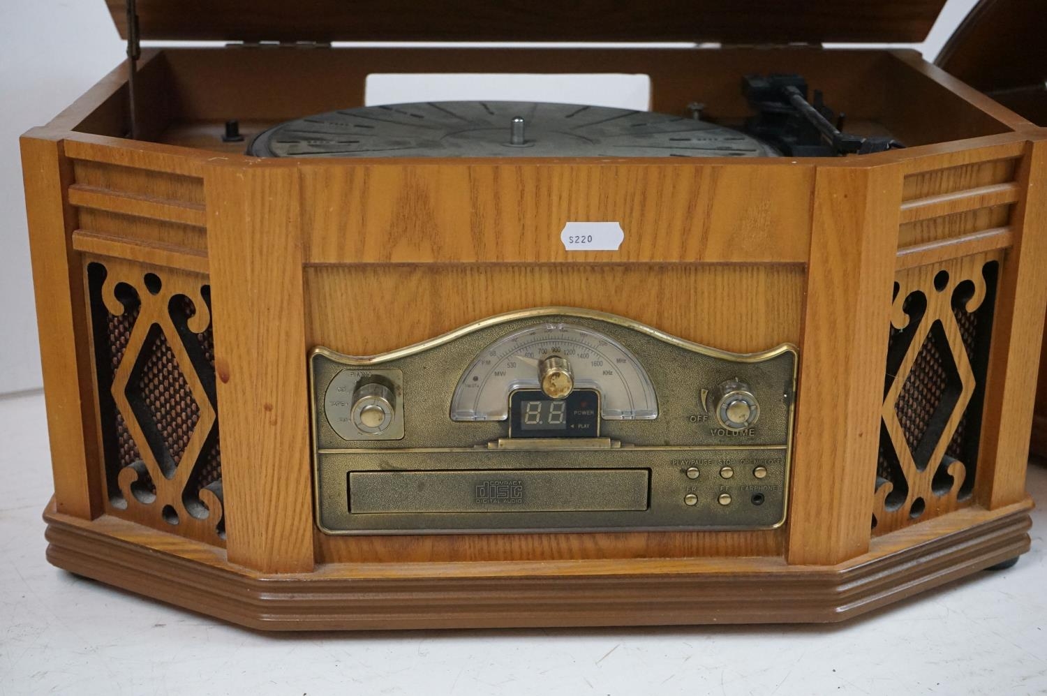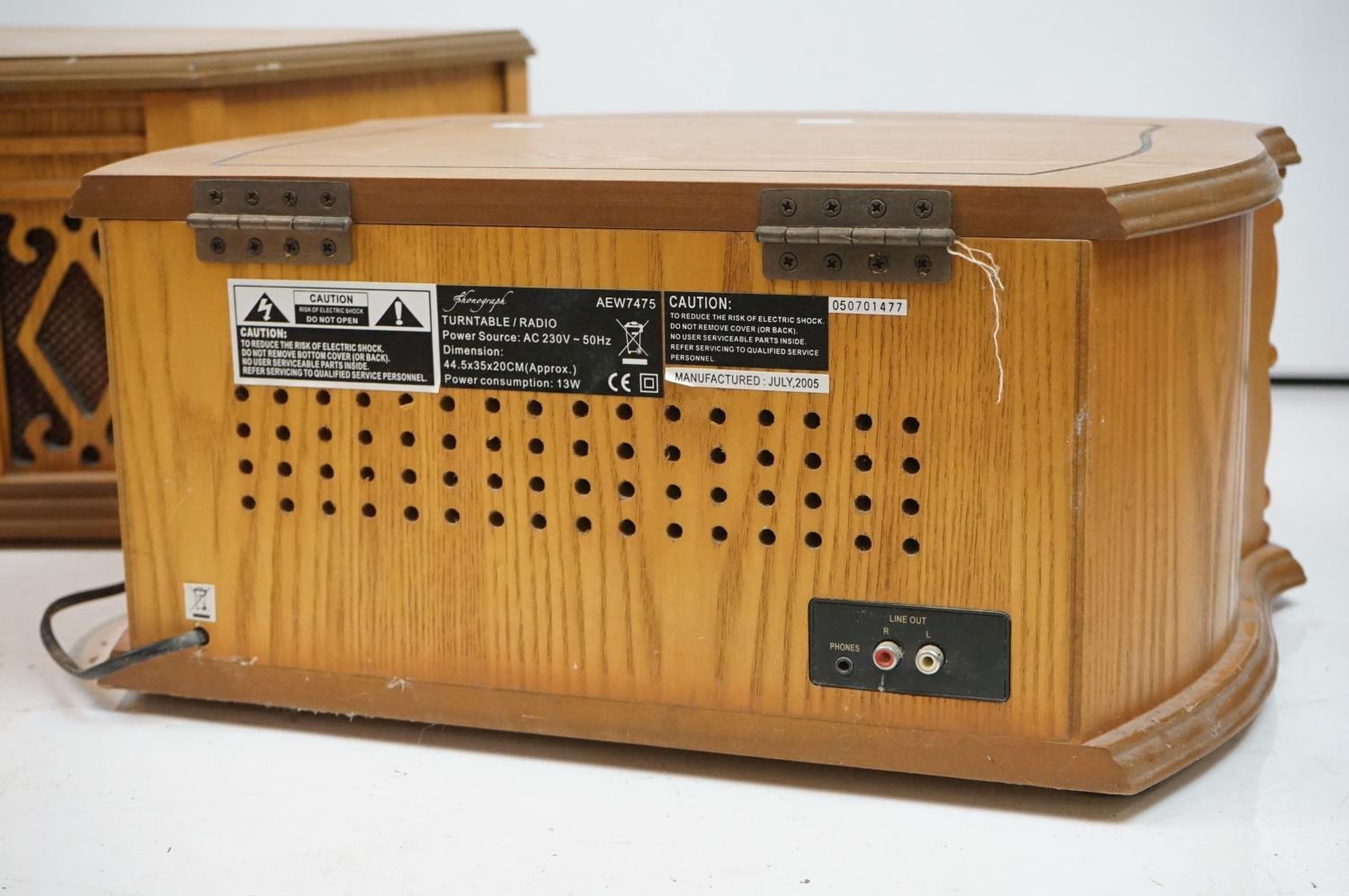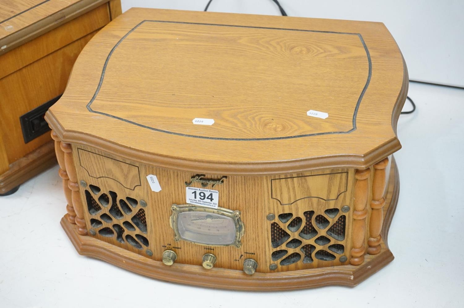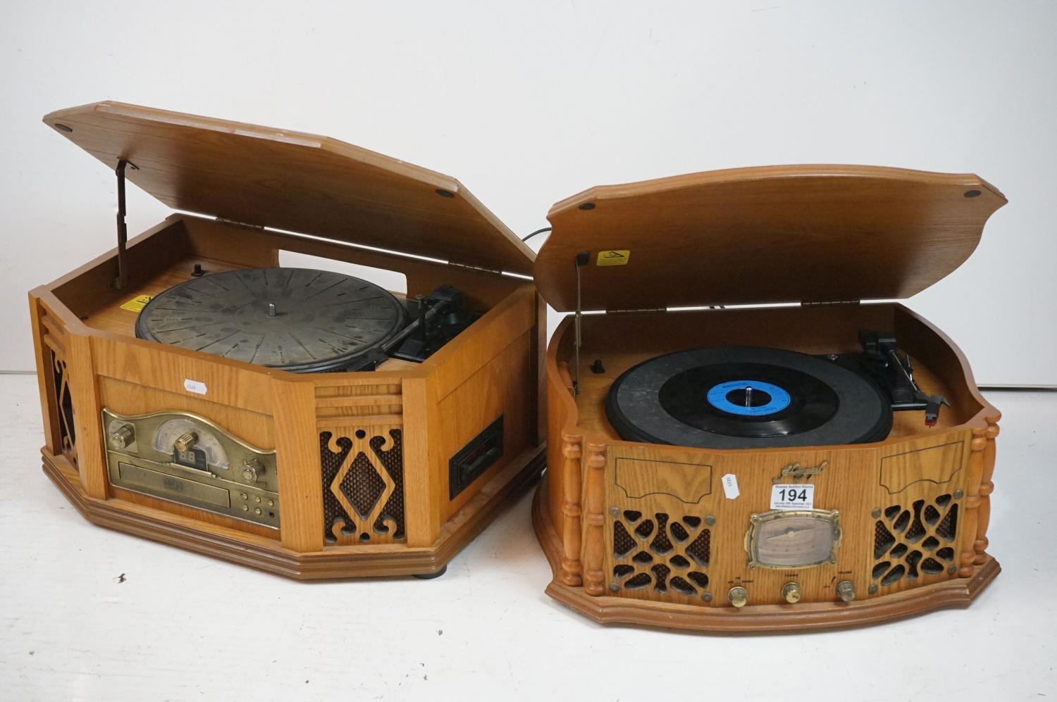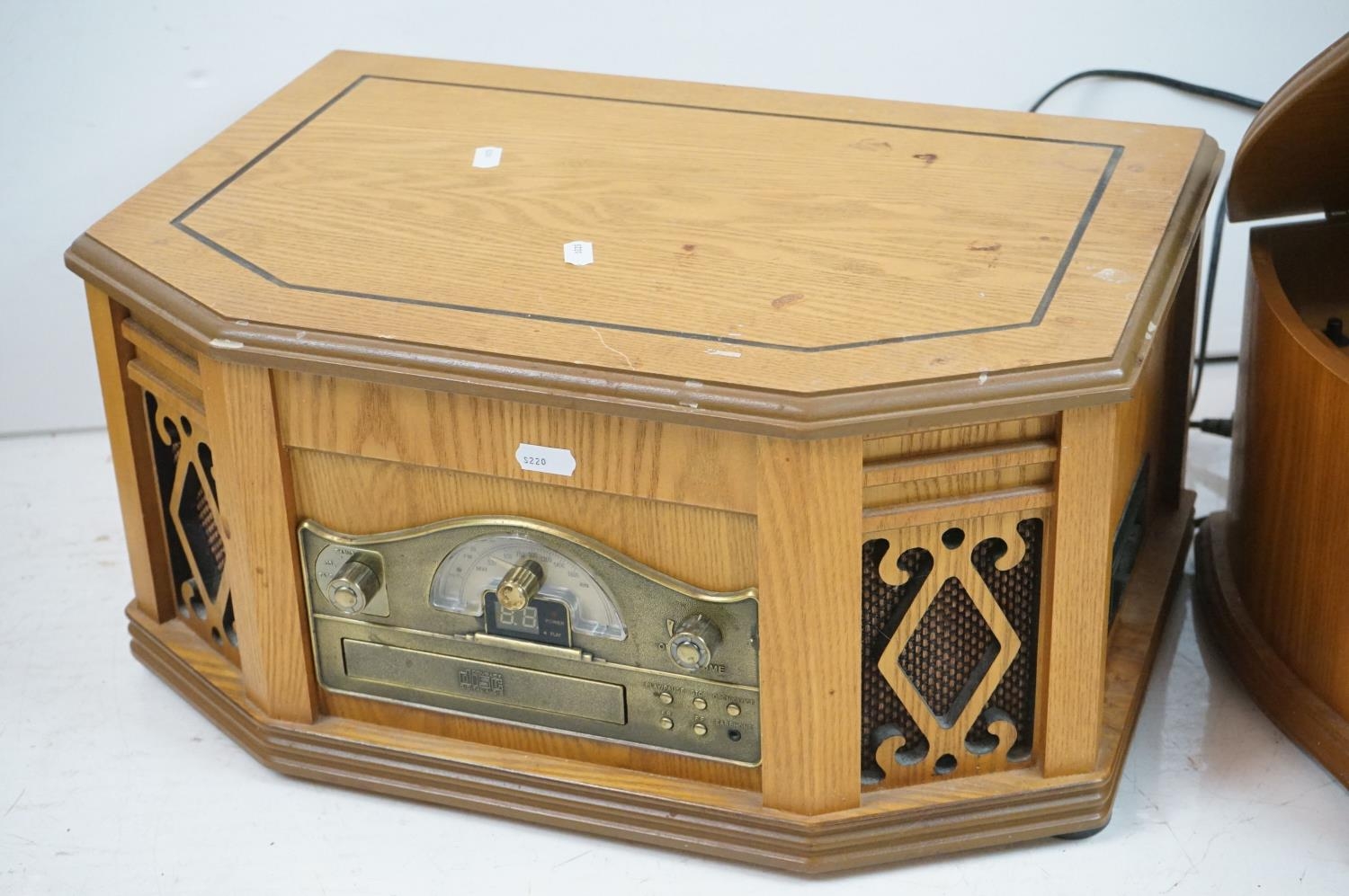 Two vintage style music centres to include record player, CD player, radio and Aux line.