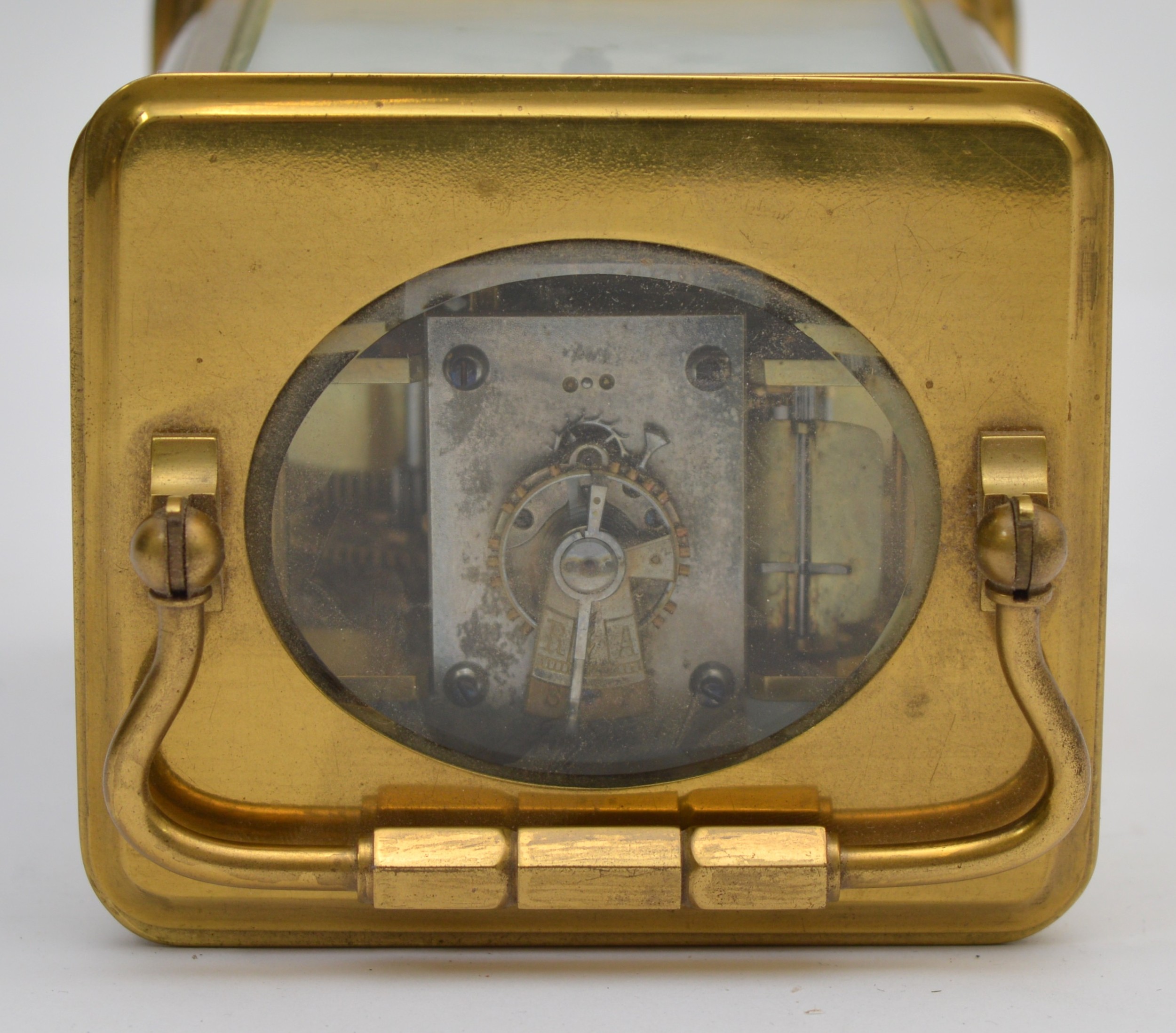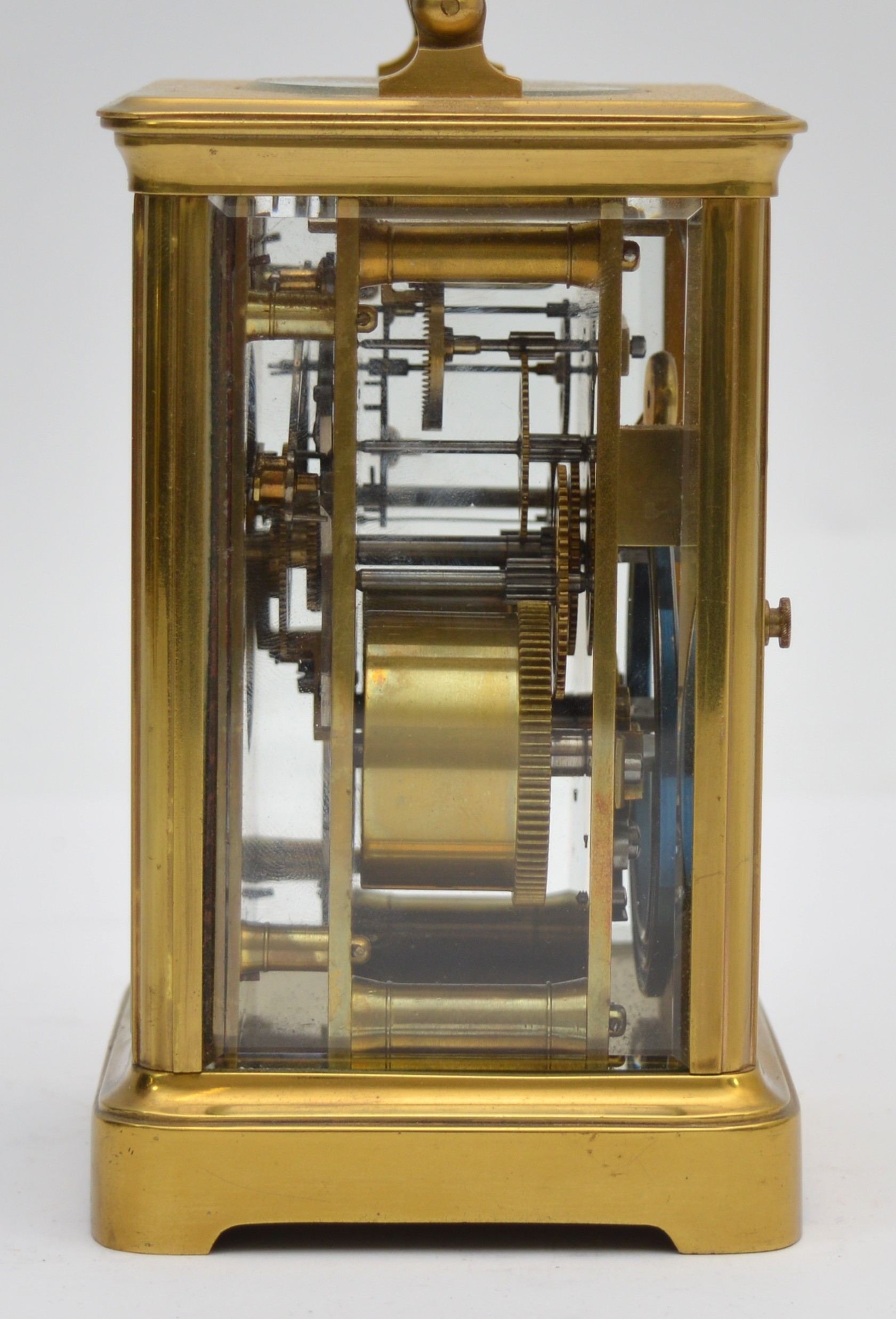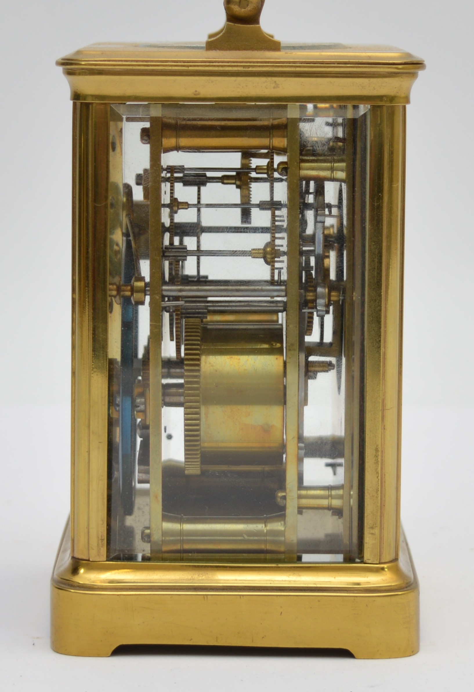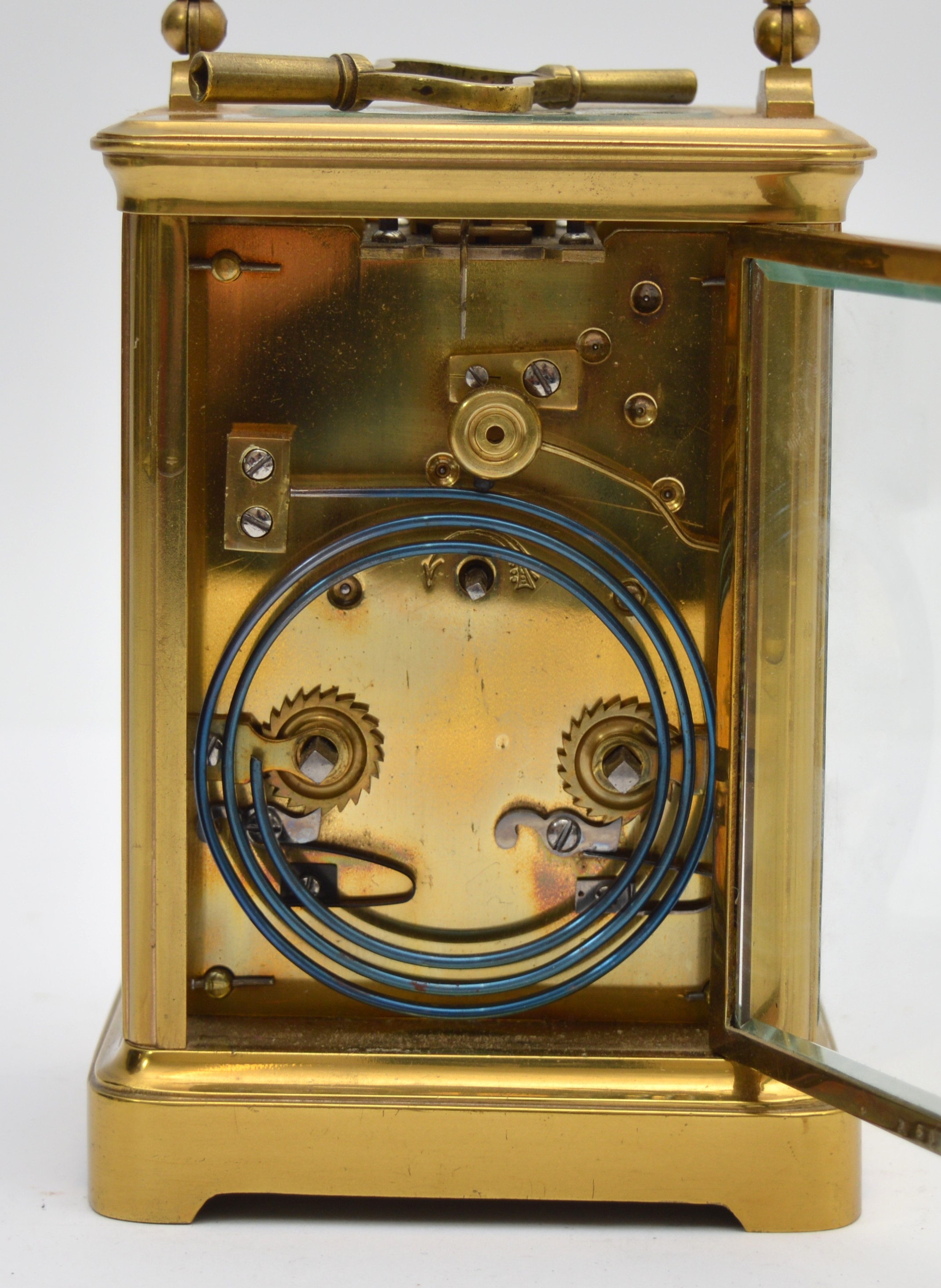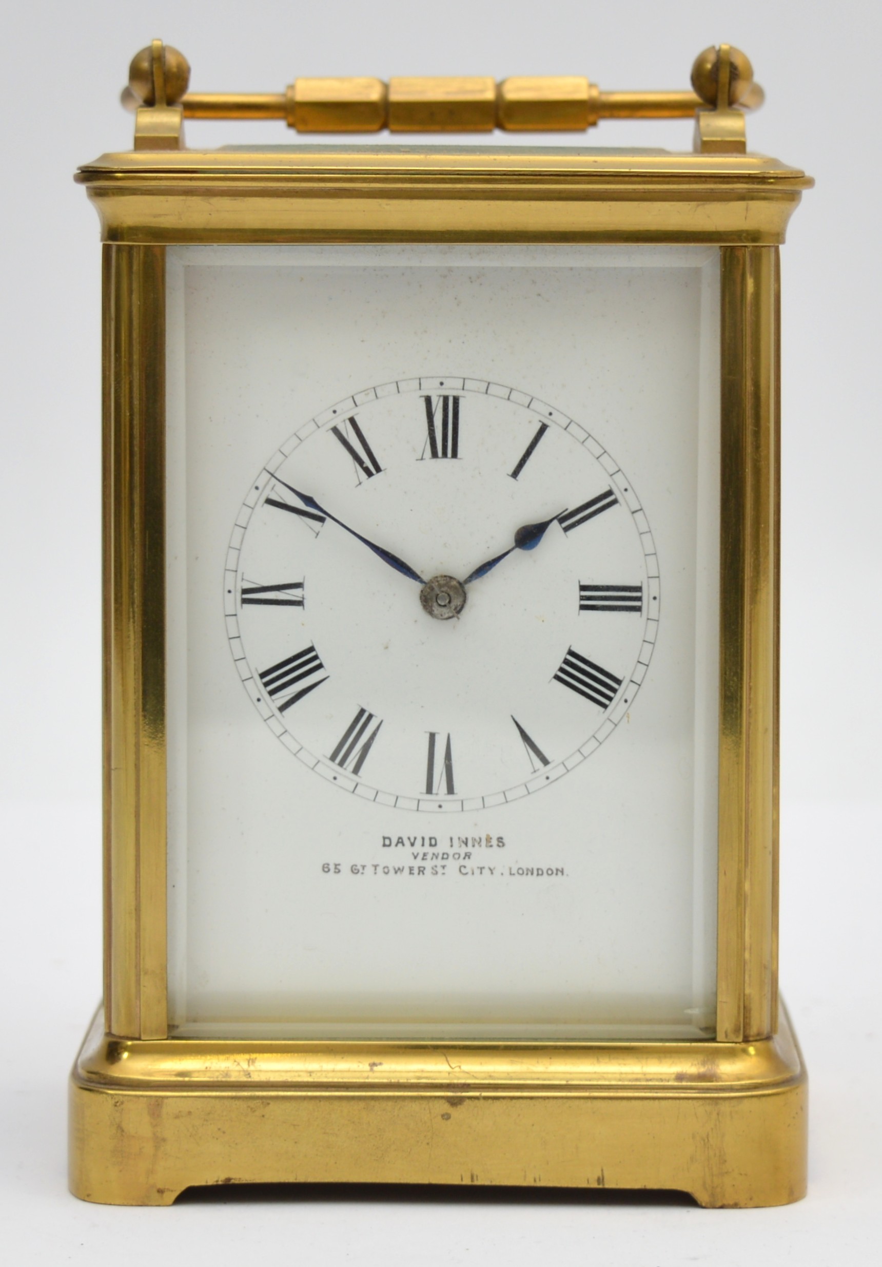 An early 20th century brass striking carriage clock, the white enamel dial signed David Innes, London, the movement striking the hours and half on a gong, case numbered 251 in several places, key, 14.5cm