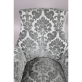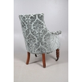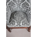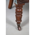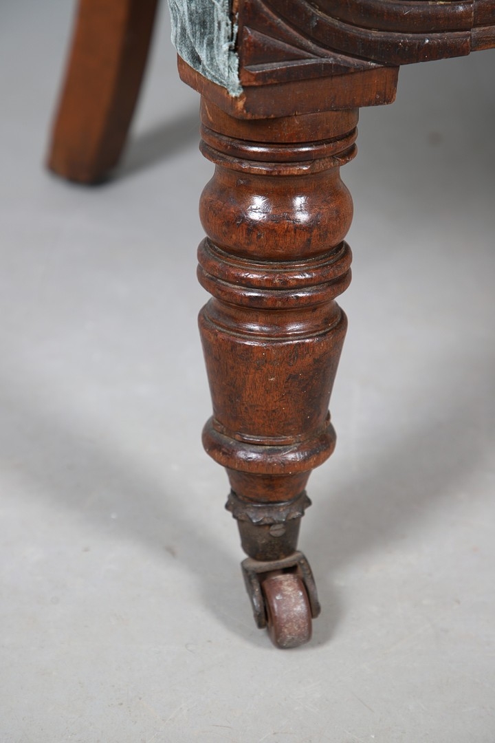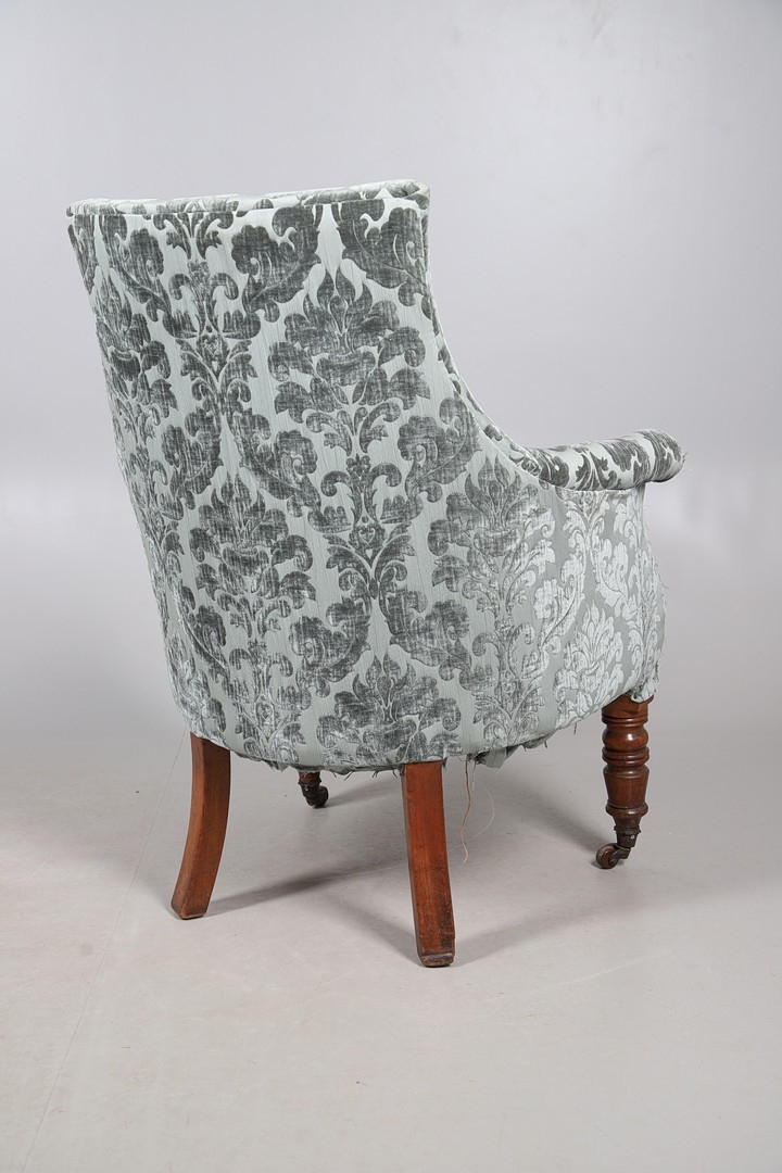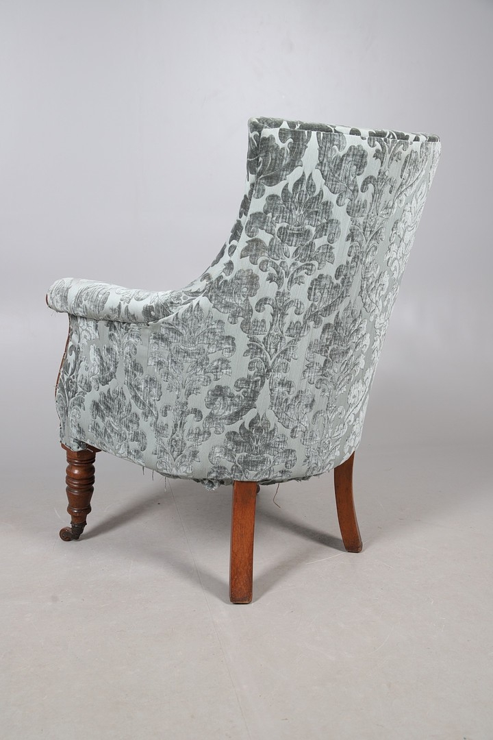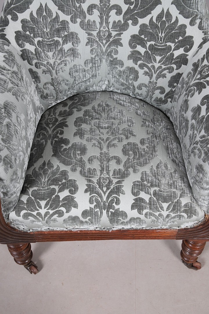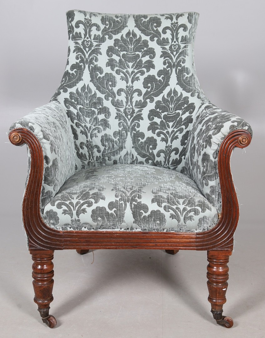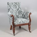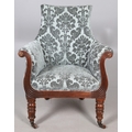 A WILLIAM IV GILLOWS STYLE MAHOGANY LIBRARY CHAIR. the concave back to overstuffed arms, carved reeded S-scroll fronts and seat rail, raised on turned supports with brass caps and castors, upholstered in patterned teal velvet, height 101cm, width 75cm, depth 60cm.