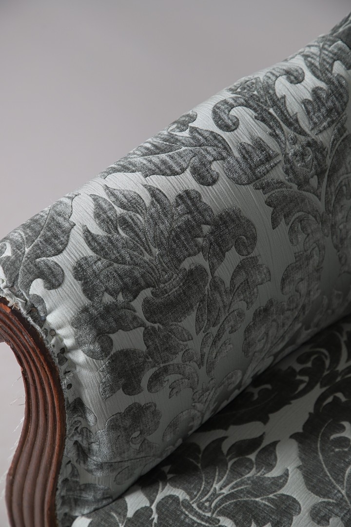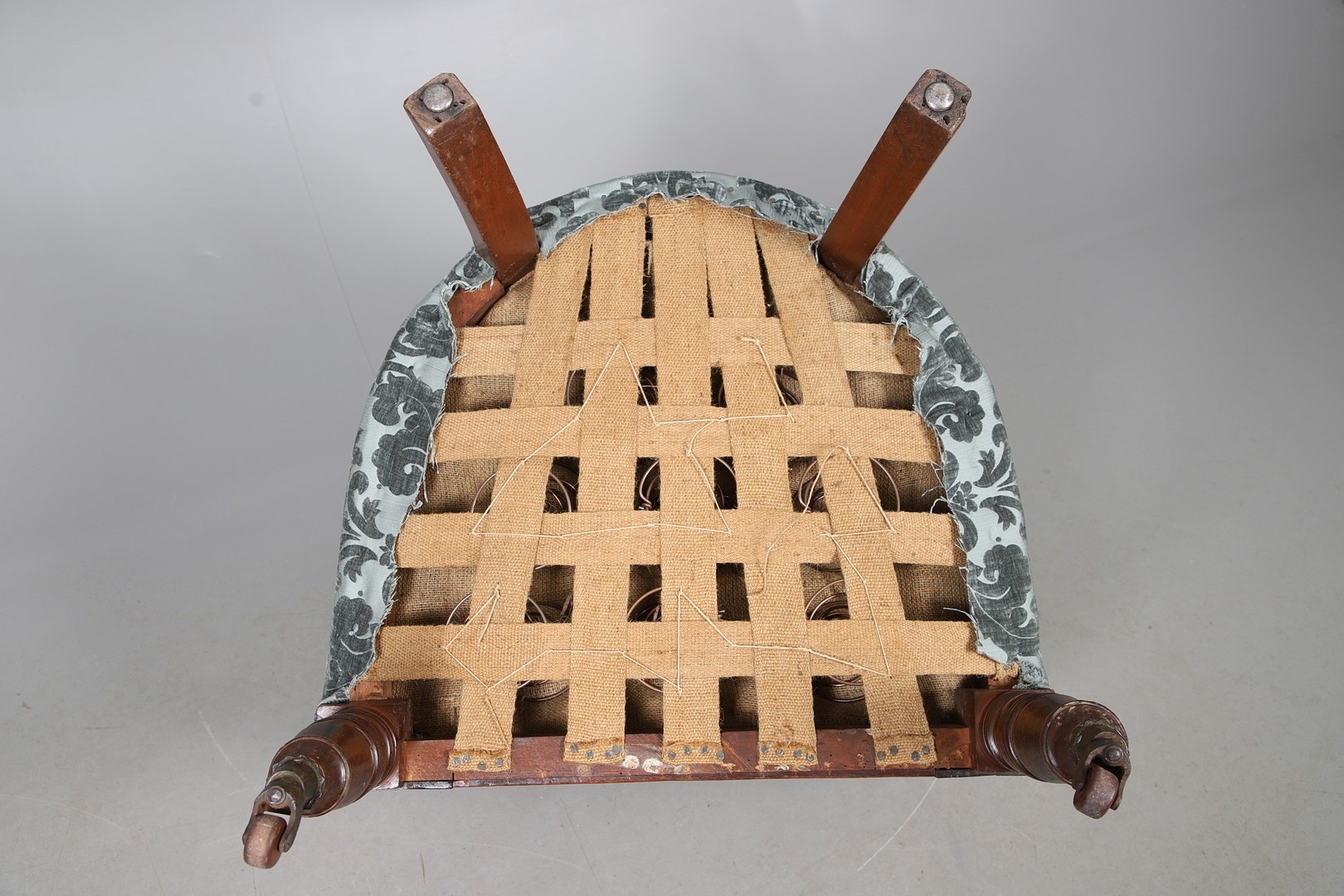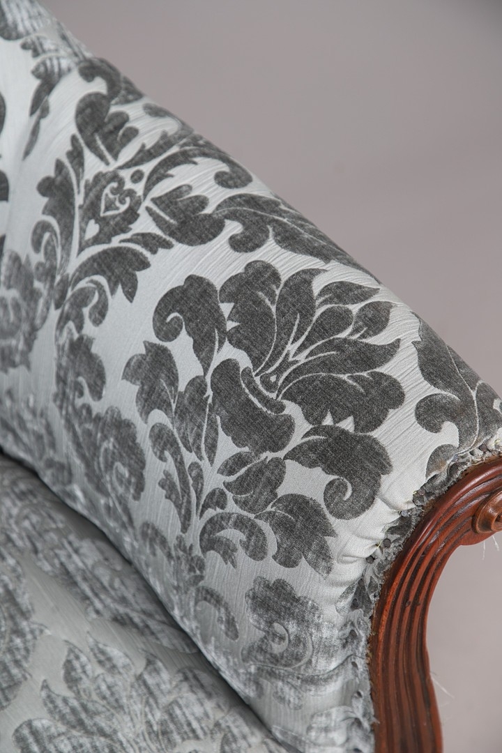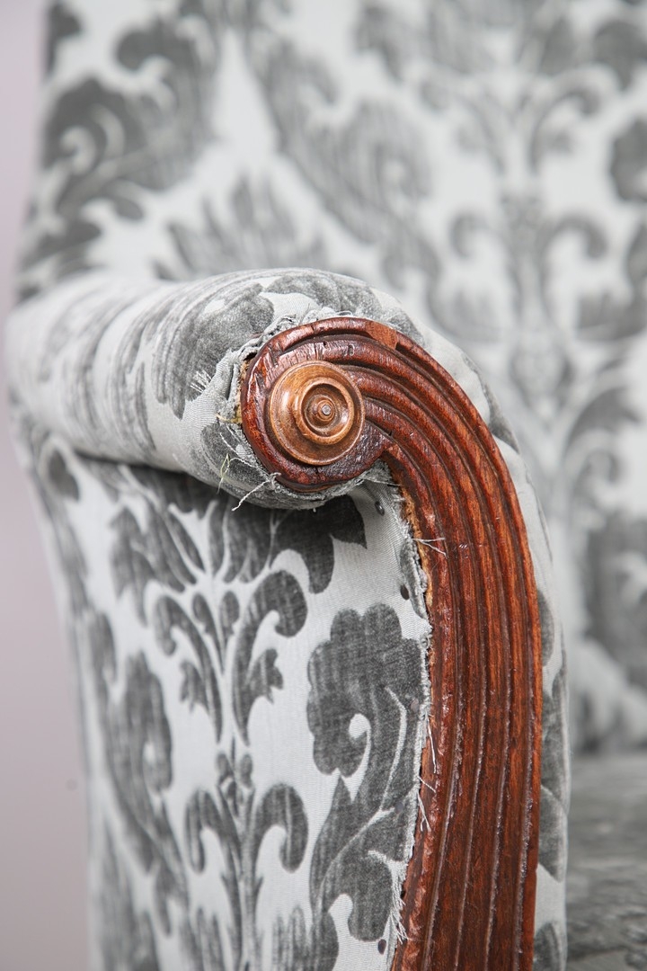 Fraying to edges of upholstery, minor losses and wear to frame.