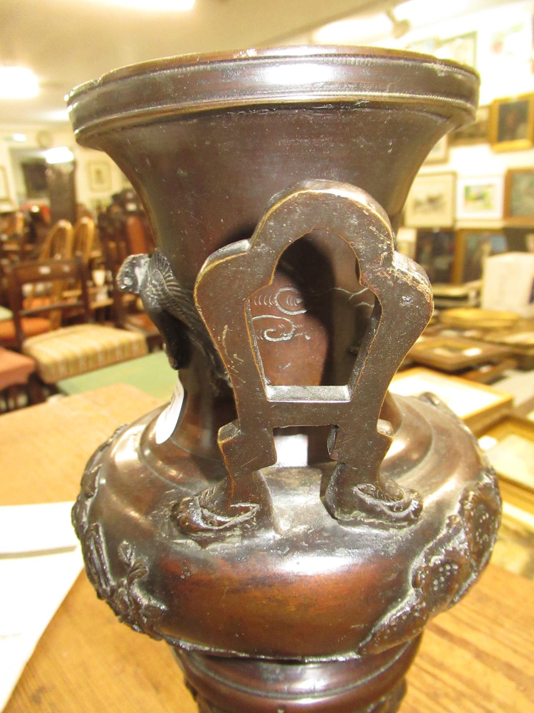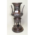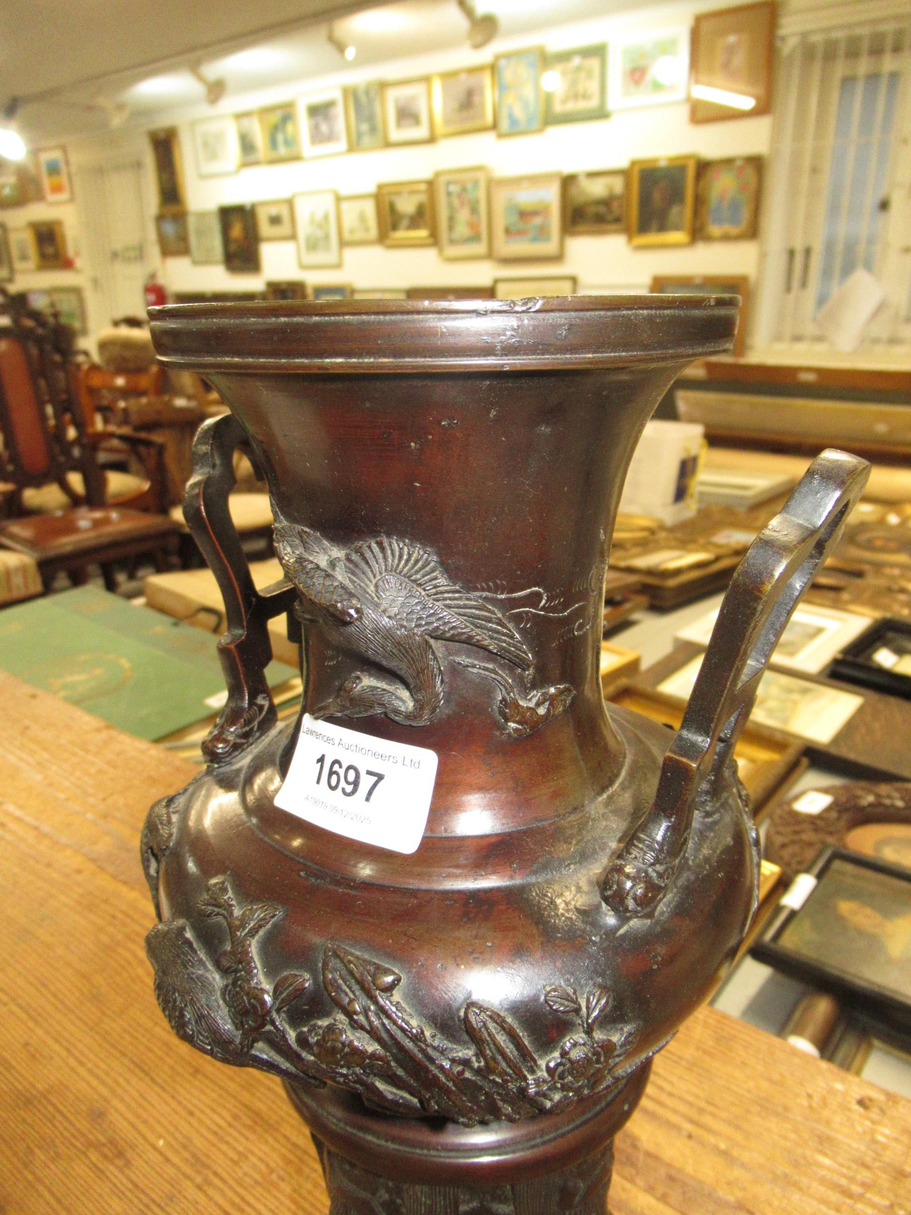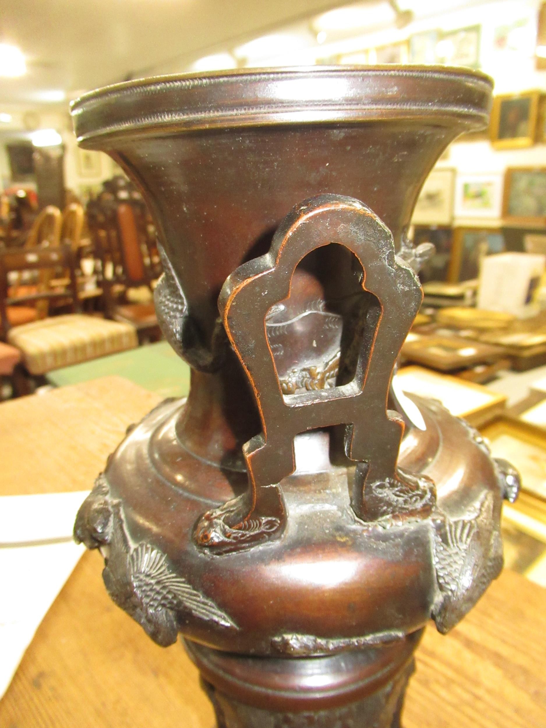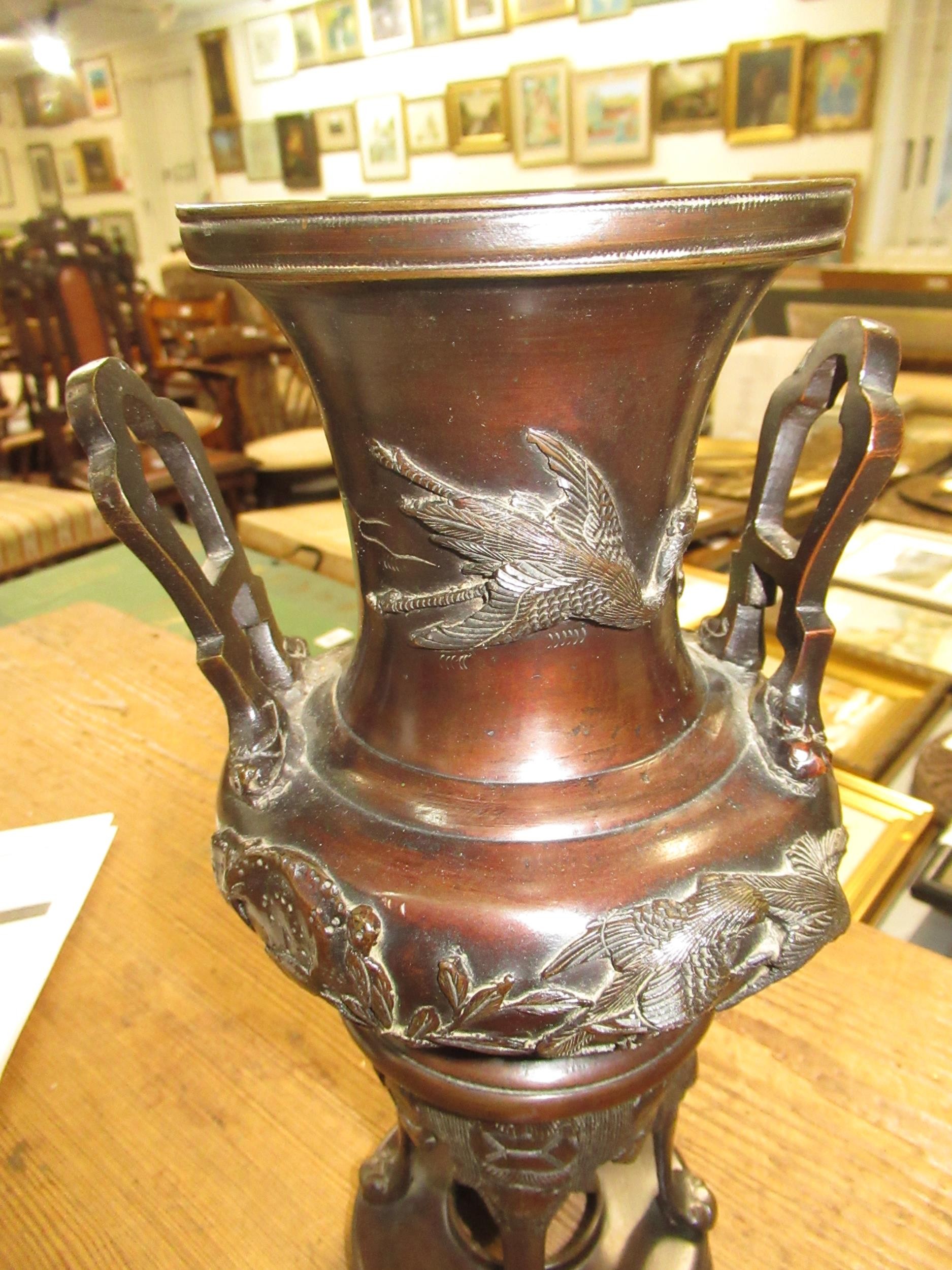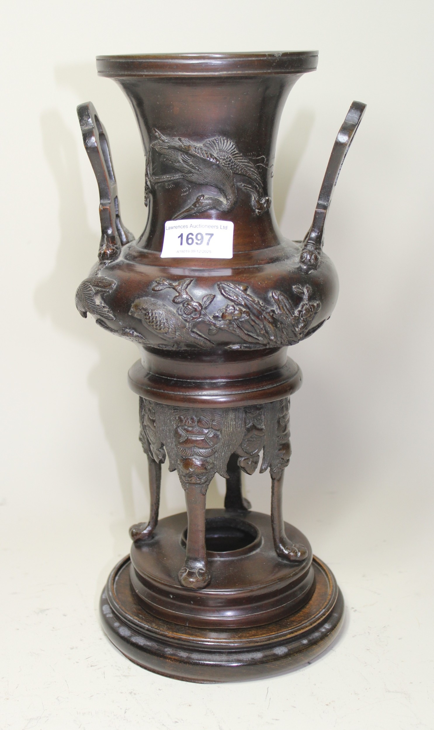 Late 19th Century Japanese dark patinated bronze two handled vase decorated in high relief with birds, 30.5cm high, together with a hardwood stand