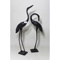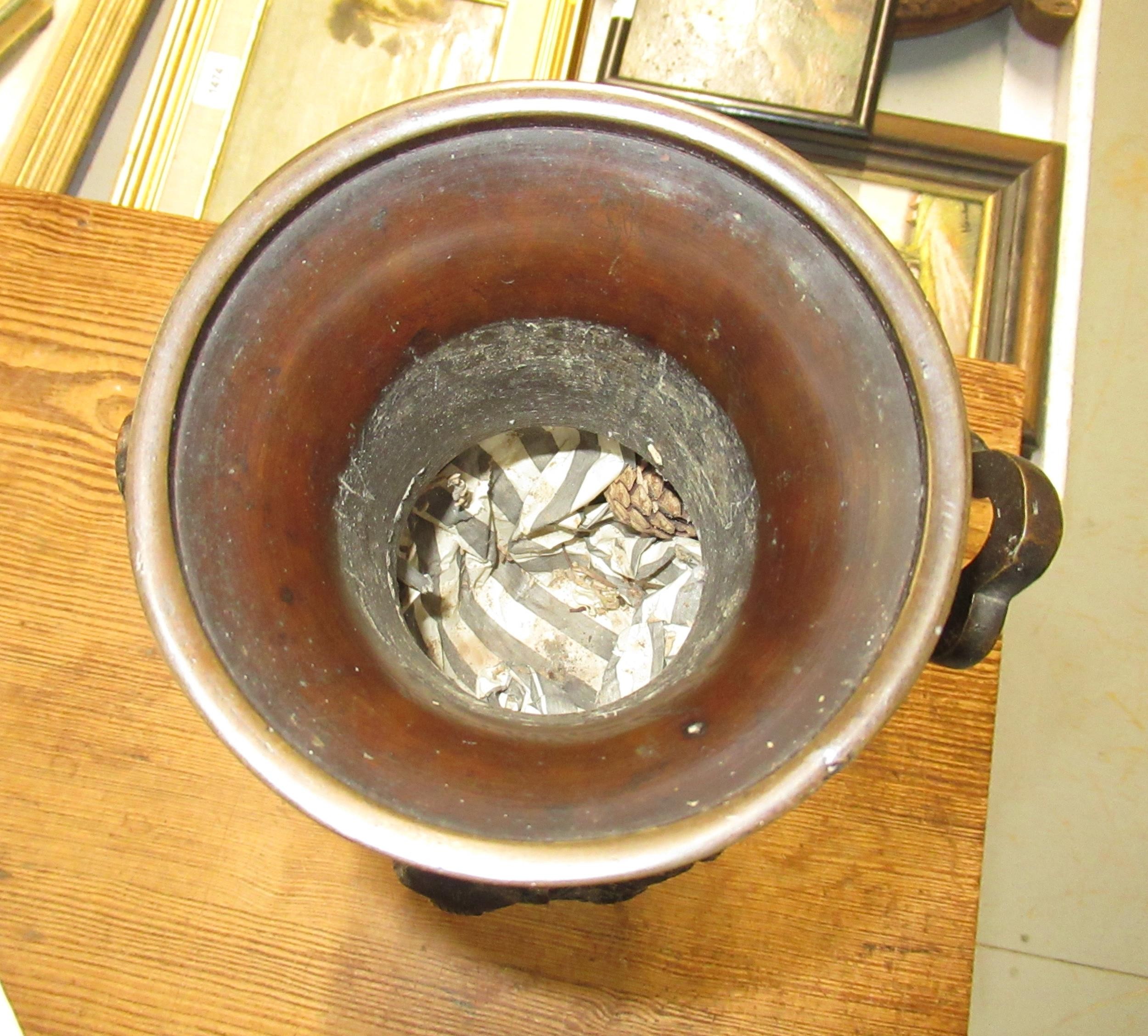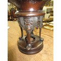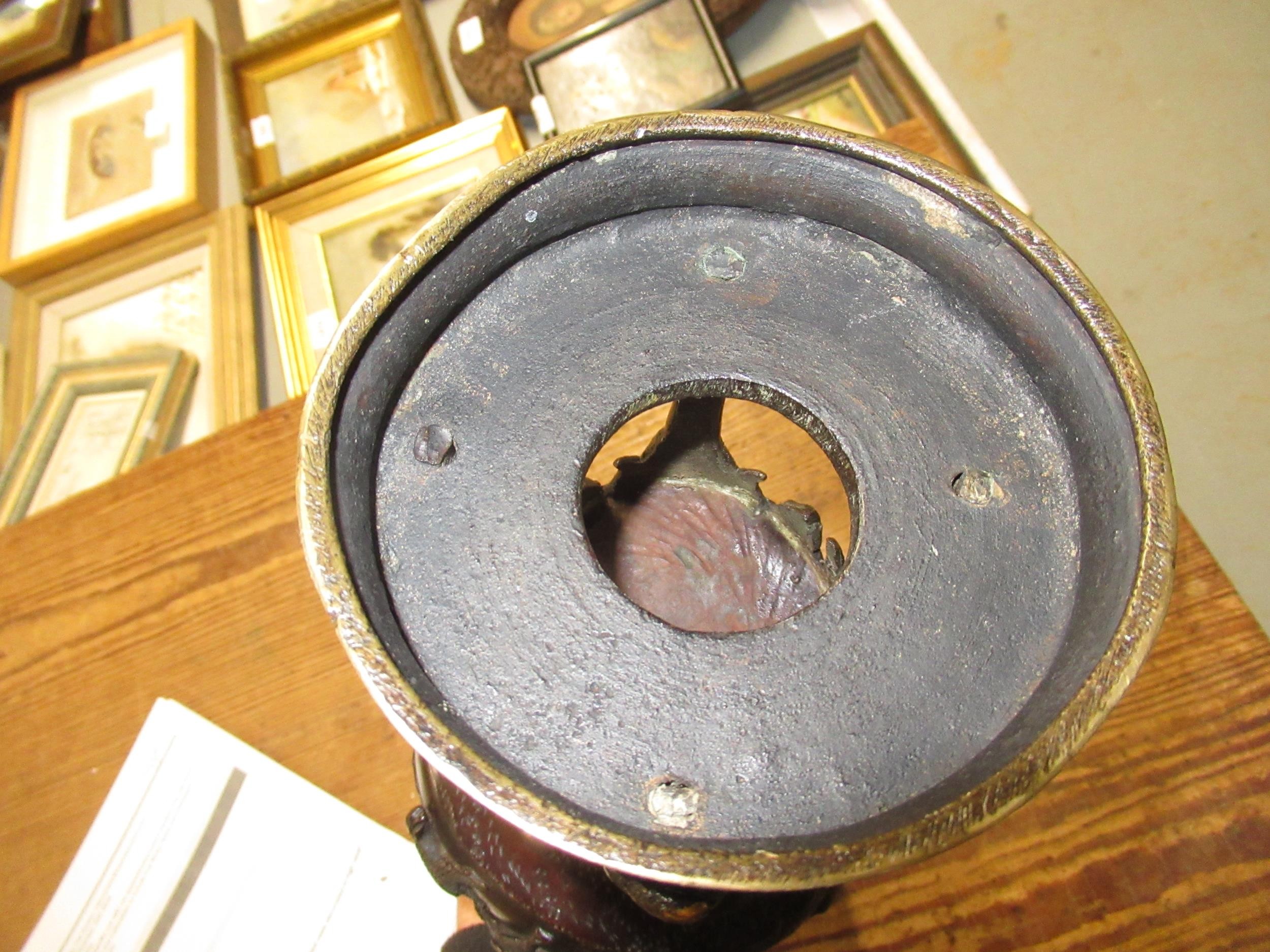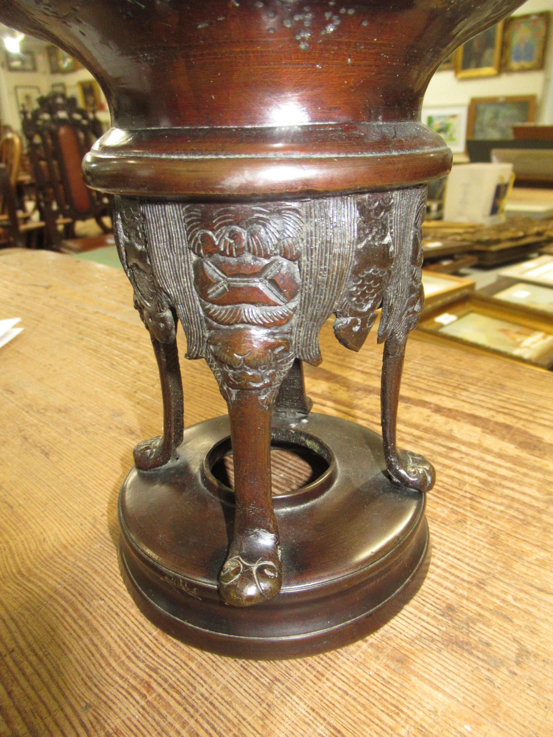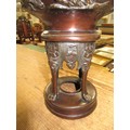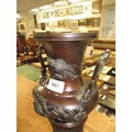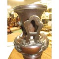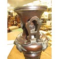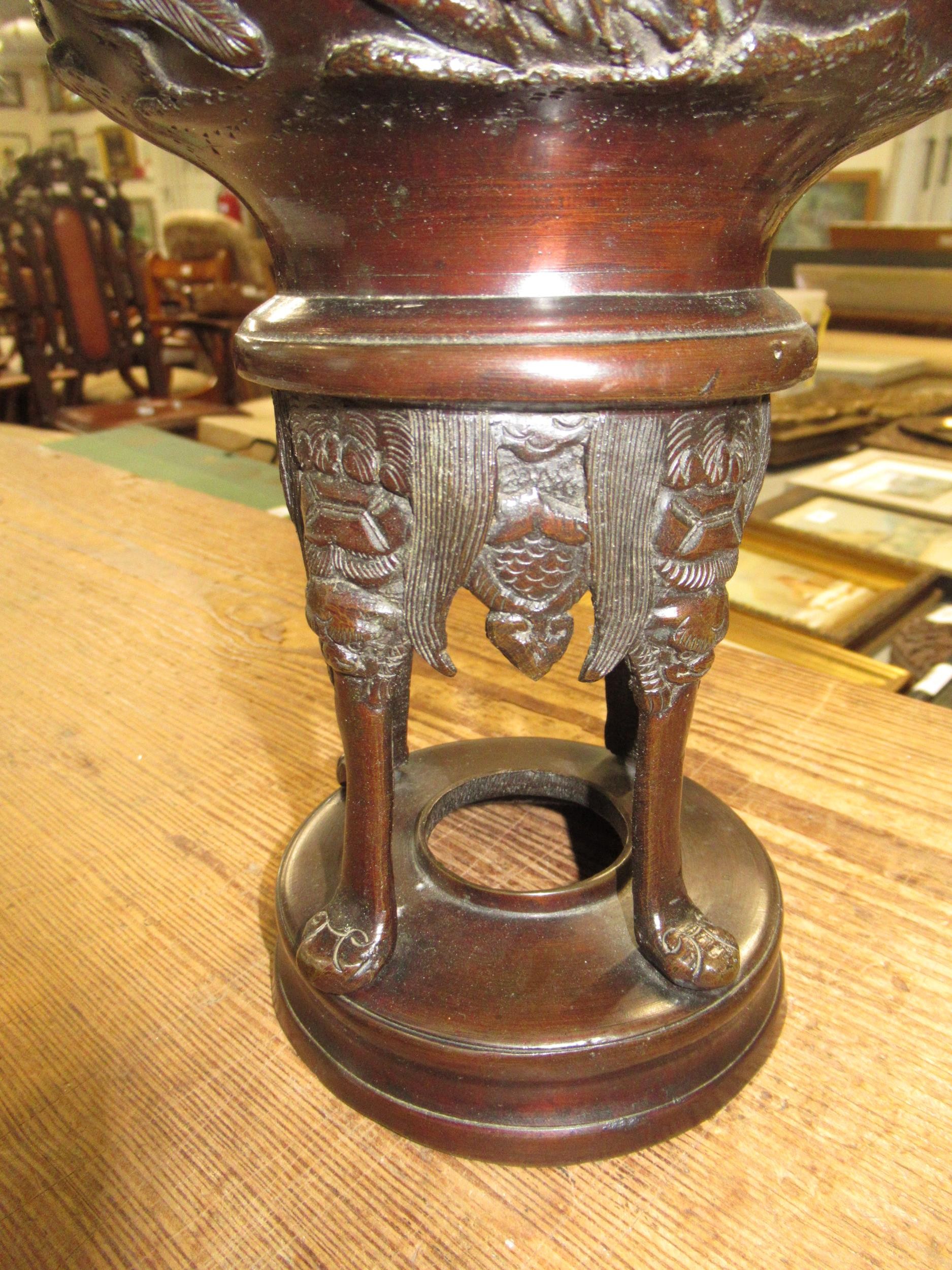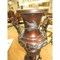 Late 19th Century Japanese dark patinated bronze two handled vase decorated in high relief with birds, 30.5cm high, together with a hardwood stand