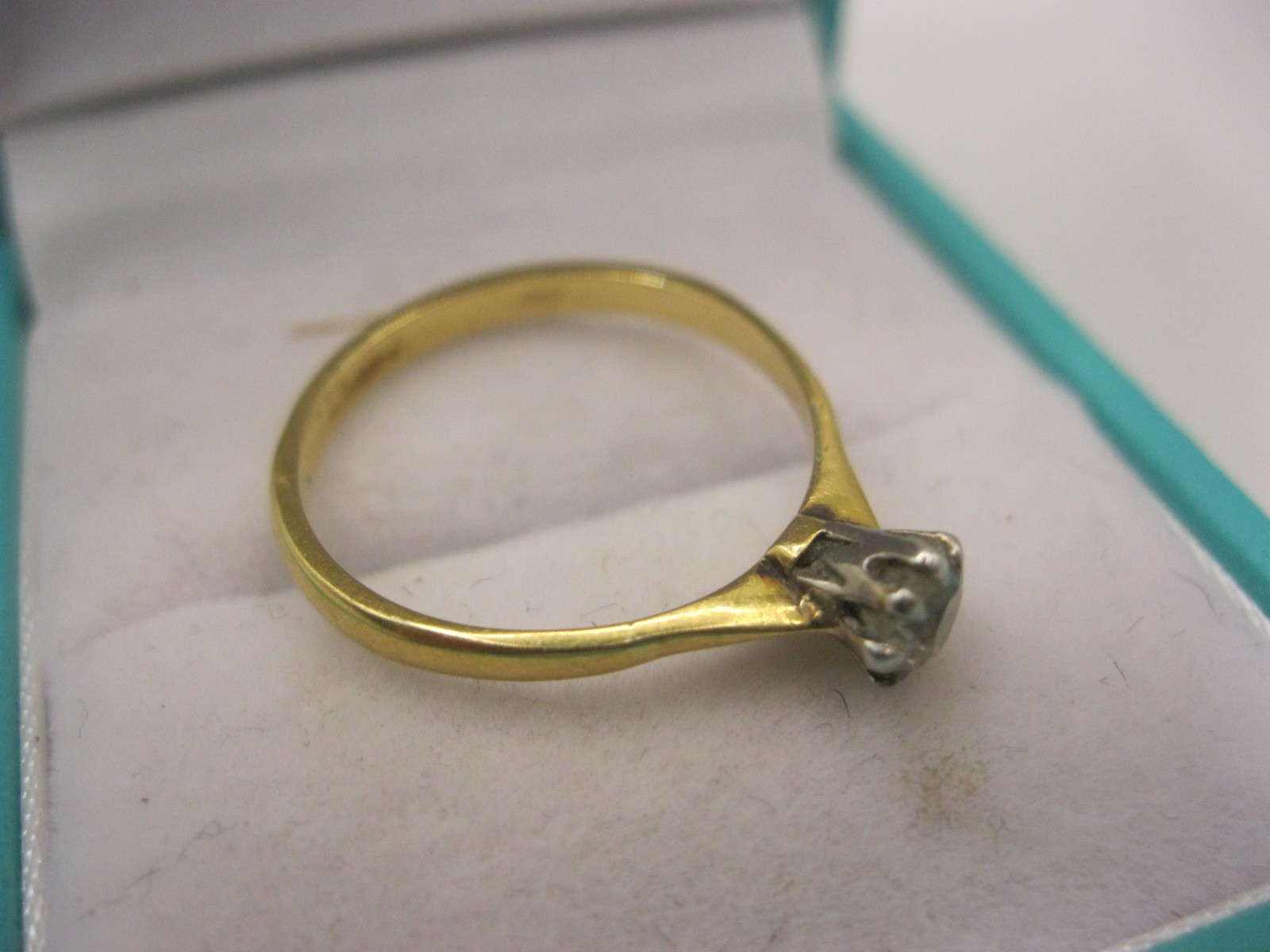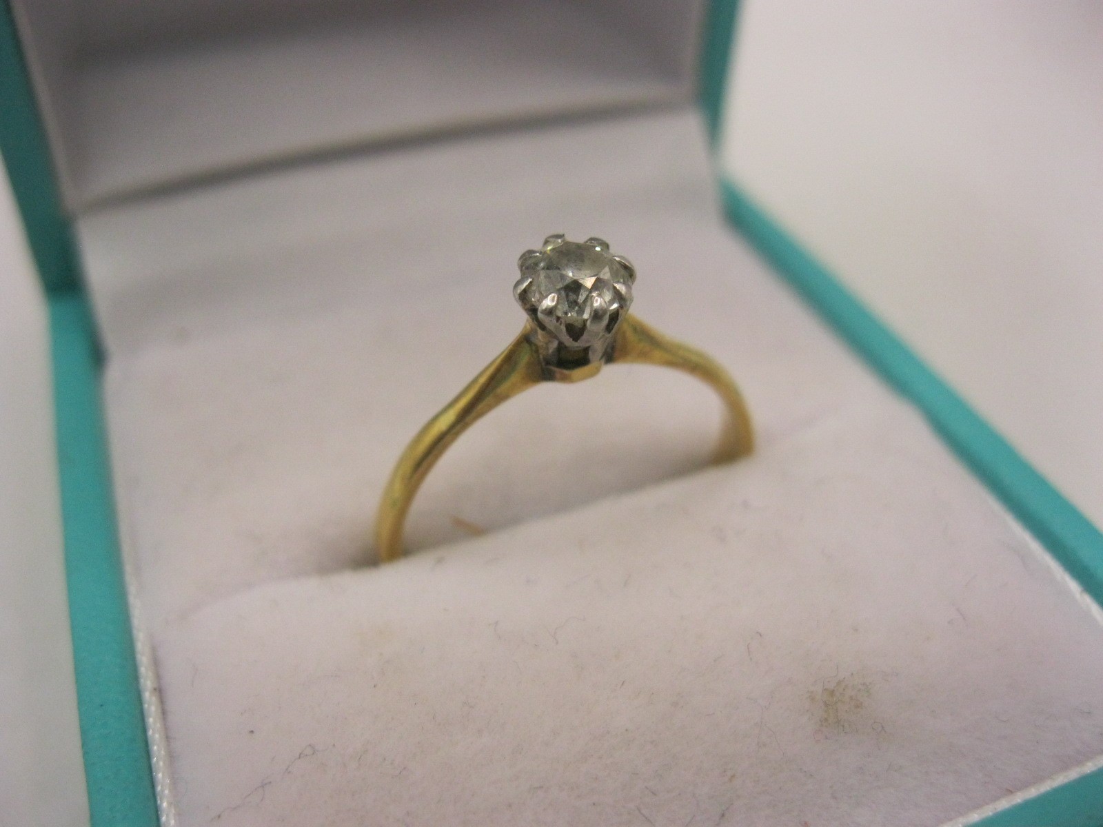 A yellow metal diamond solitaire ring, acid tests as 22 carat, the diamond of some size, perhaps 0.25carat with an old cut, in good order, ring size M, approx weight 1.86g