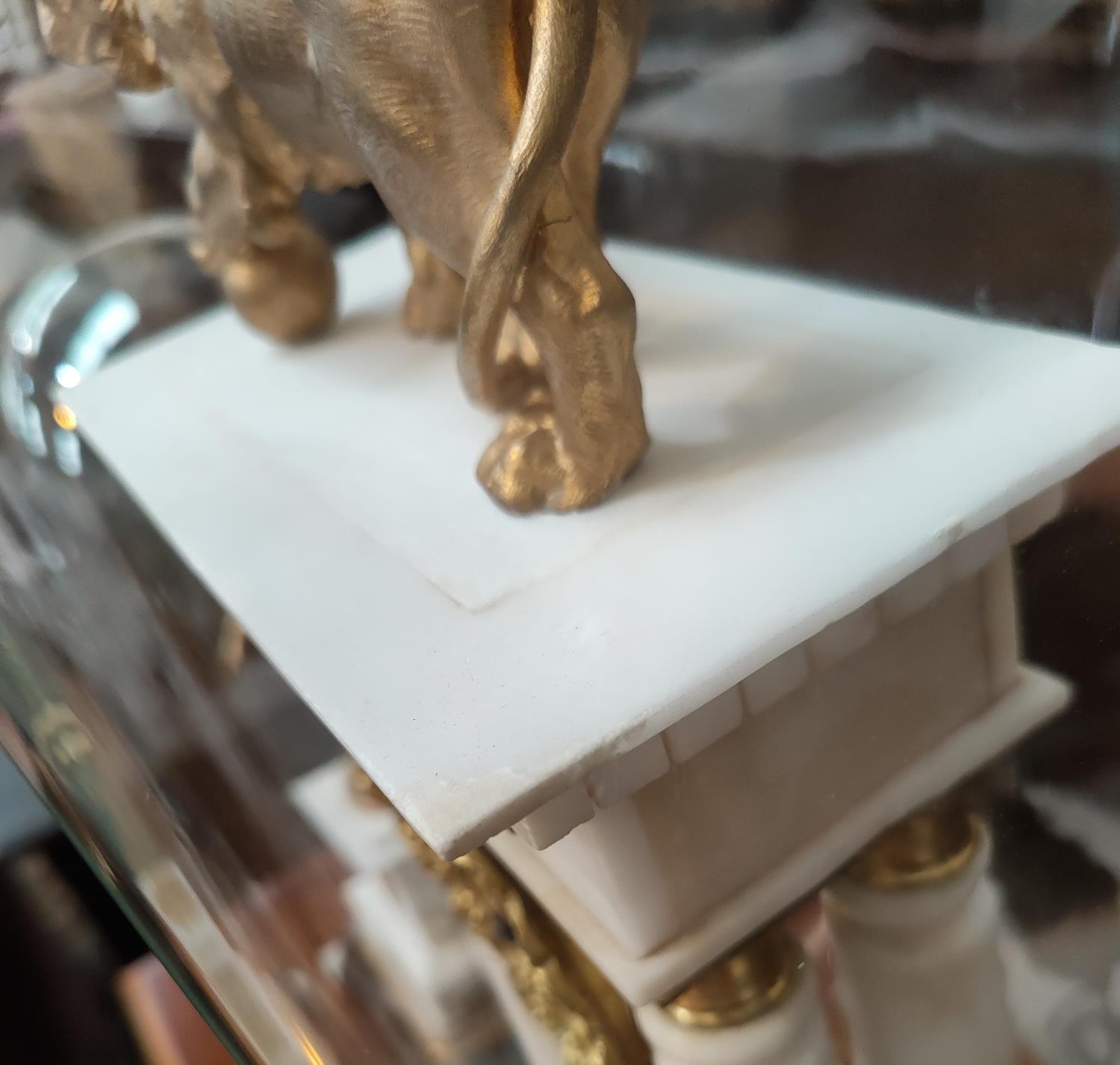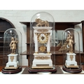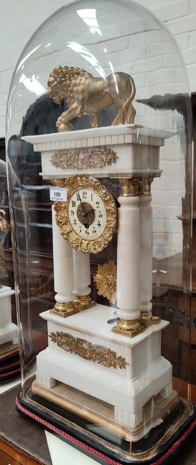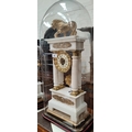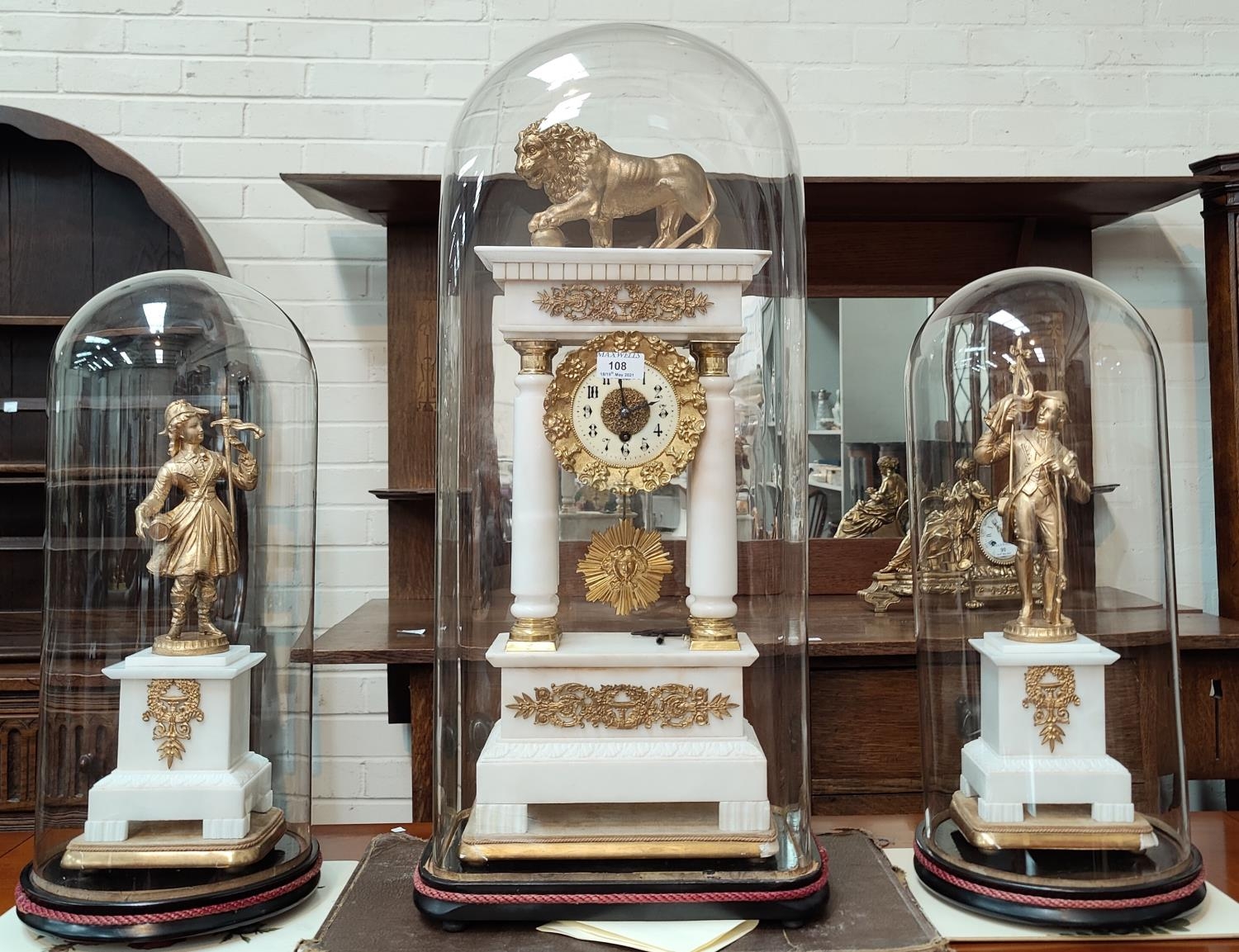 The garniture is mainly alabaster with clock columns possibly marble. It is in generally good condition overall with some loss of gilt gesso work on bases. The figures and lion have been repainted in gilt. Domes are in good condition.