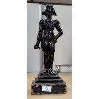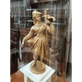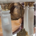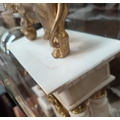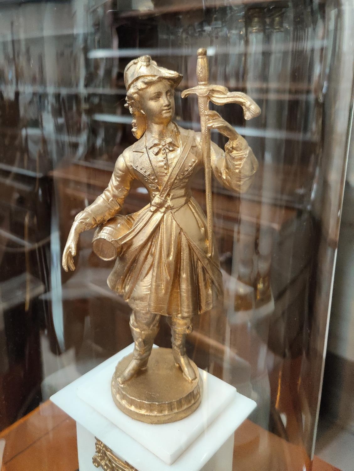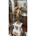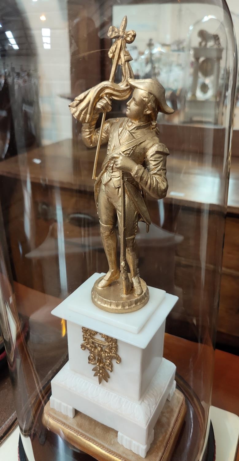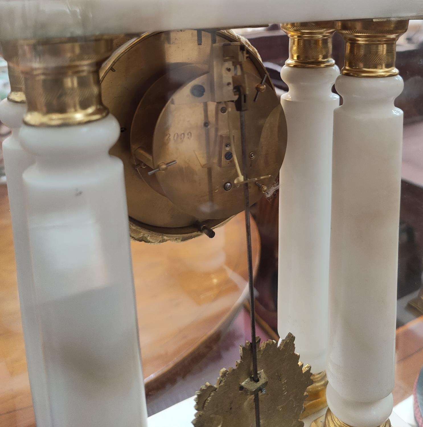 The garniture is mainly alabaster with clock columns possibly marble. It is in generally good condition overall with some loss of gilt gesso work on bases. The figures and lion have been repainted in gilt. Domes are in good condition.