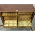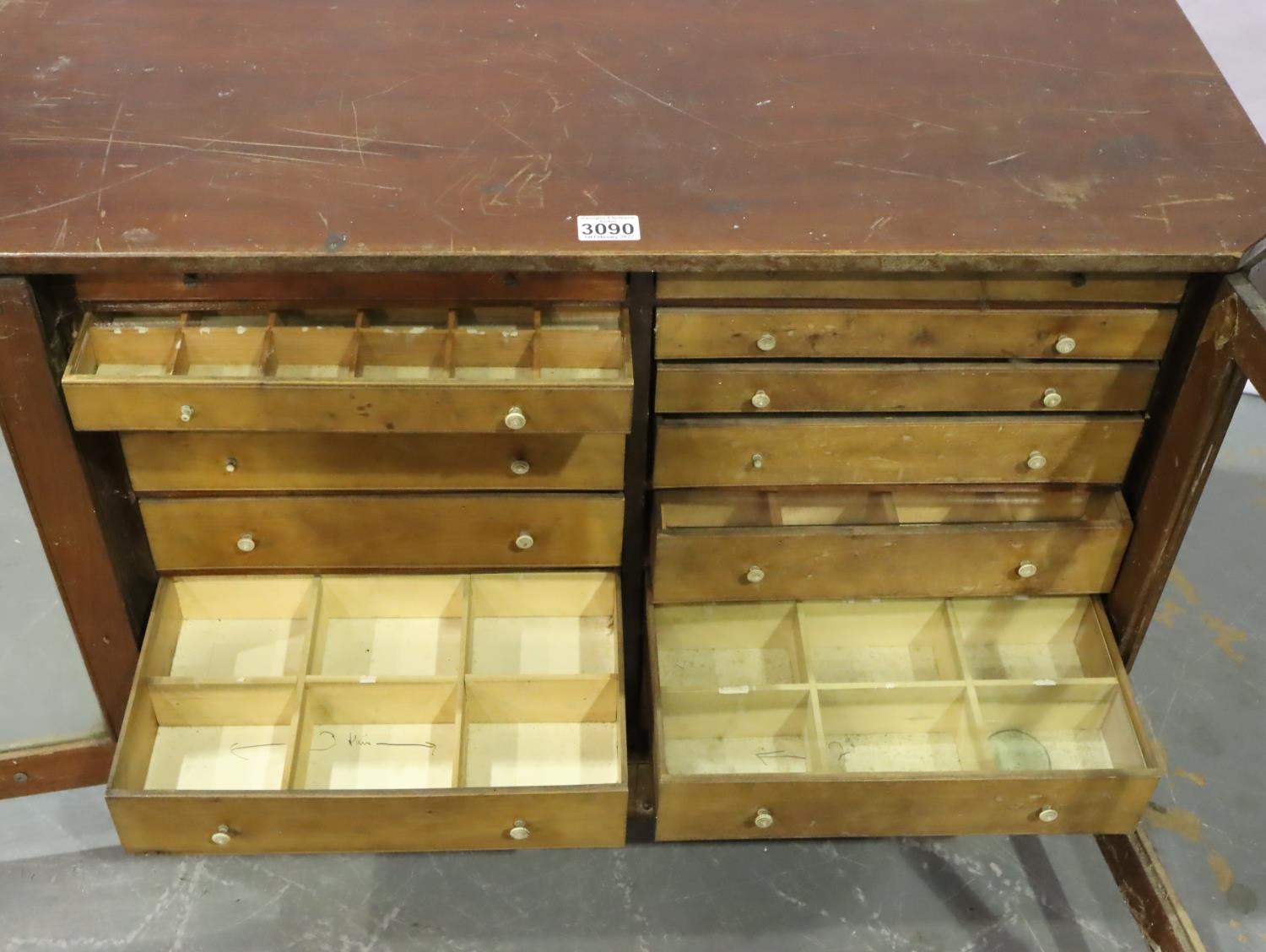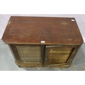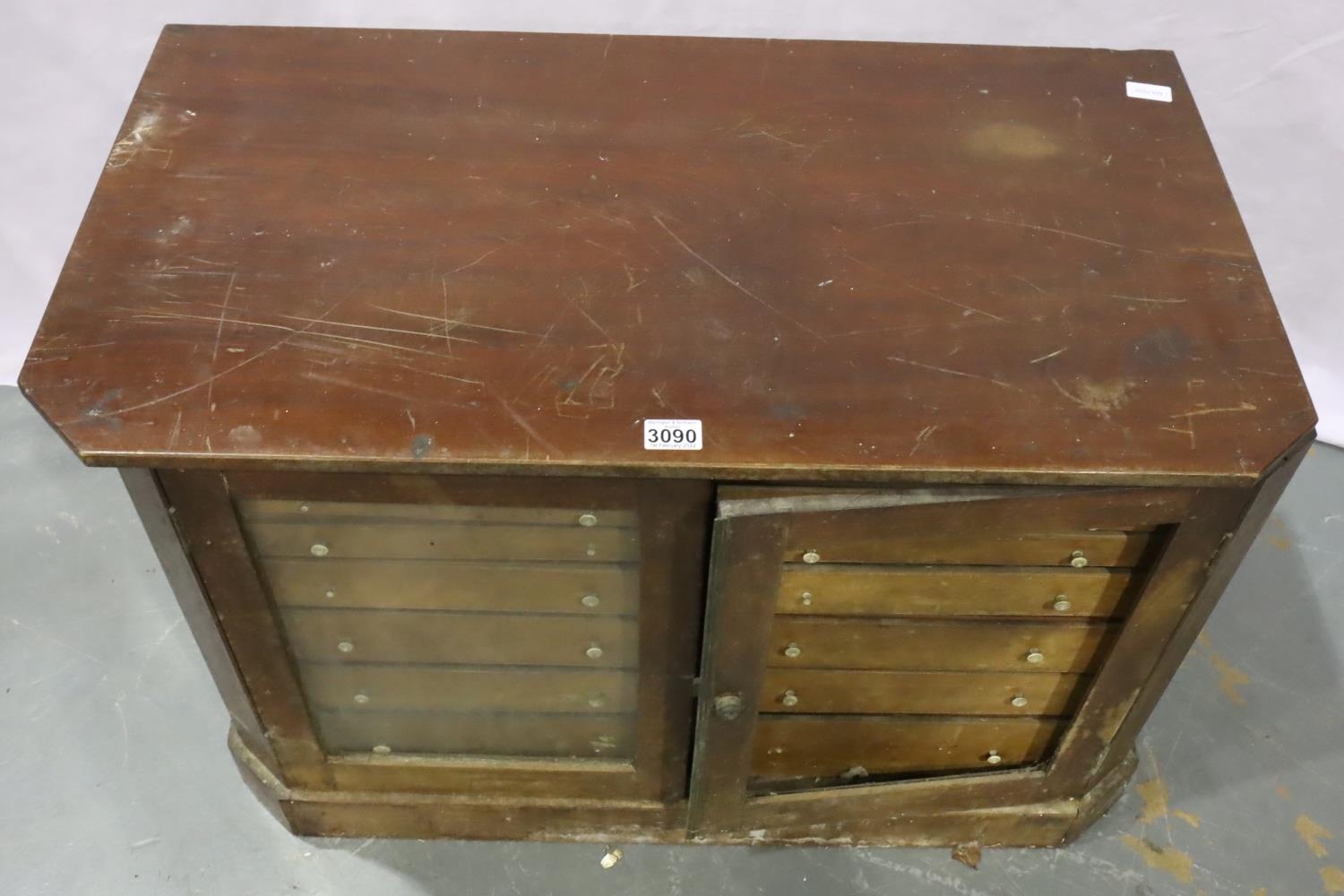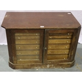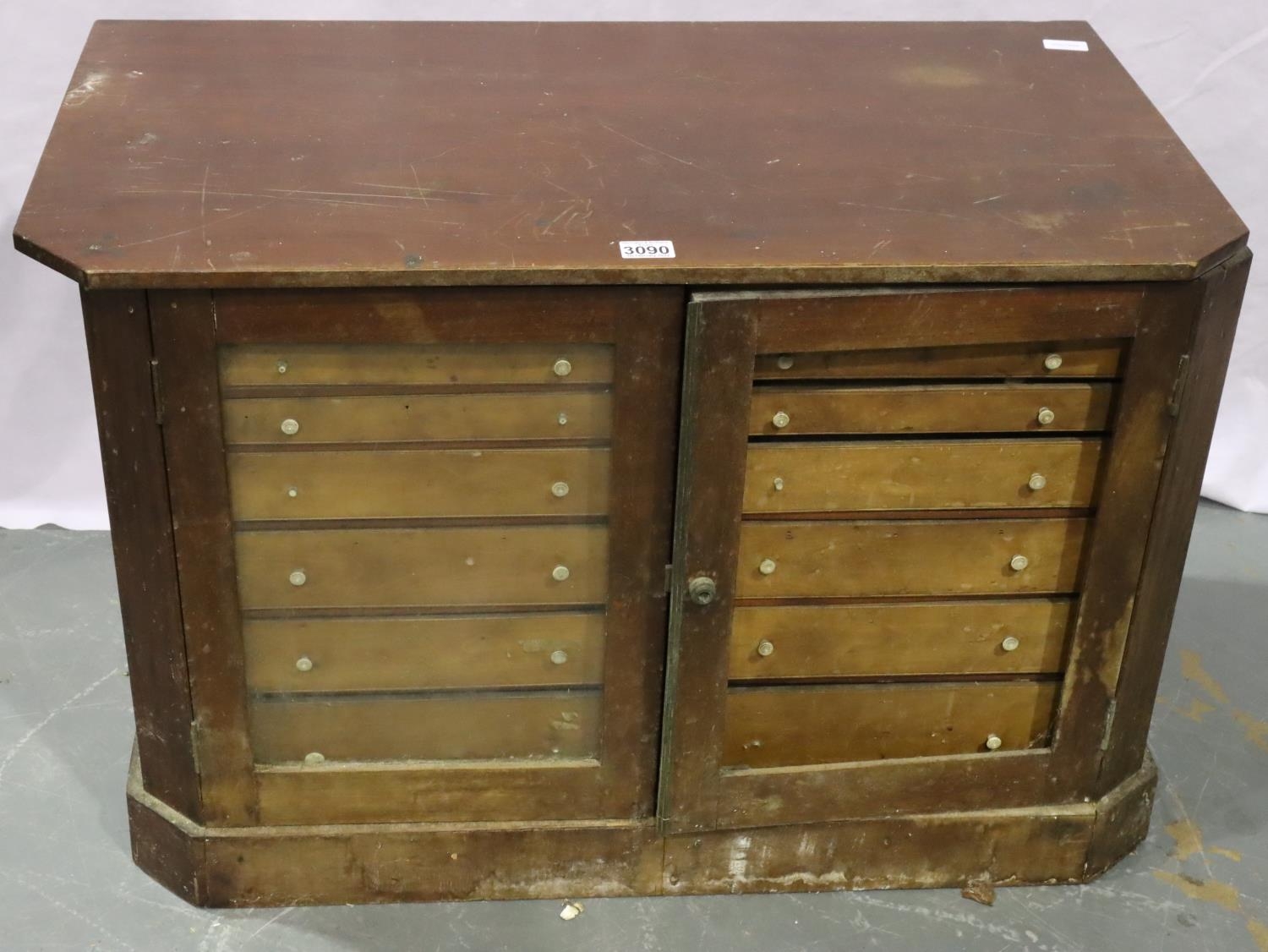 19th century mahogany and walnut specimen cabinet of fourteen graduated drawers enclosed behind two cupboard doors, for restoration, 91 x 49 x 62 cm H. Not available for in-house P&P, contact Paul O'Hea at Mailboxes on 01925 659133