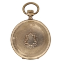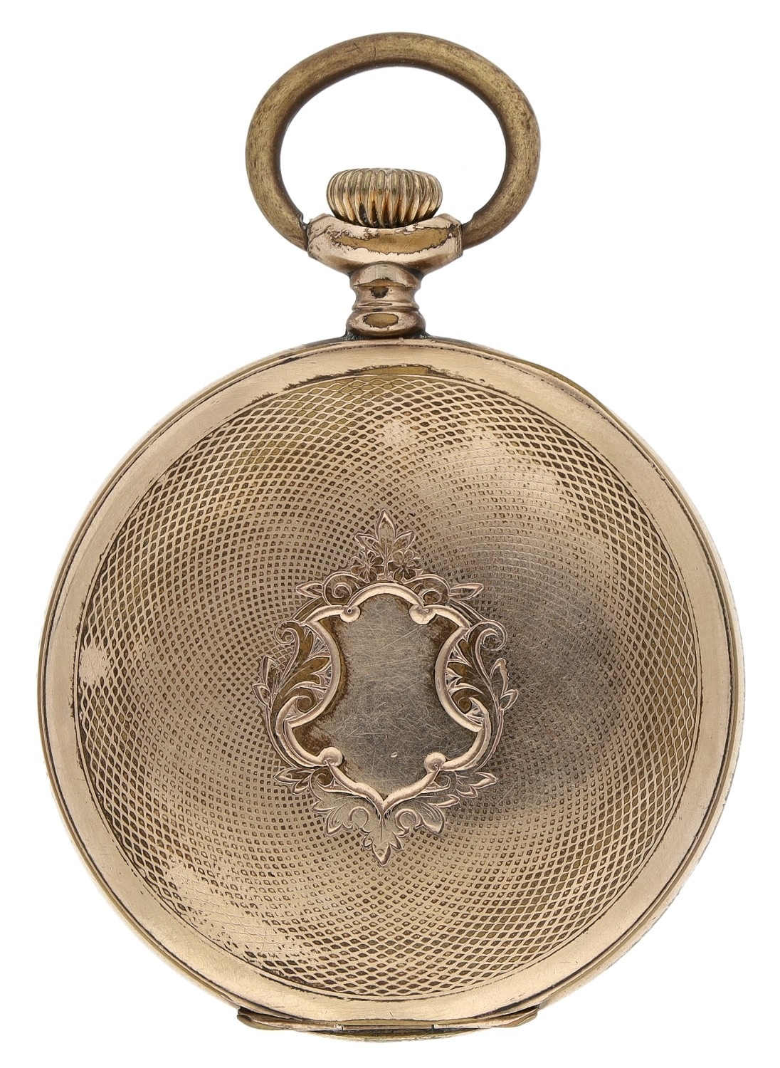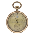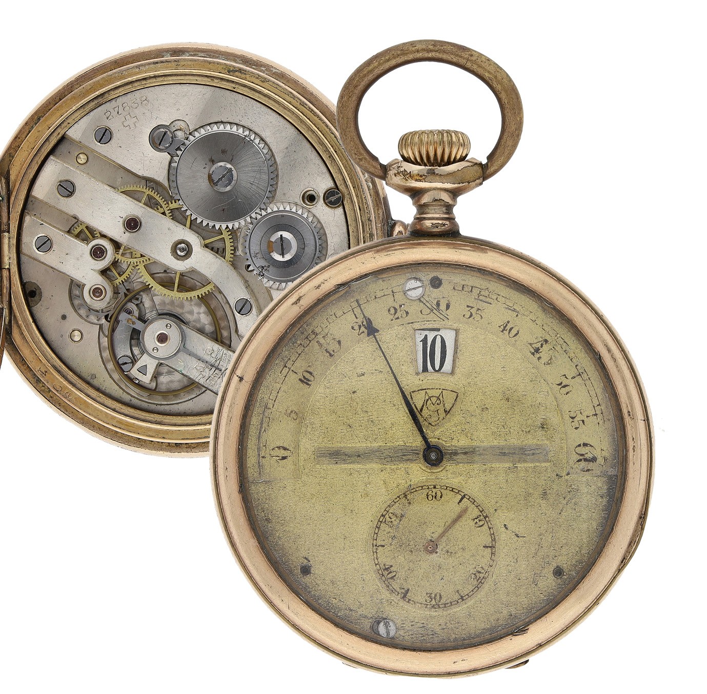 Modernista for Cigarrillos Excelsior digital 'Jump Hour' gold plated lever dress pocket watch, bar lever movement, no. 27838 with compensated balance and regulator, hinged cuvette inscribed 'Modernista Patent', stamped engine turned dial with hour aperture, subsidiary seconds, sixty minute track and retrograde minute hand, within a stamped engine turned case with engraved cartouche, 50mm