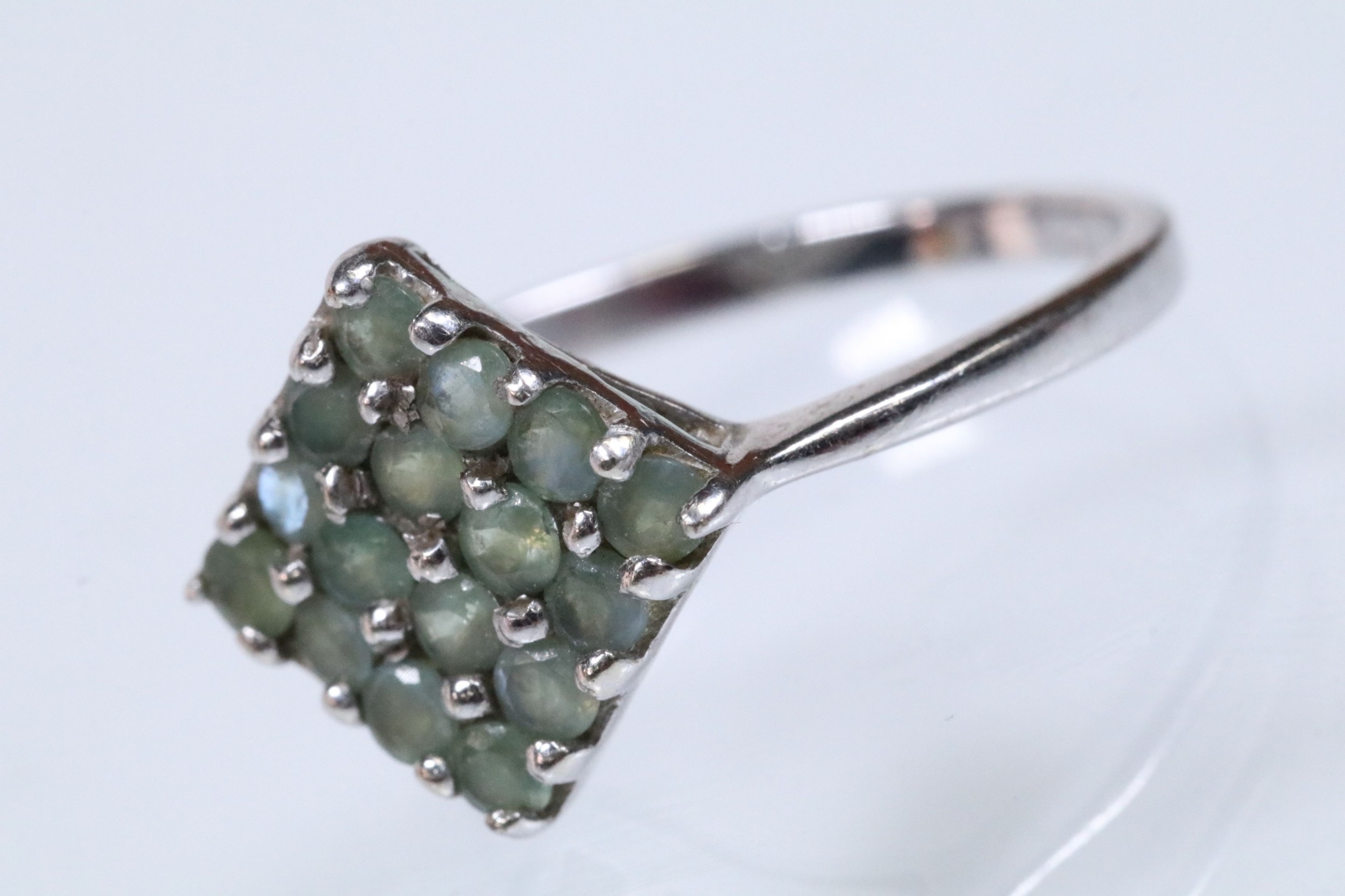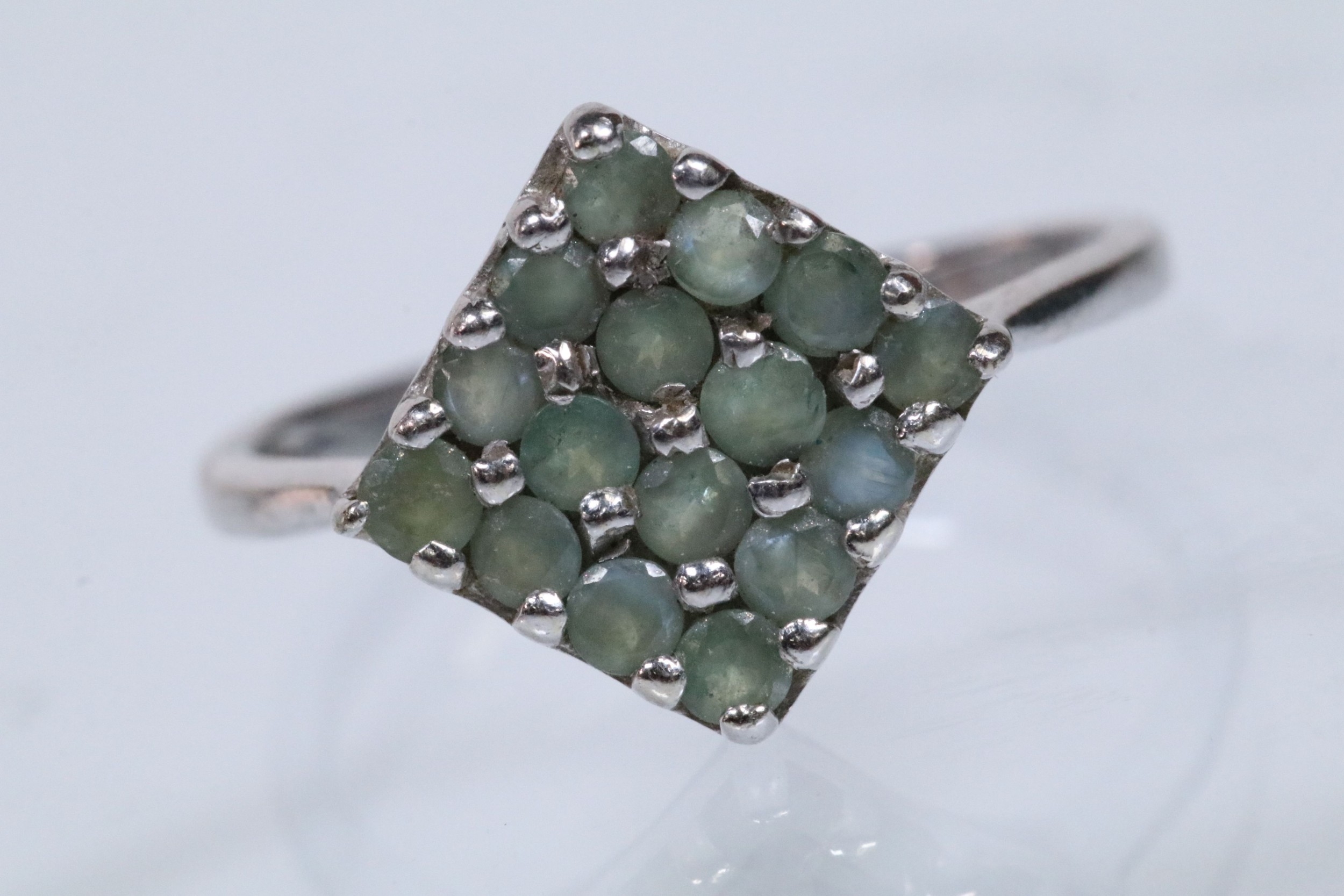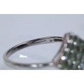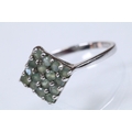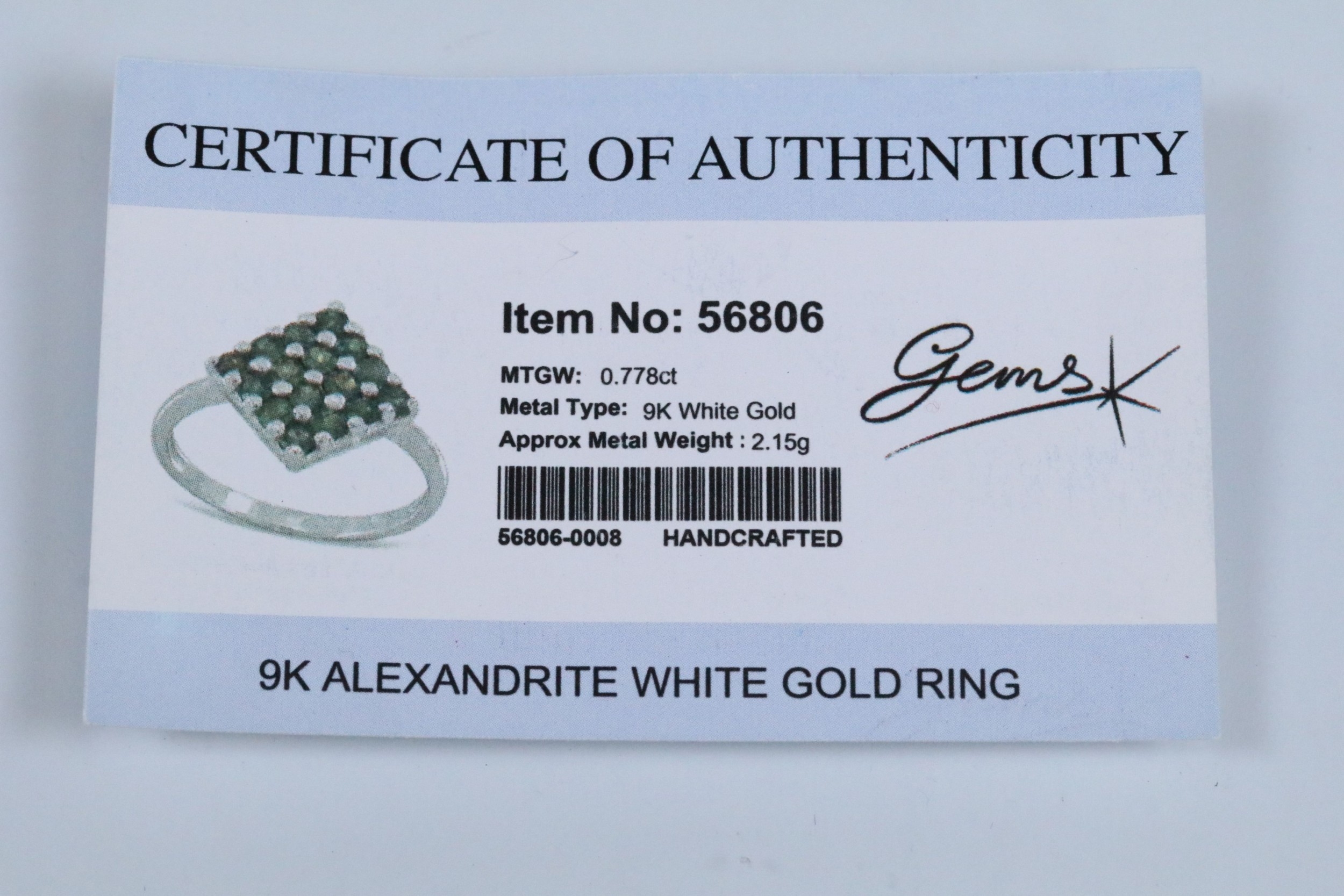 9ct white gold alexandrite cluster ring set with a diamond shaped cluster of round cut alexandrite stones. Hallmarked Birmingham 2006. Size N.5. With Gems TV certificate.