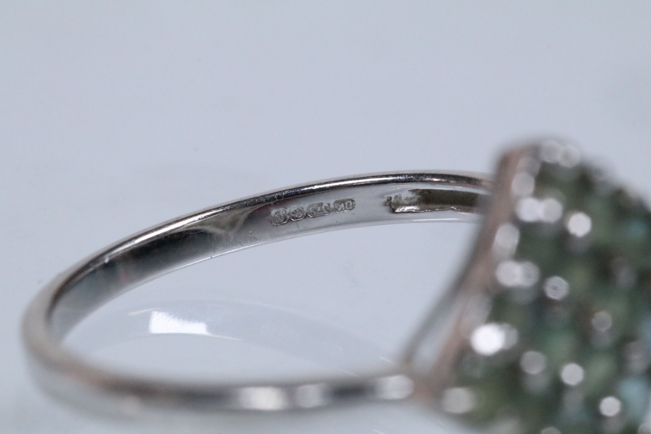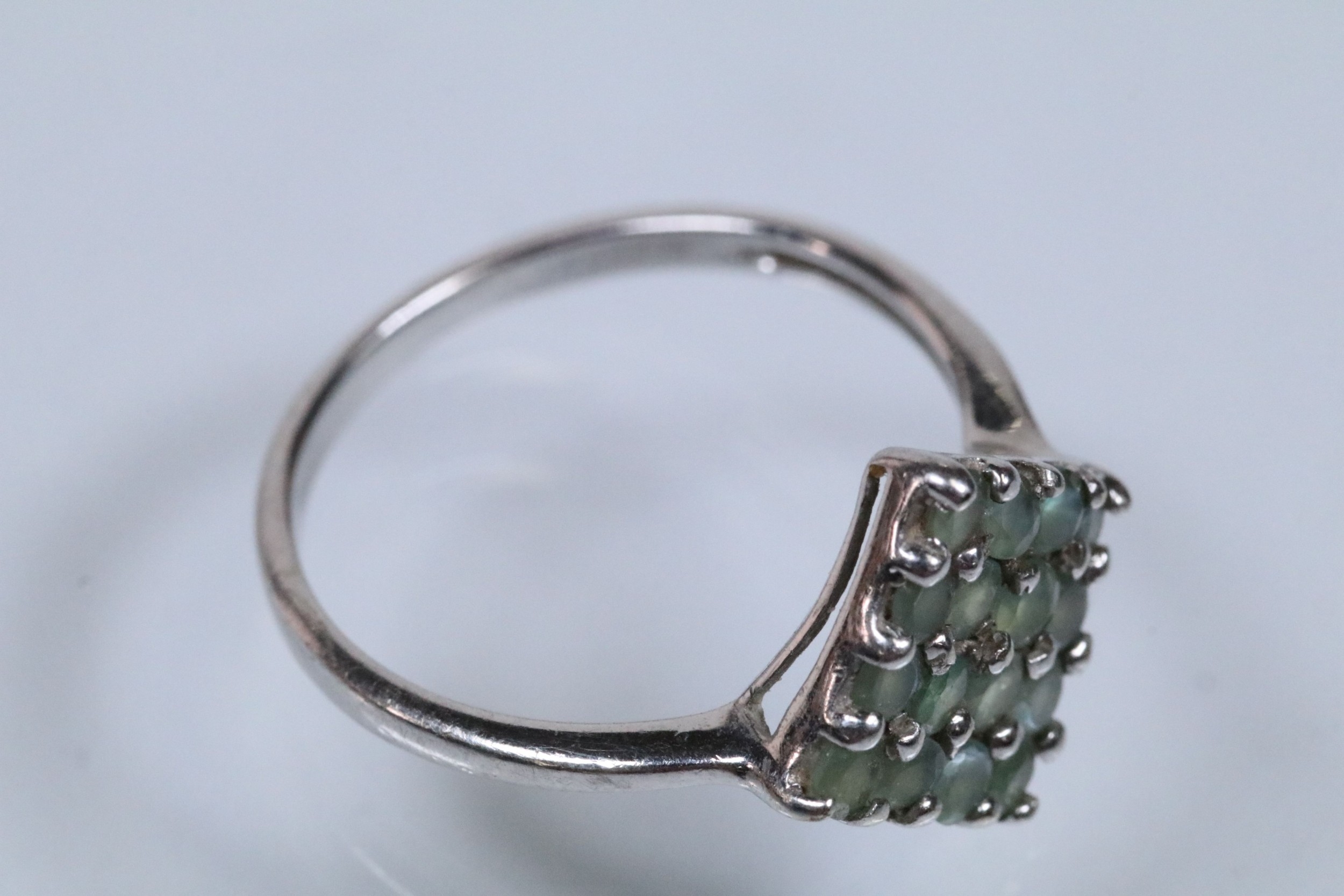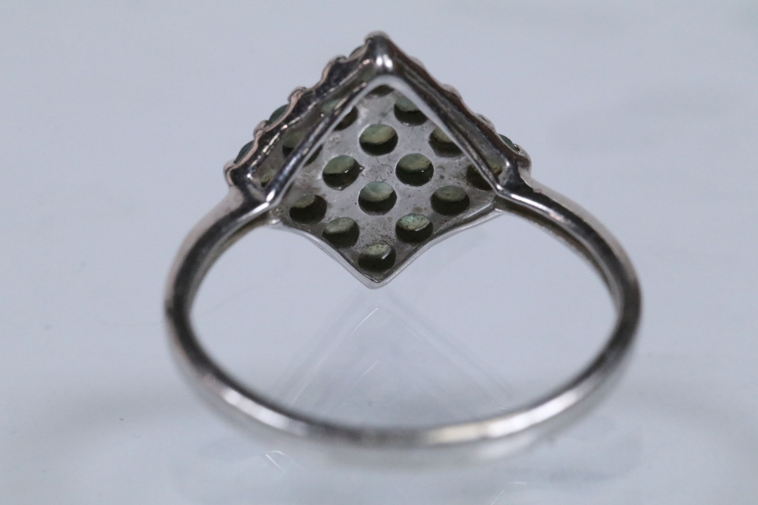 9ct white gold alexandrite cluster ring set with a diamond shaped cluster of round cut alexandrite stones. Hallmarked Birmingham 2006. Size N.5. With Gems TV certificate.