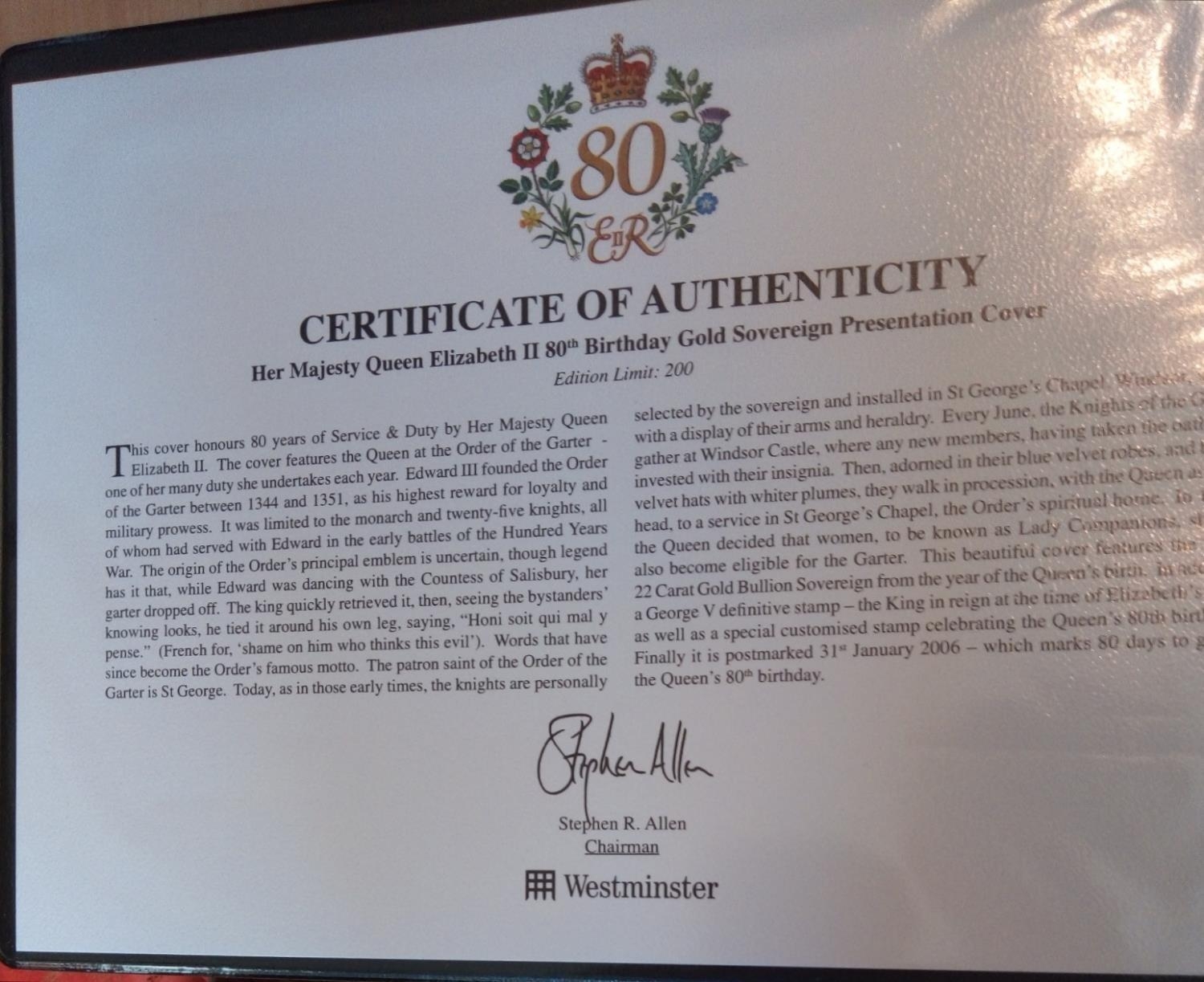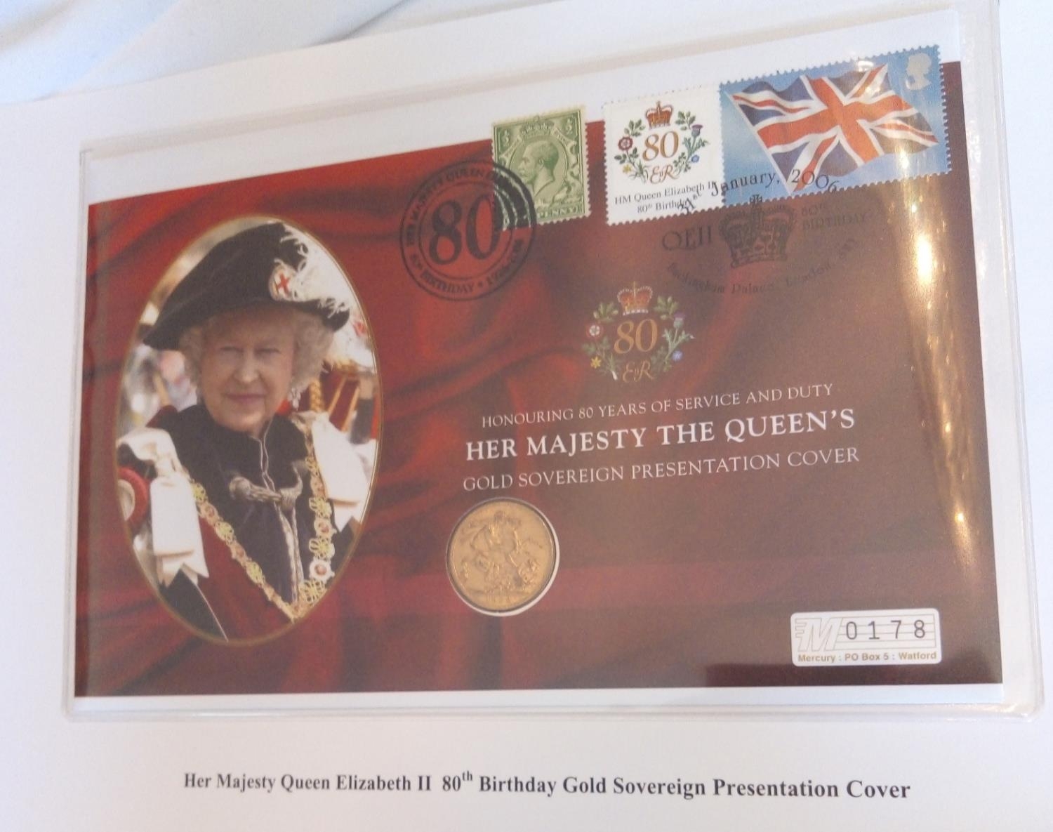 A 22CT GOLD FULL SOVEREIGN COIN COVER, DATED 1926, HER MAJESTY QUEEN ELIZABETH II 80TH BIRTHDAY