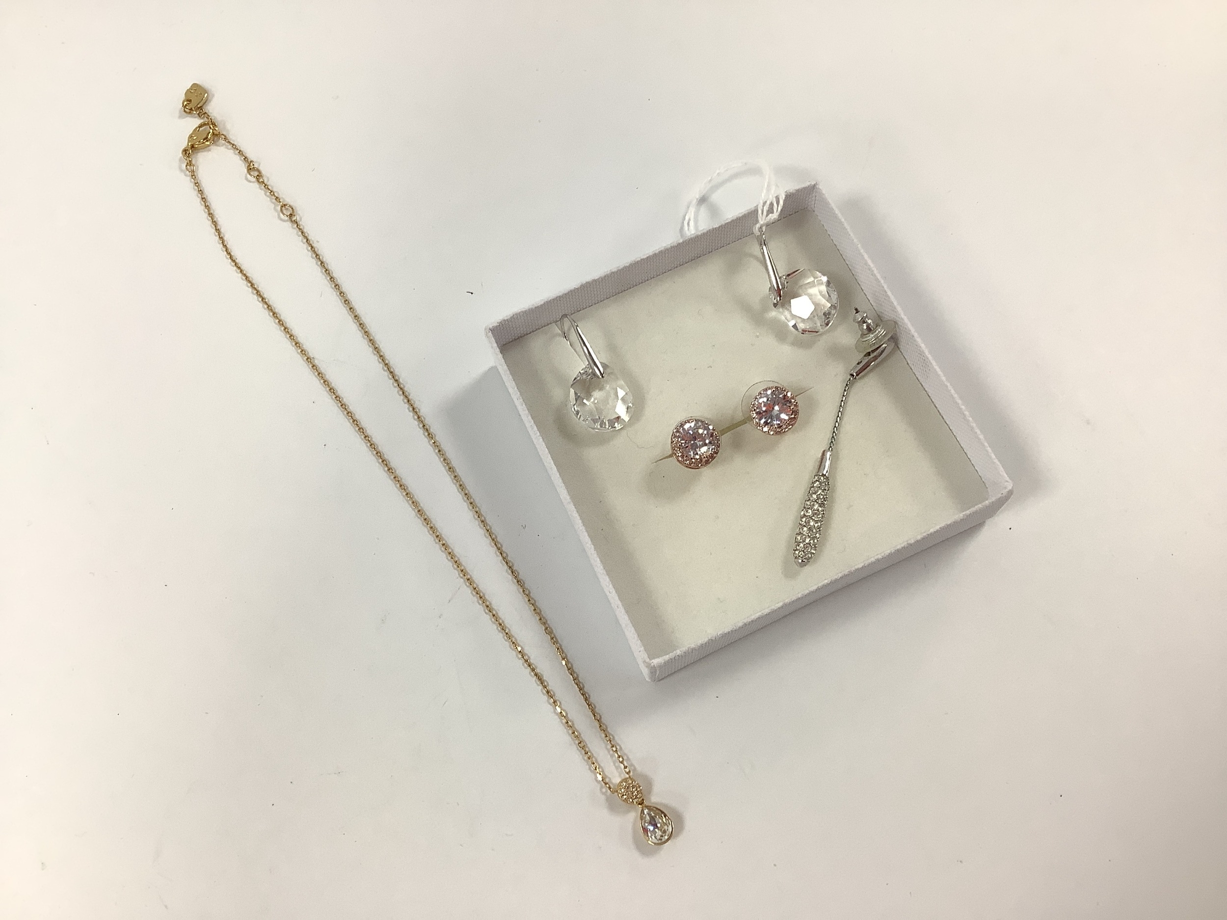 Swarovski; A Pair of Faceted Drop Earrings, to hook fittings, together with a Swarovski teardrop pendant, on a gilt coloured chain, a pair of rose coloured circular cluster earrings, claw set throughout, to post fittings, and a single Swarovski drop earring (odd). [685256]