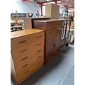 A teak retro chest of drawers, oak tallboy and a display cabinet